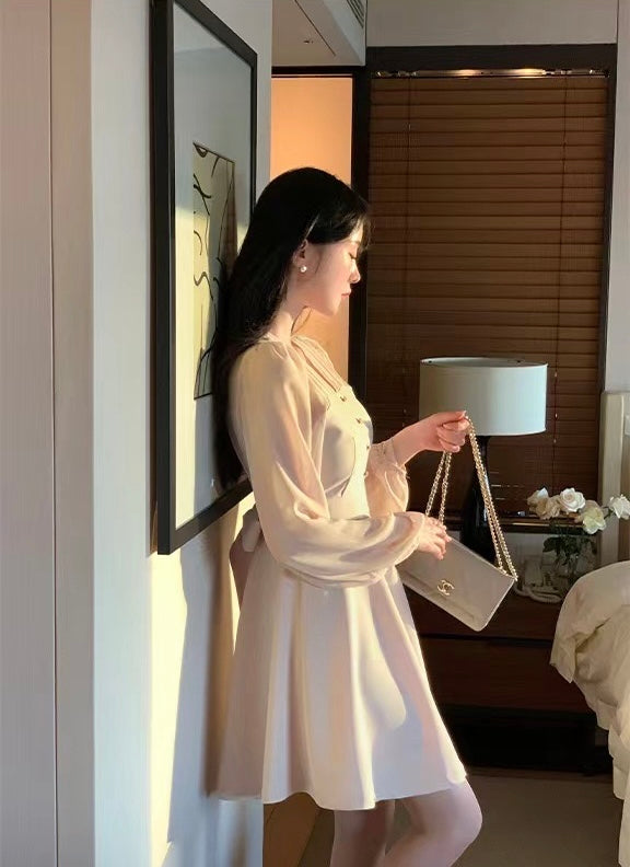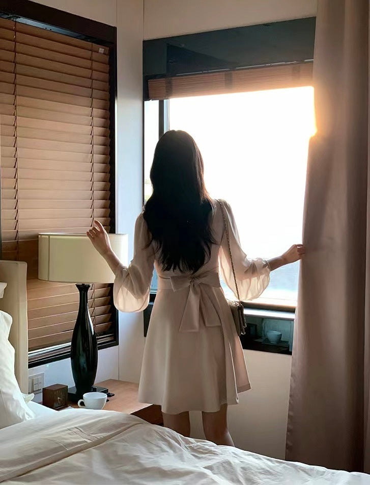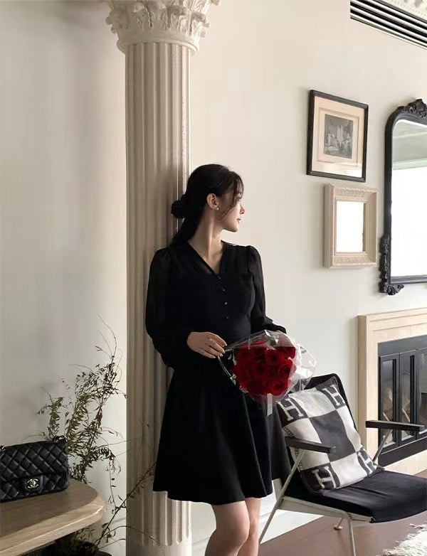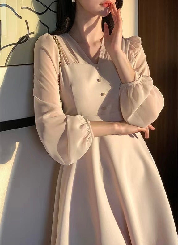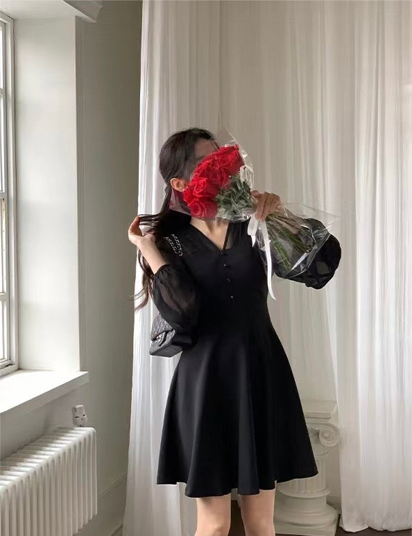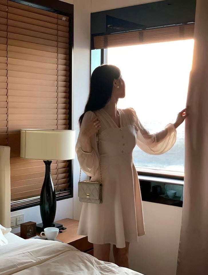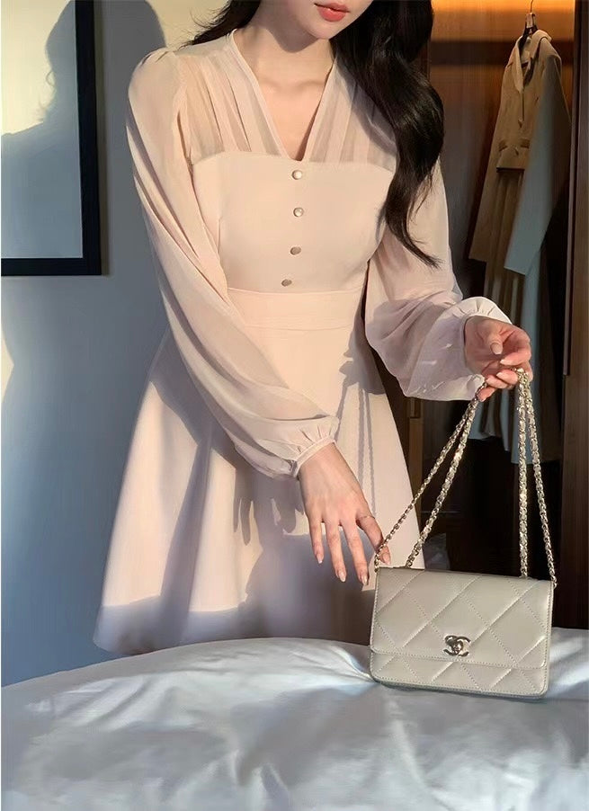 V-neck Single-breasted Mesh Panel Dress