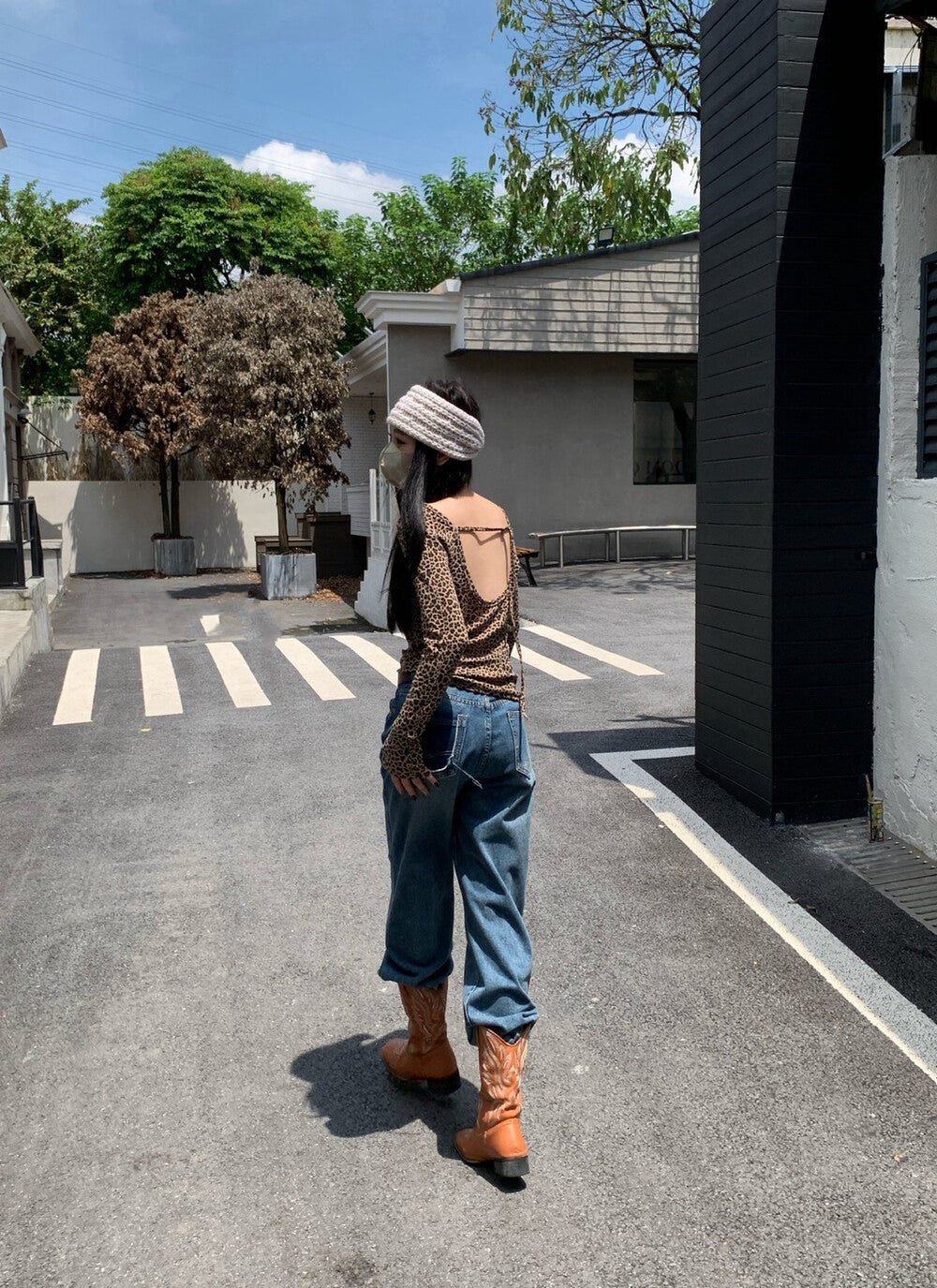 American Style Leopard Print Backless Long Sleeve T-Shirt