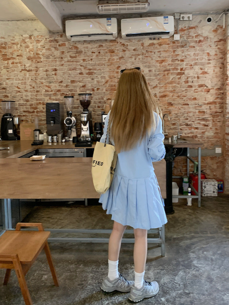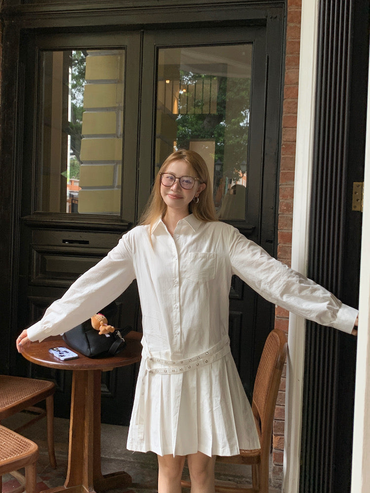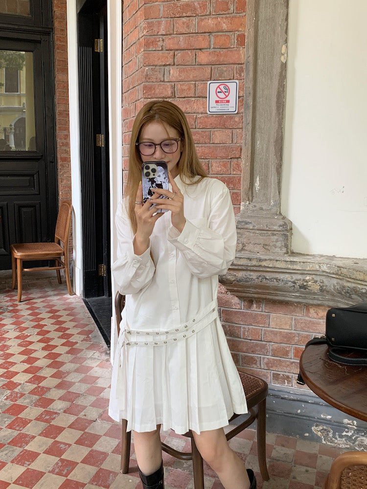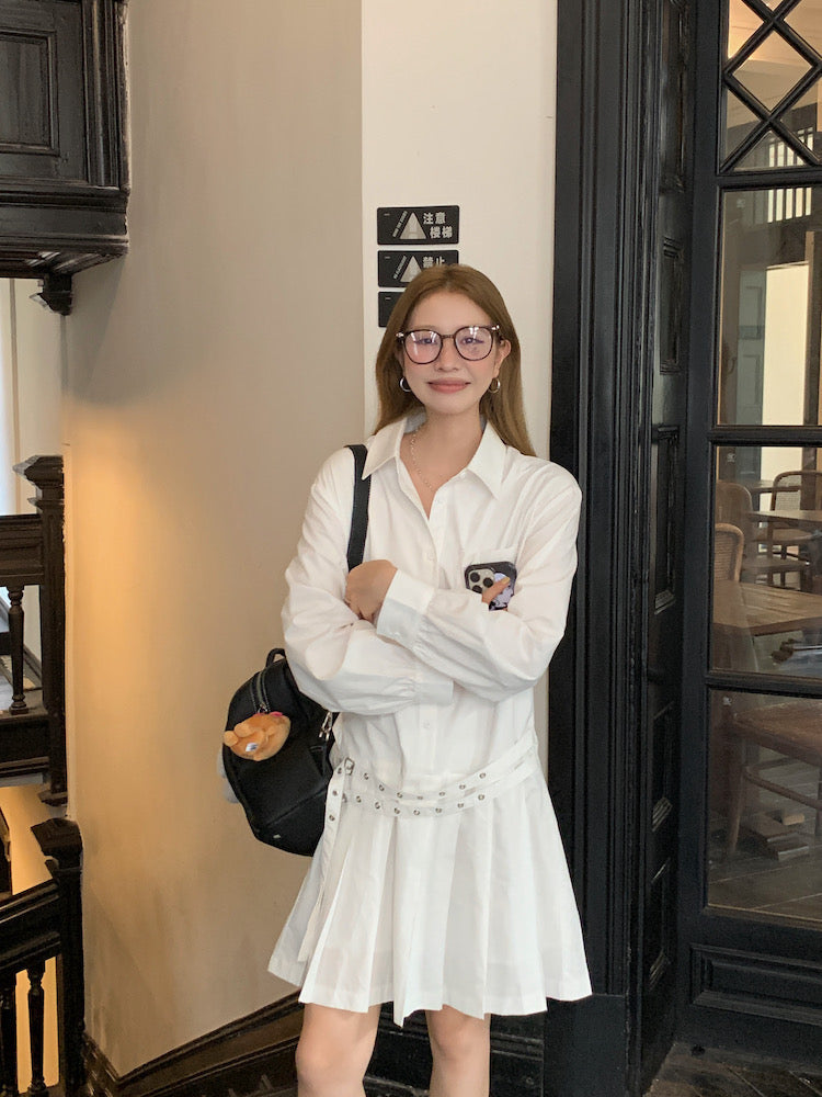 Double Belt Loose Pleated Shirt Dress
