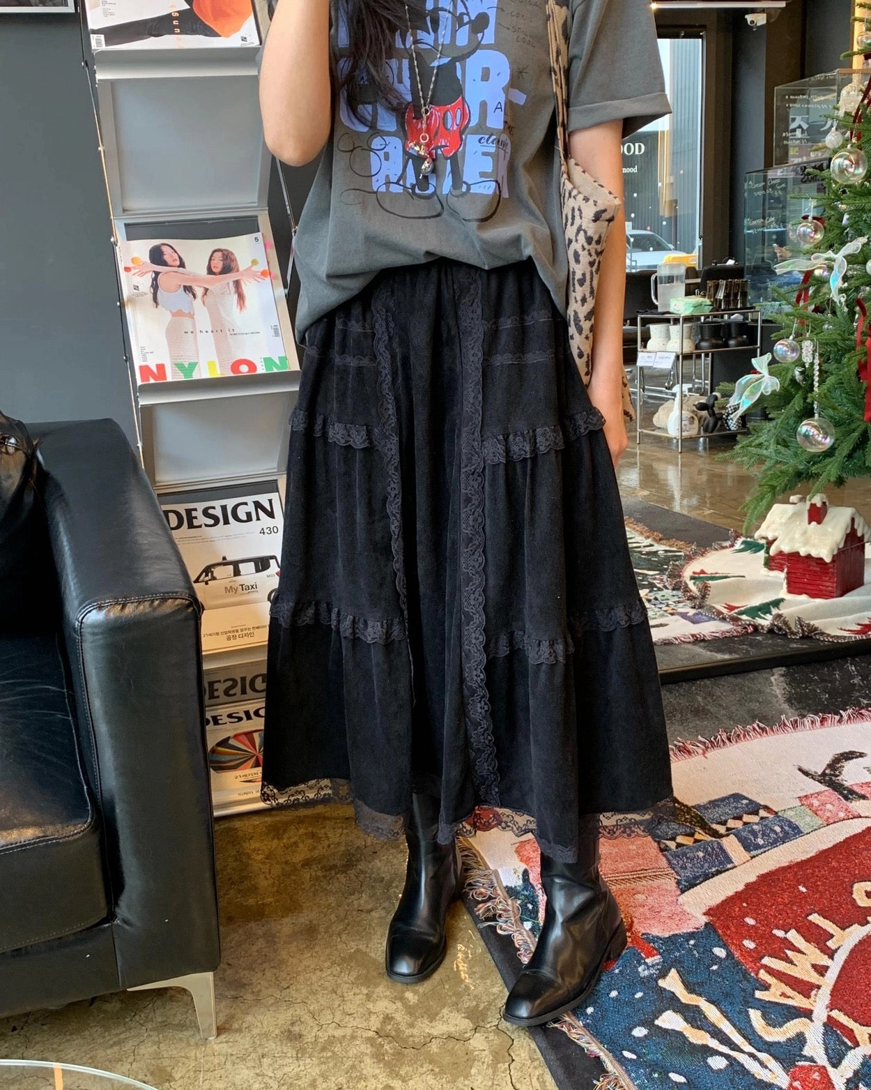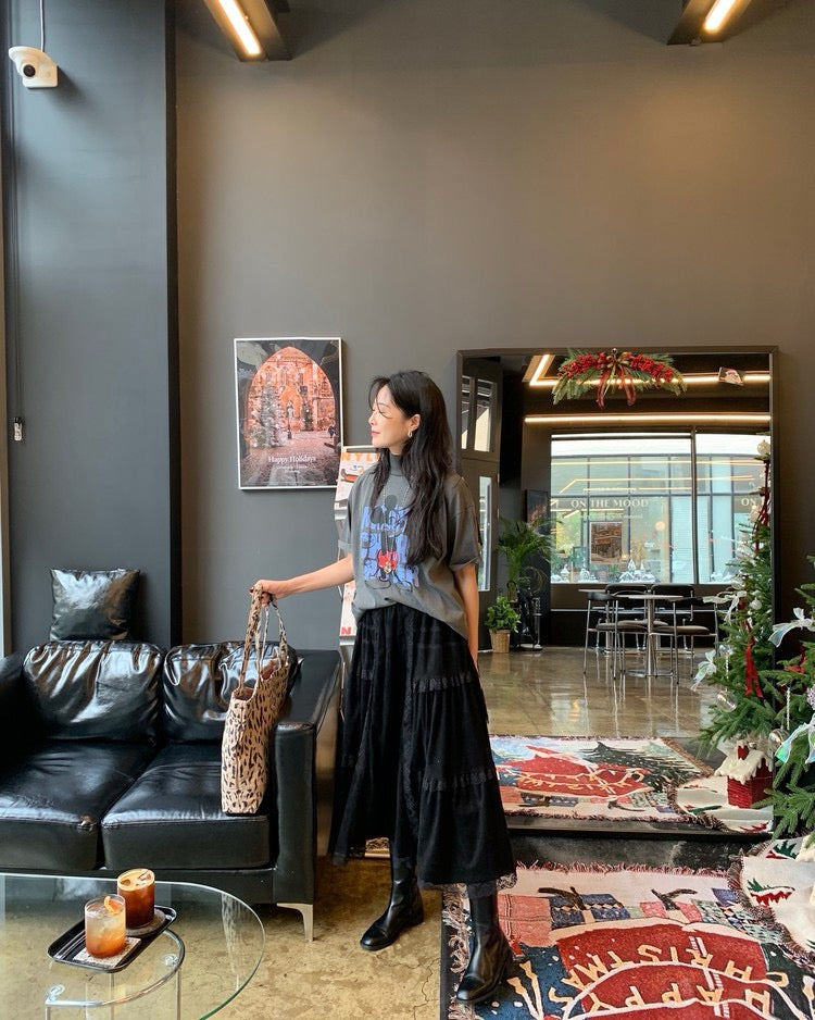 Suede Patchwork Lace Trim Skirt