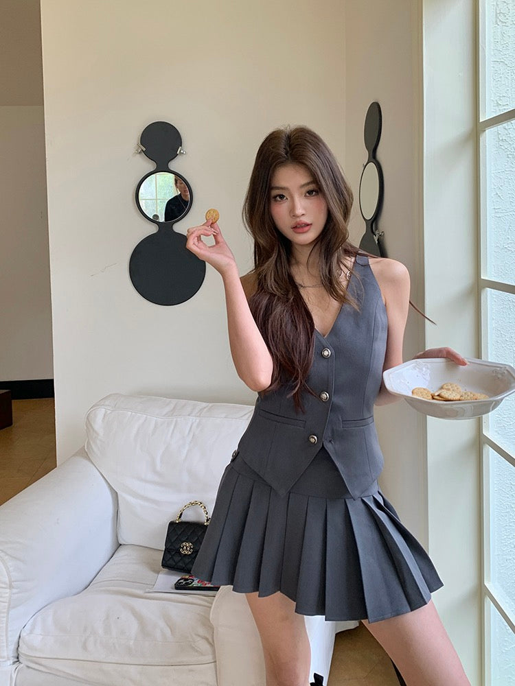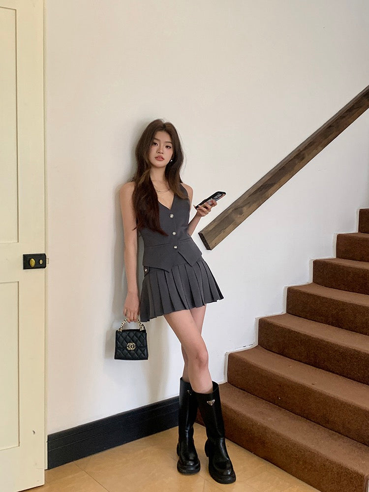 Vintage Preppy Style Vest + Pleated Skirt Set
