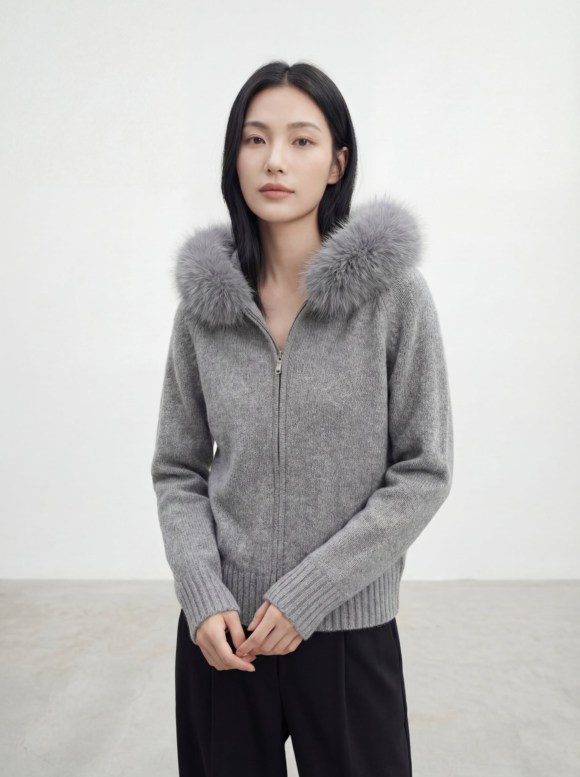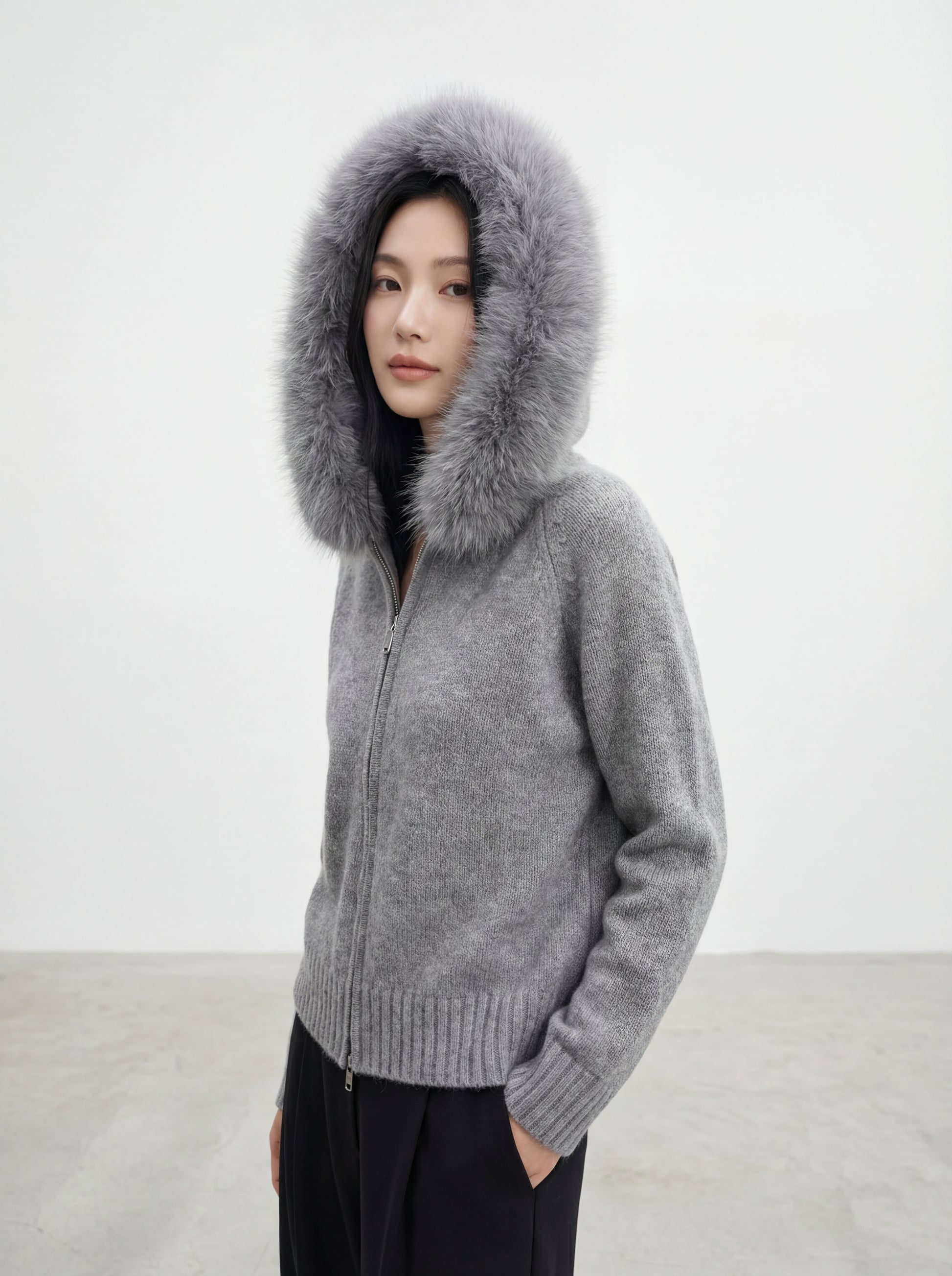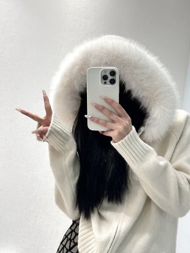 Knit Sweater with Large Fur-Trimmed Hood