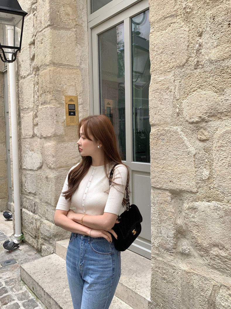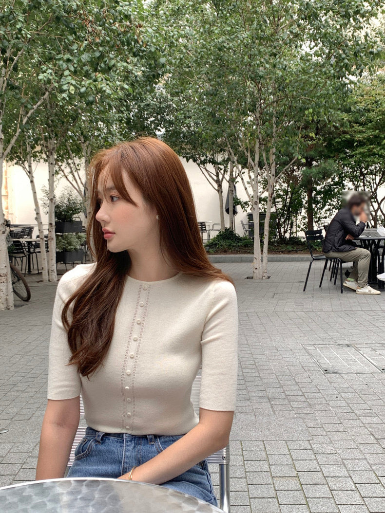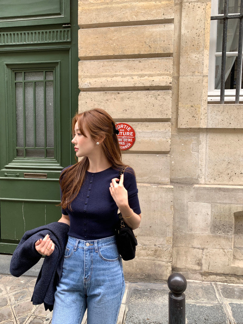 Crew Neck Slim Fit Knit Top with Button Detailing