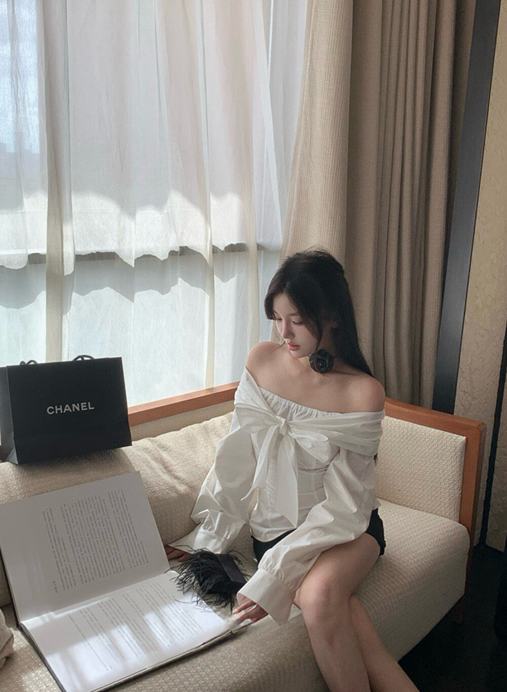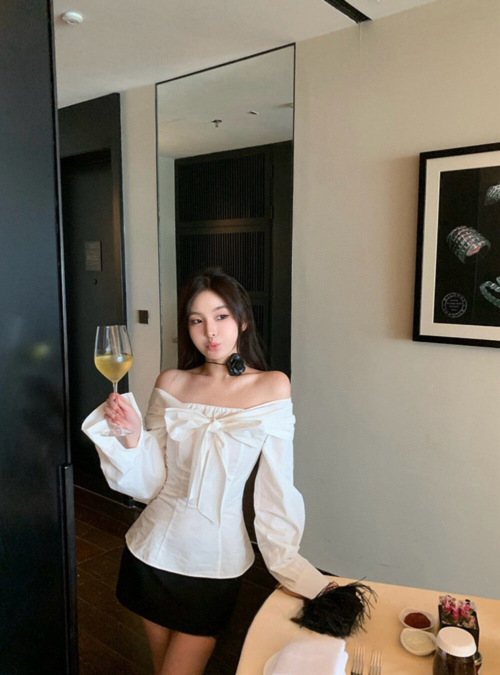 Off-the-shoulder Long Sleeve Blouse with Bow Tie