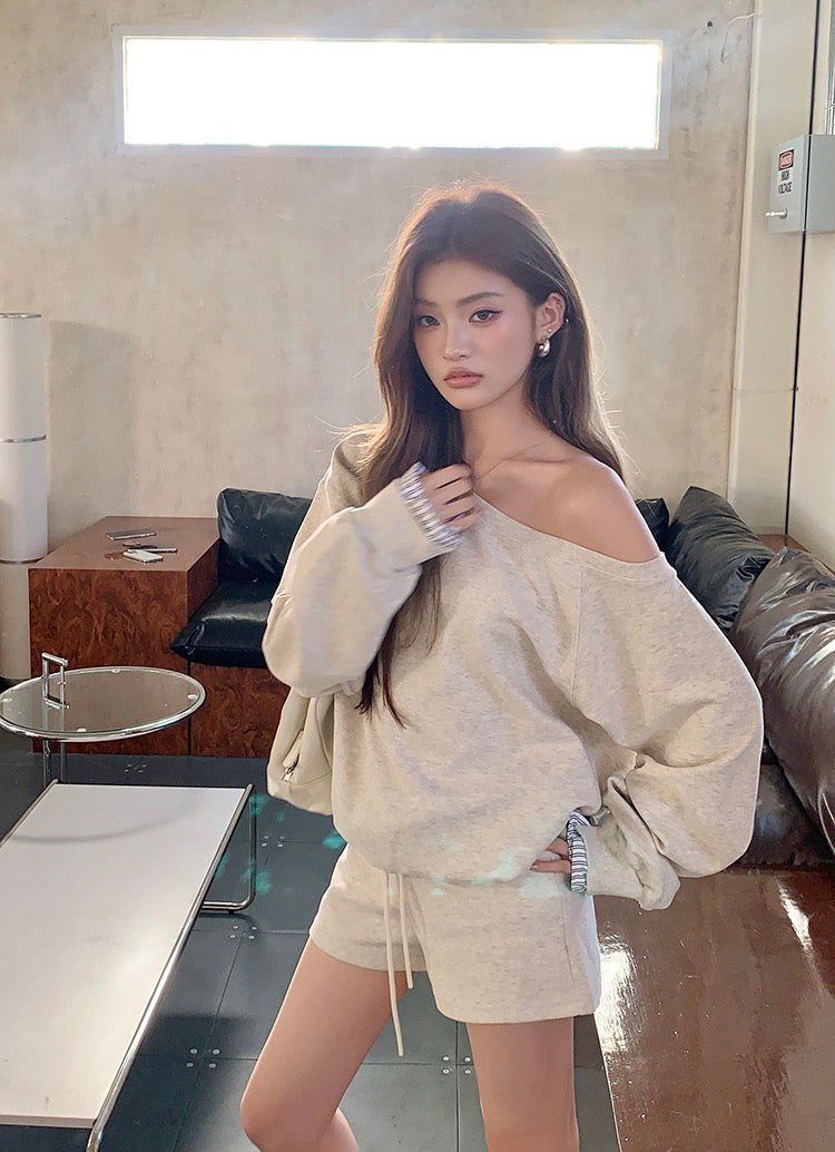 Lazy Off-Shoulder Sweatshirt + Color-Block Shorts Set