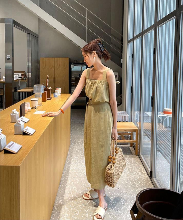 Square Neck Strap Top + High Waist Slit Tie Skirt Set