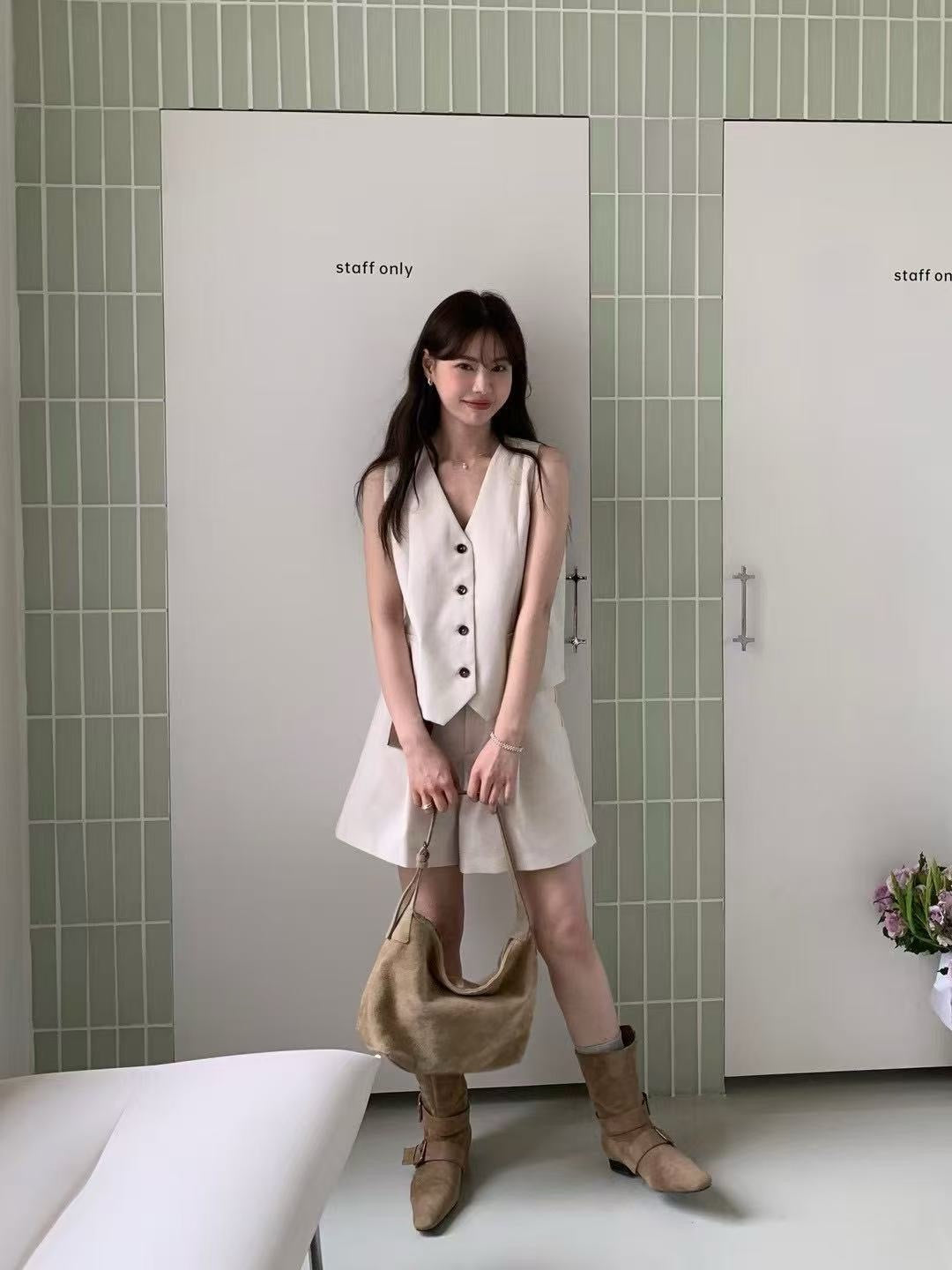 V-neck single-breasted vest + high-waisted shorts set