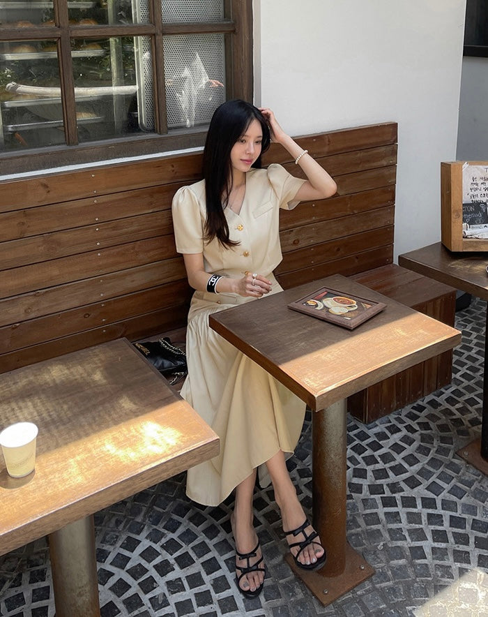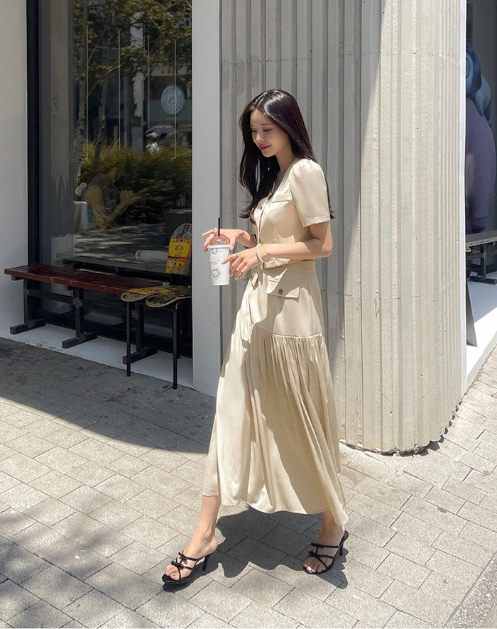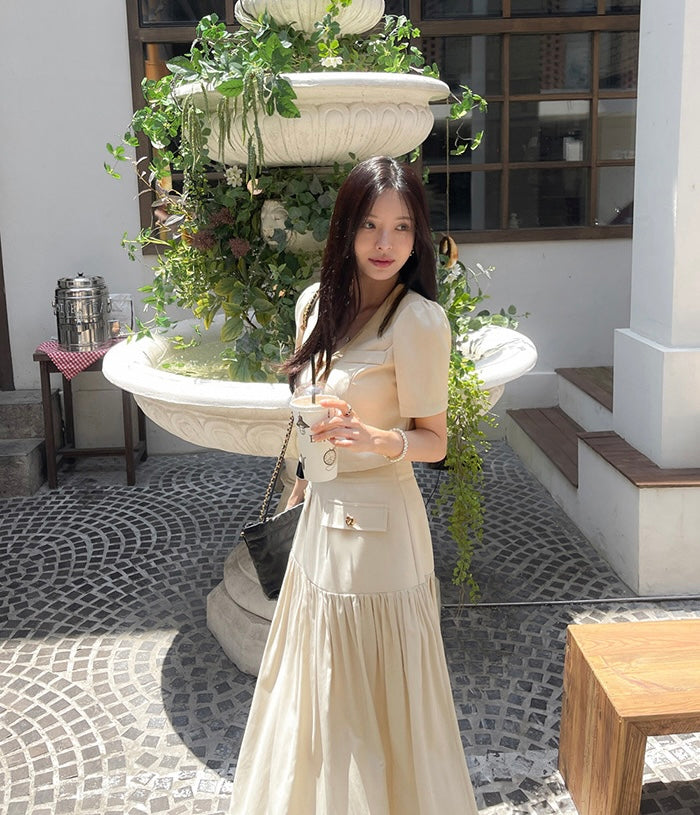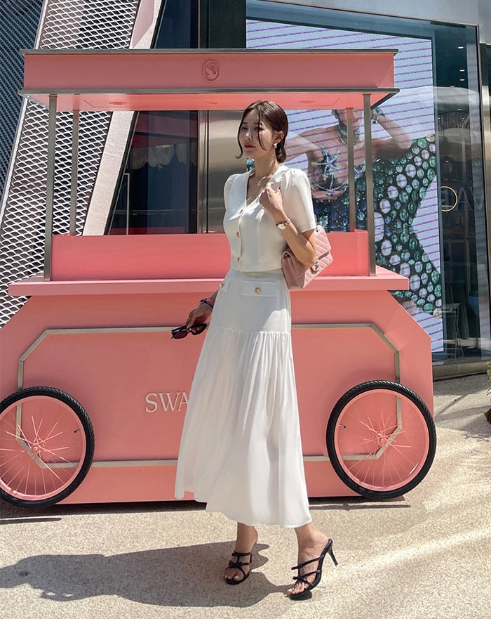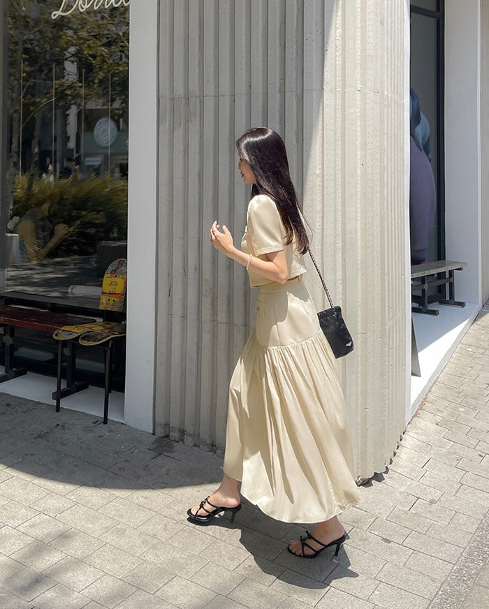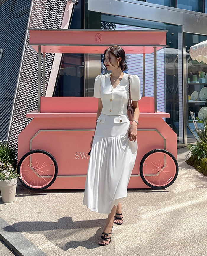 The skirt hem is adorned with ruffled edges, adding a light and layered feel