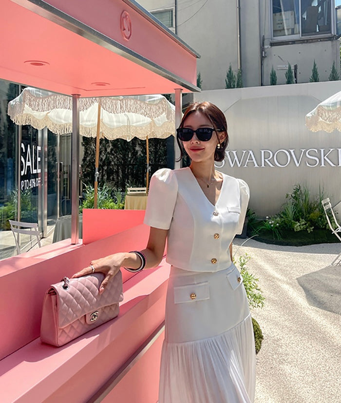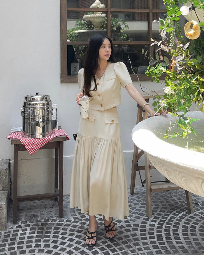 Chanel-inspired Single-breasted Jacket + Patchwork Ruffled Hem Skirt Set