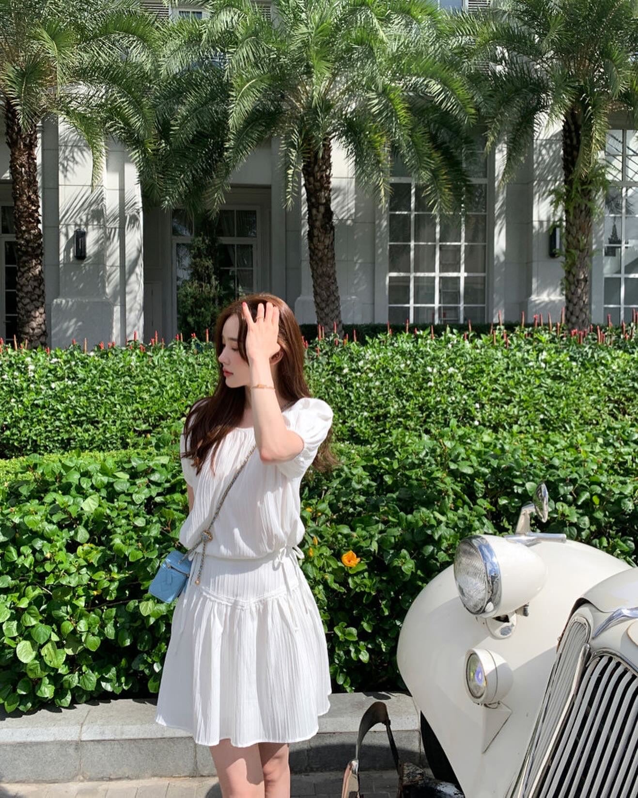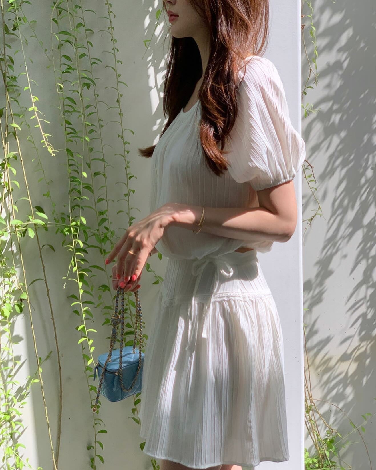 Round Neck Lace Patchwork Puff Sleeve + Short Skirt Set