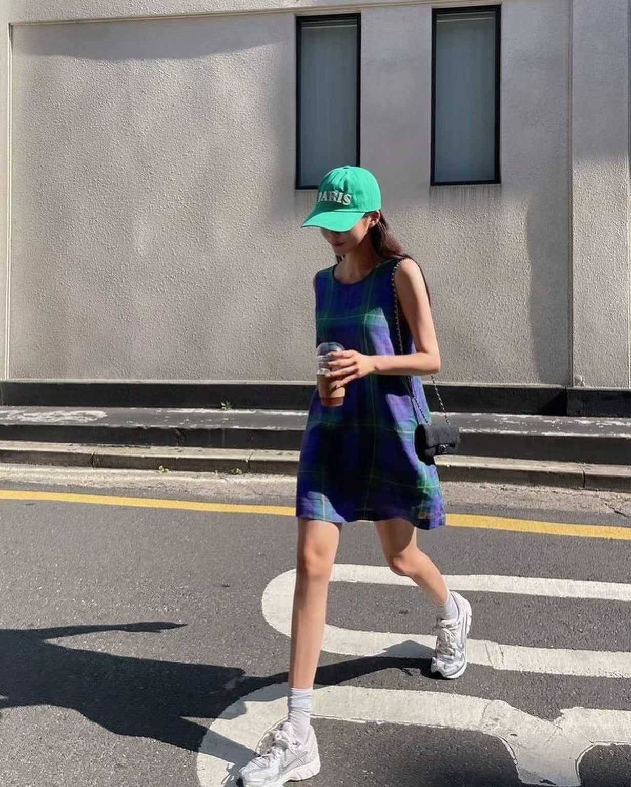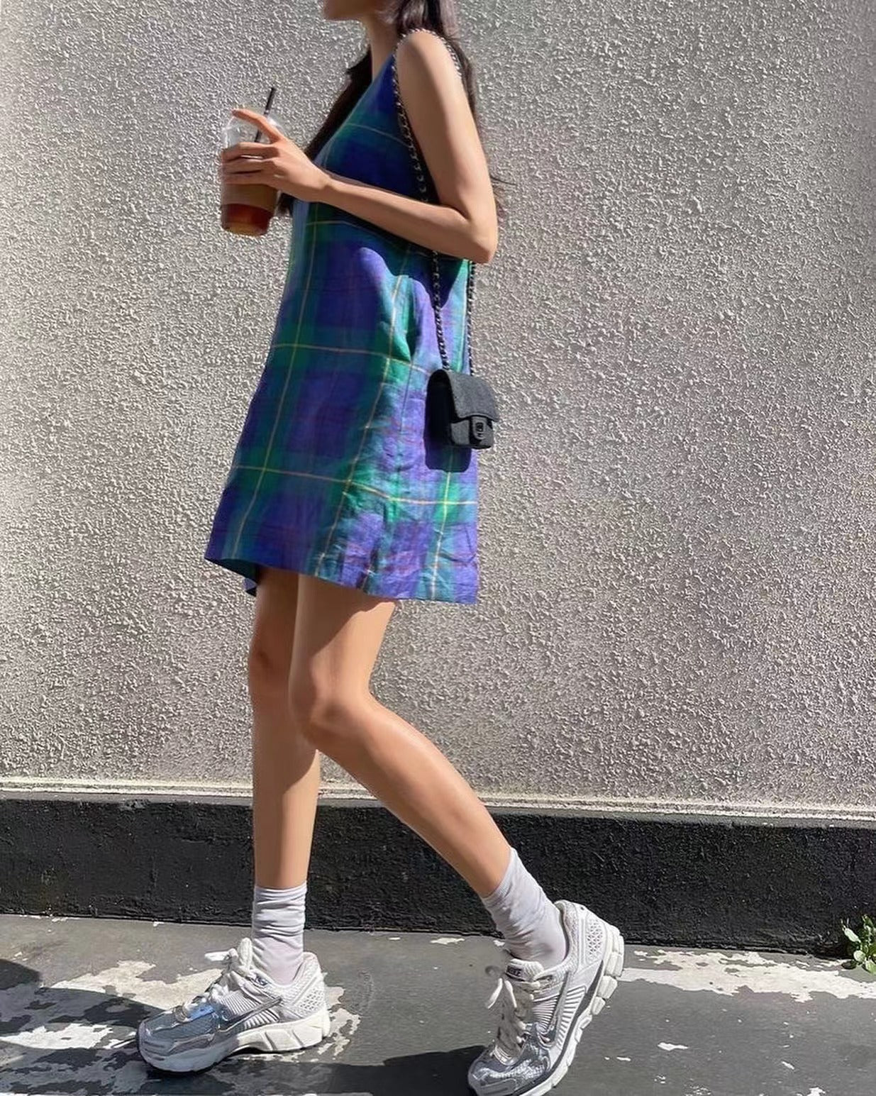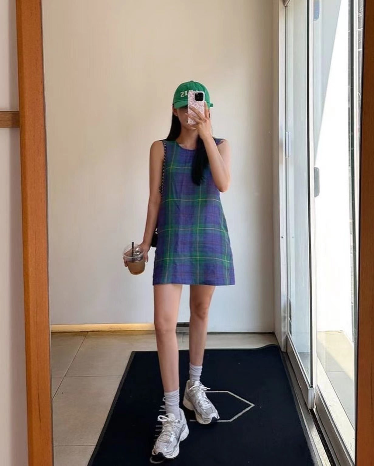 青緑の冷色調のチェック柄💚めっちゃ肌を白くみせます!!💙ラウンドネックのショートドレスの形爽やかなタンクトップと合わせて✨綿混紡生地素材:100%棉混紡サイズ:フリーサイズバスト 90cmドレス丈 84cm*すべての寸法は手作業による測定のため、1〜2cmの誤差が生じる可能性があります。