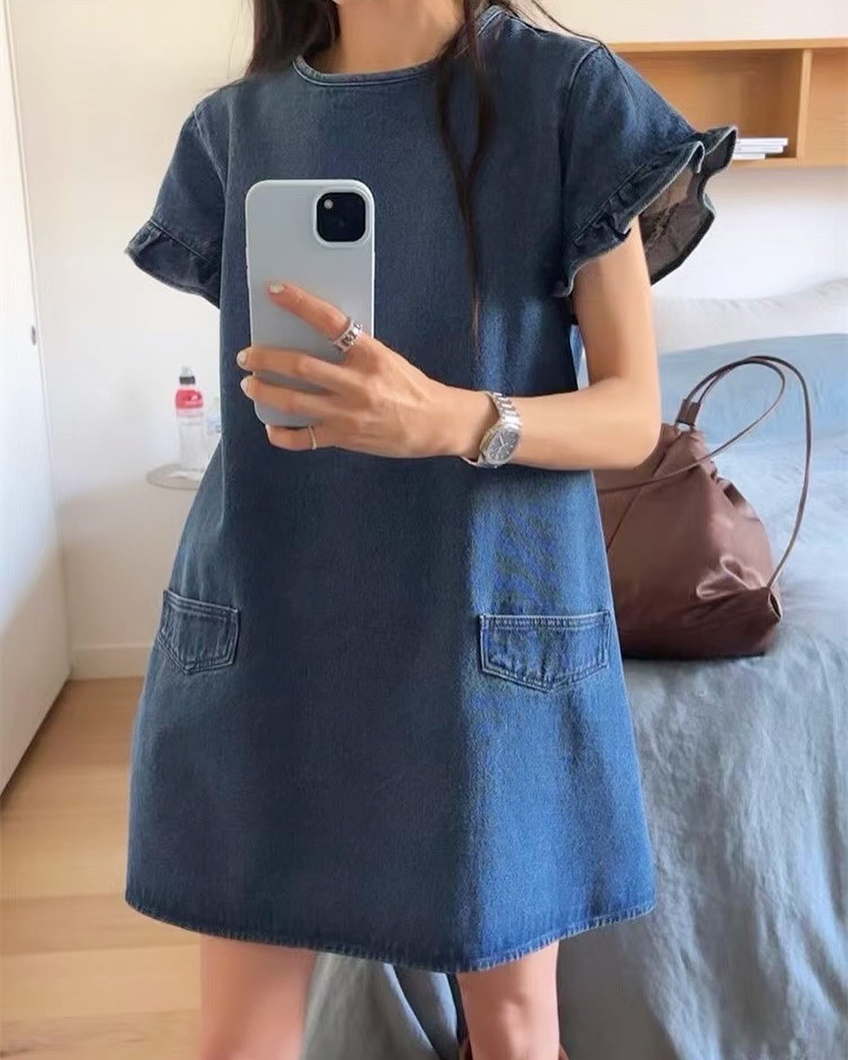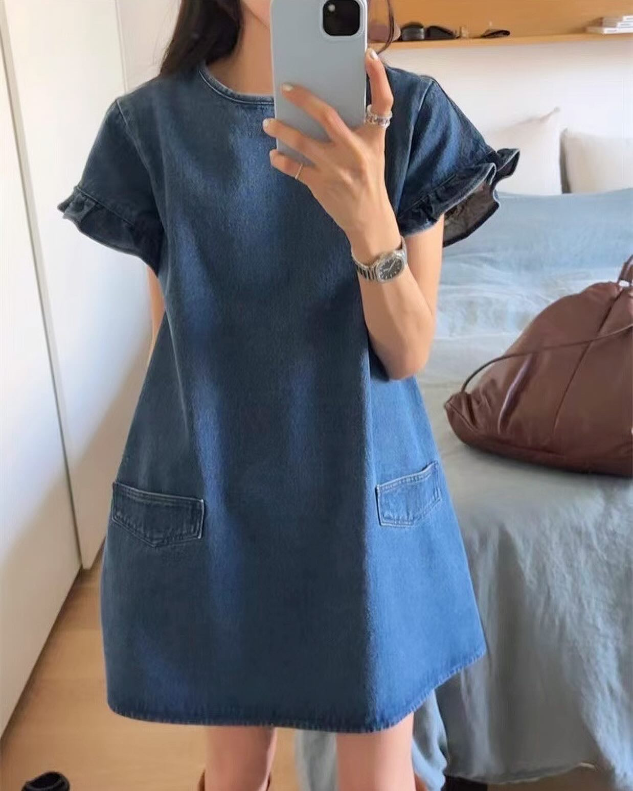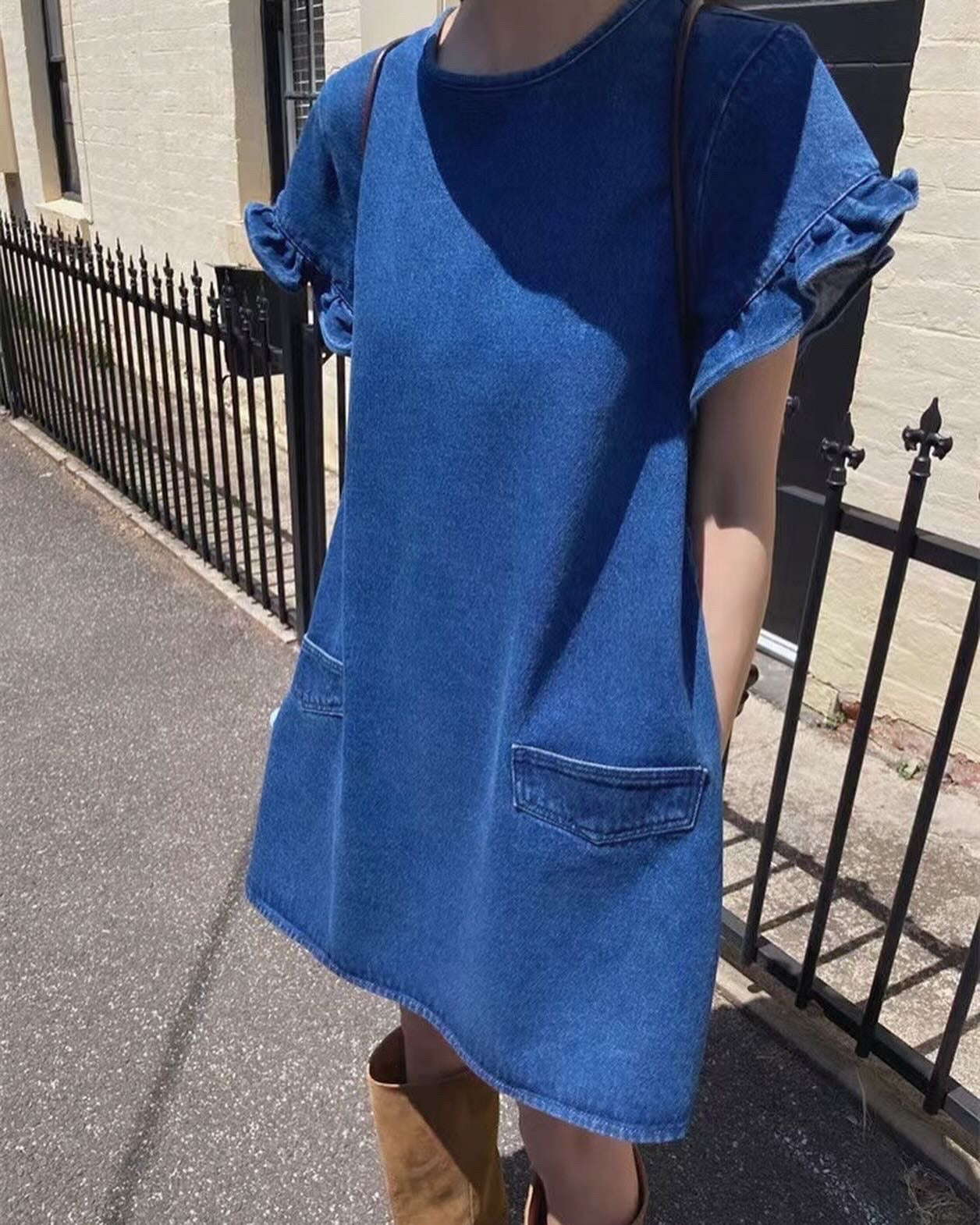 クルーネックフリルスリーブデニムワンピース