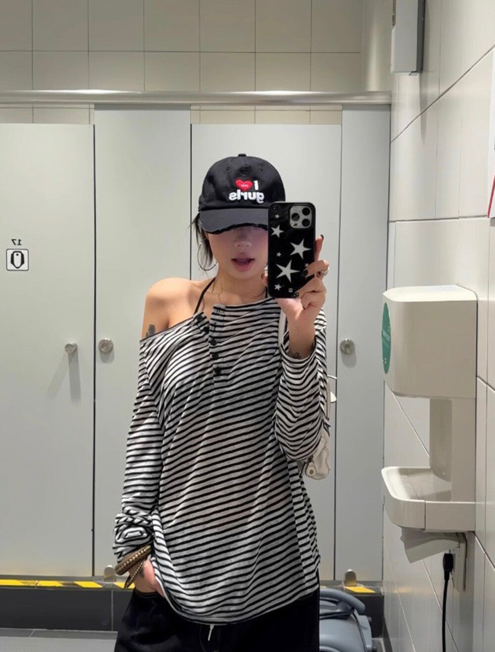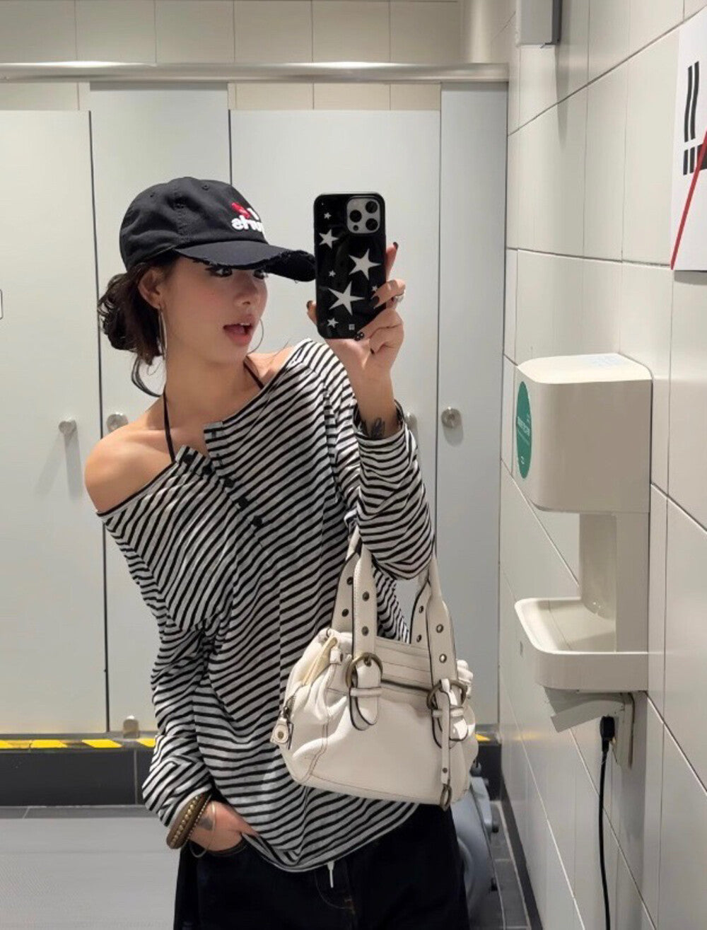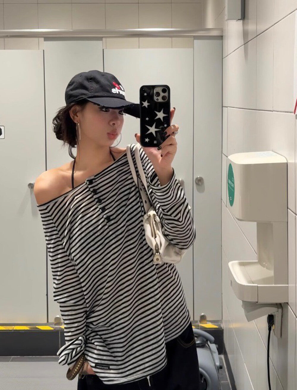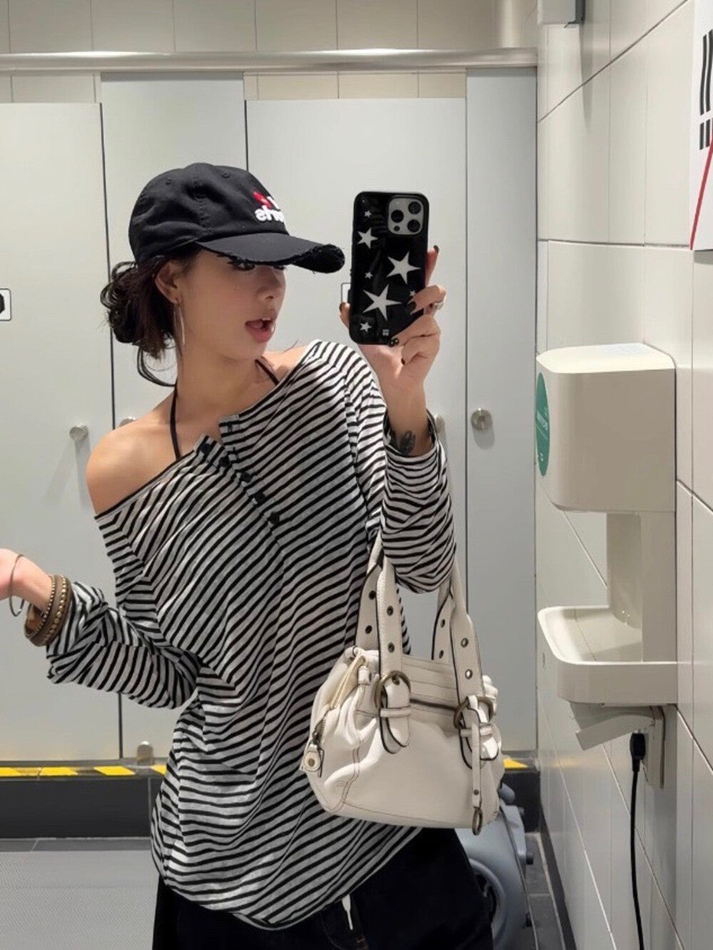 レトロなカラーブロックストライプのアメリカンカジュアル ◼️◻️UVカット素材で紫外線を防ぐネックホルダーでクールなバックスタイル、スリムに見せる夏のお出かけにおしゃれで実用的コットン素材