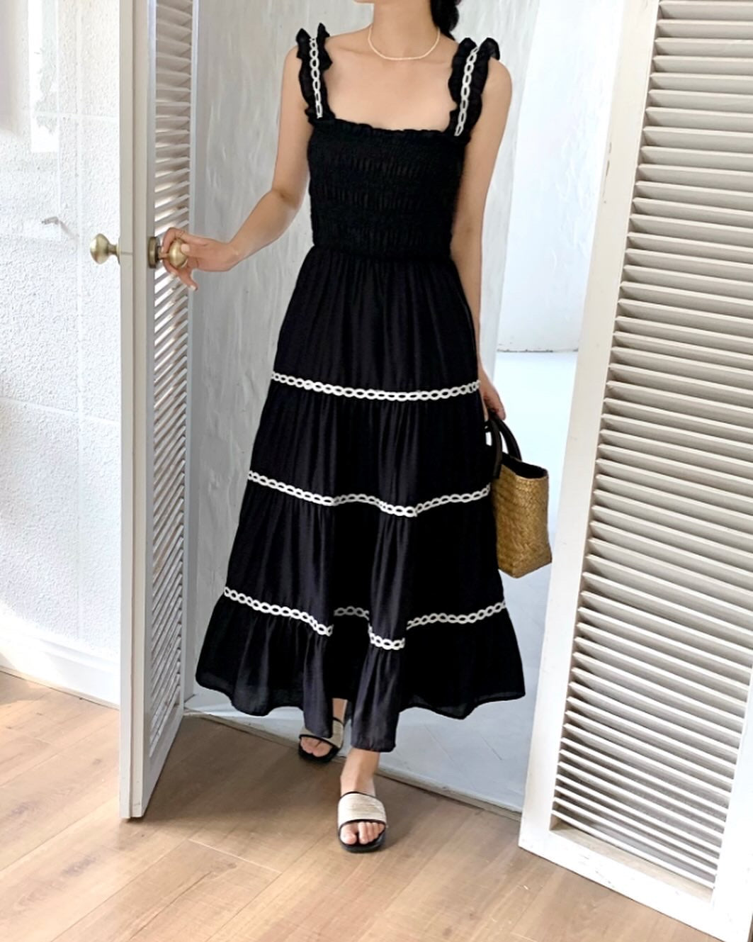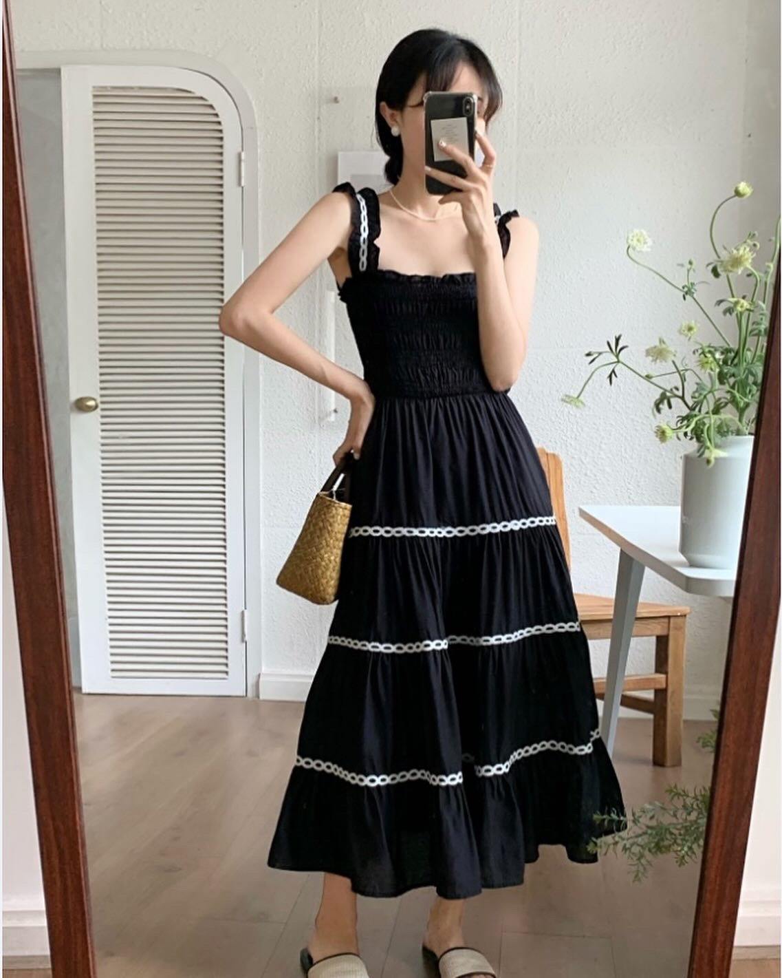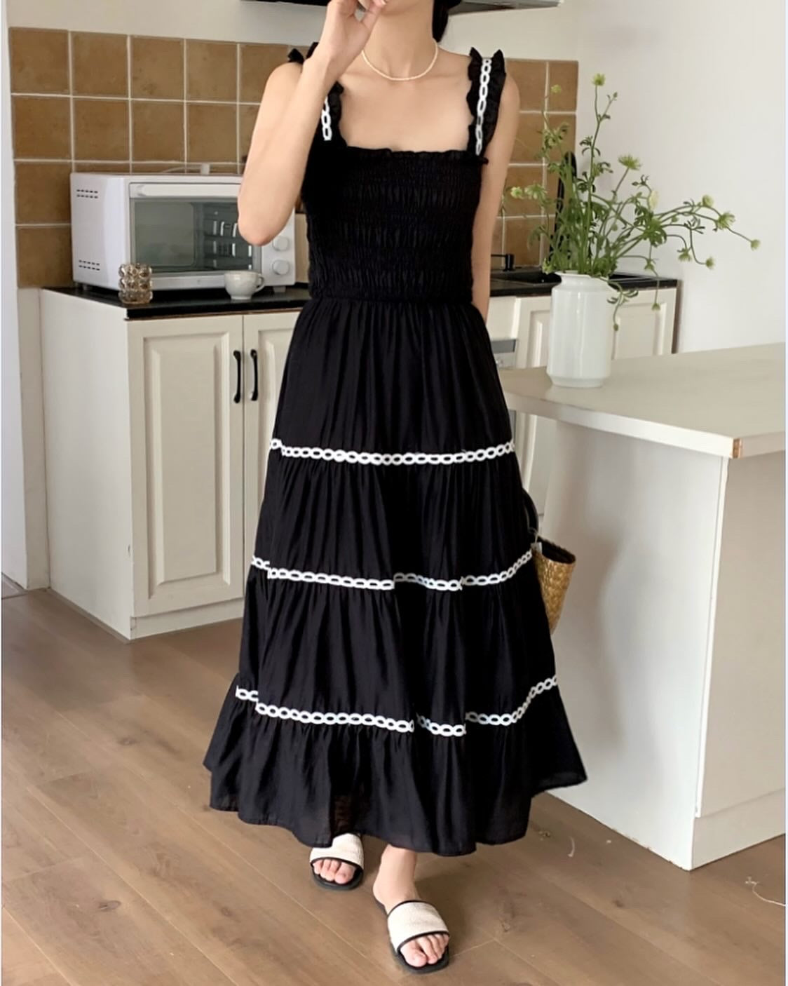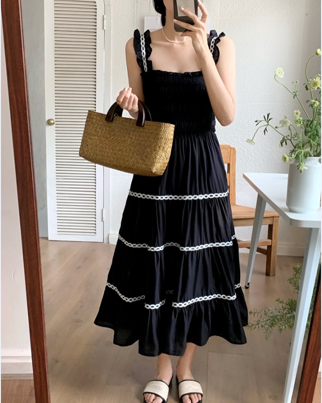 とても上品🤍黒と白のパッチワークデザイン✨生地は通気性があり涼しい☺️お出かけや旅行にぴったり~コットン混紡素材素材:100%コットン混紡サイズ:フリーサイズバスト 110cm スカート丈 115cm*すべての測定値は手測りであるため、測定値と1-2 cmの誤差がある場合があります。