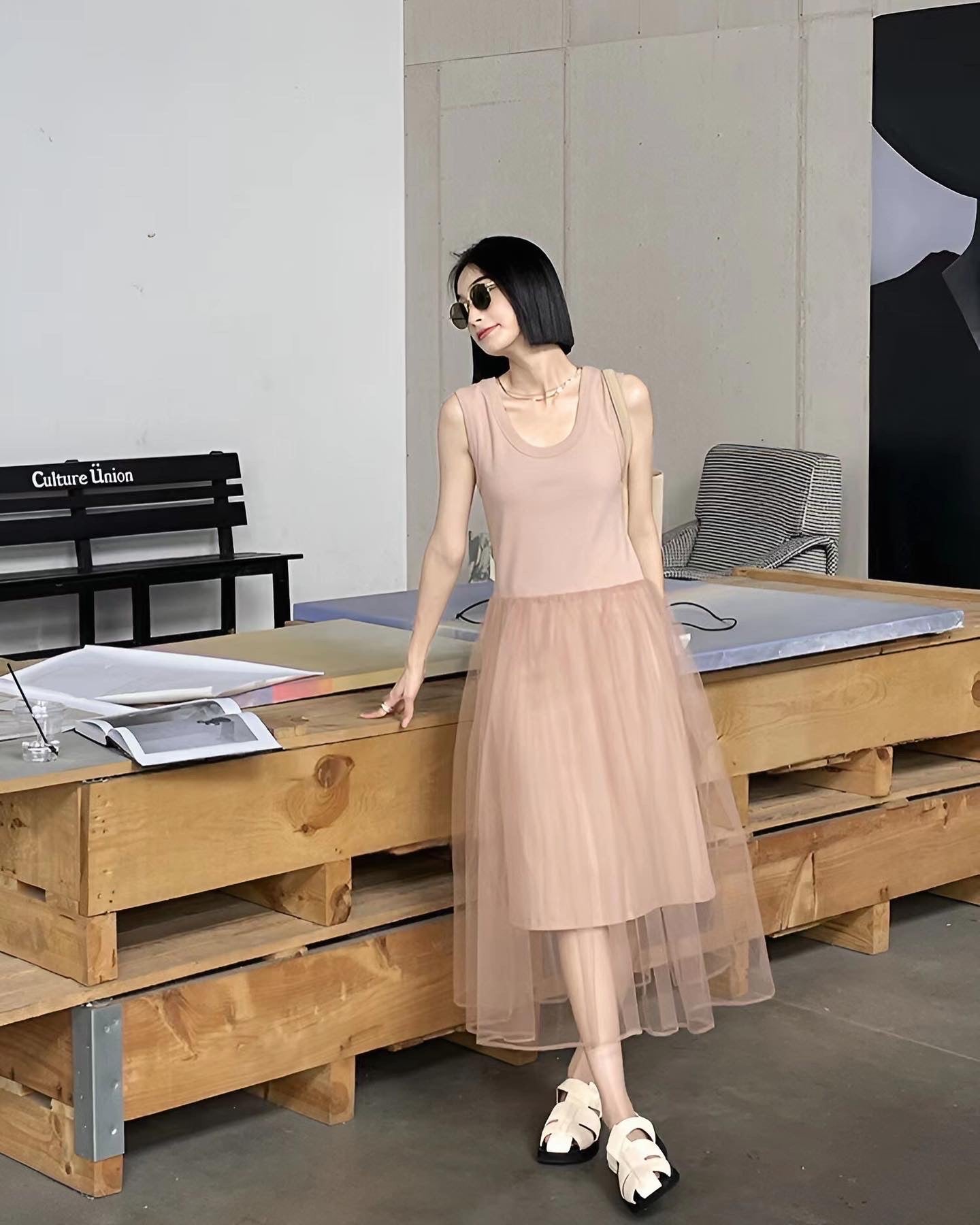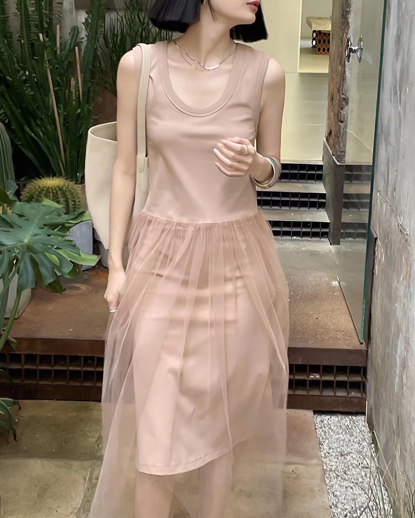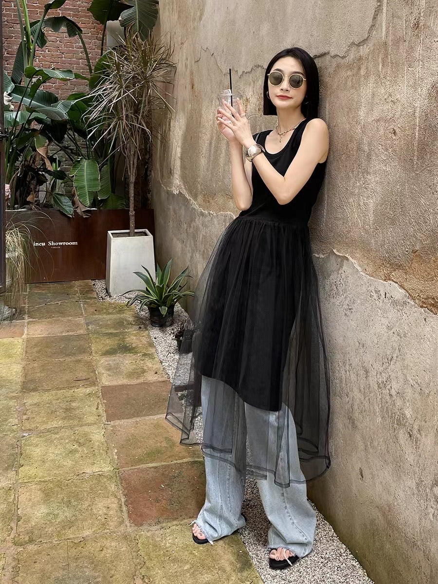 編み糸Uネックタンクトップロングスカート