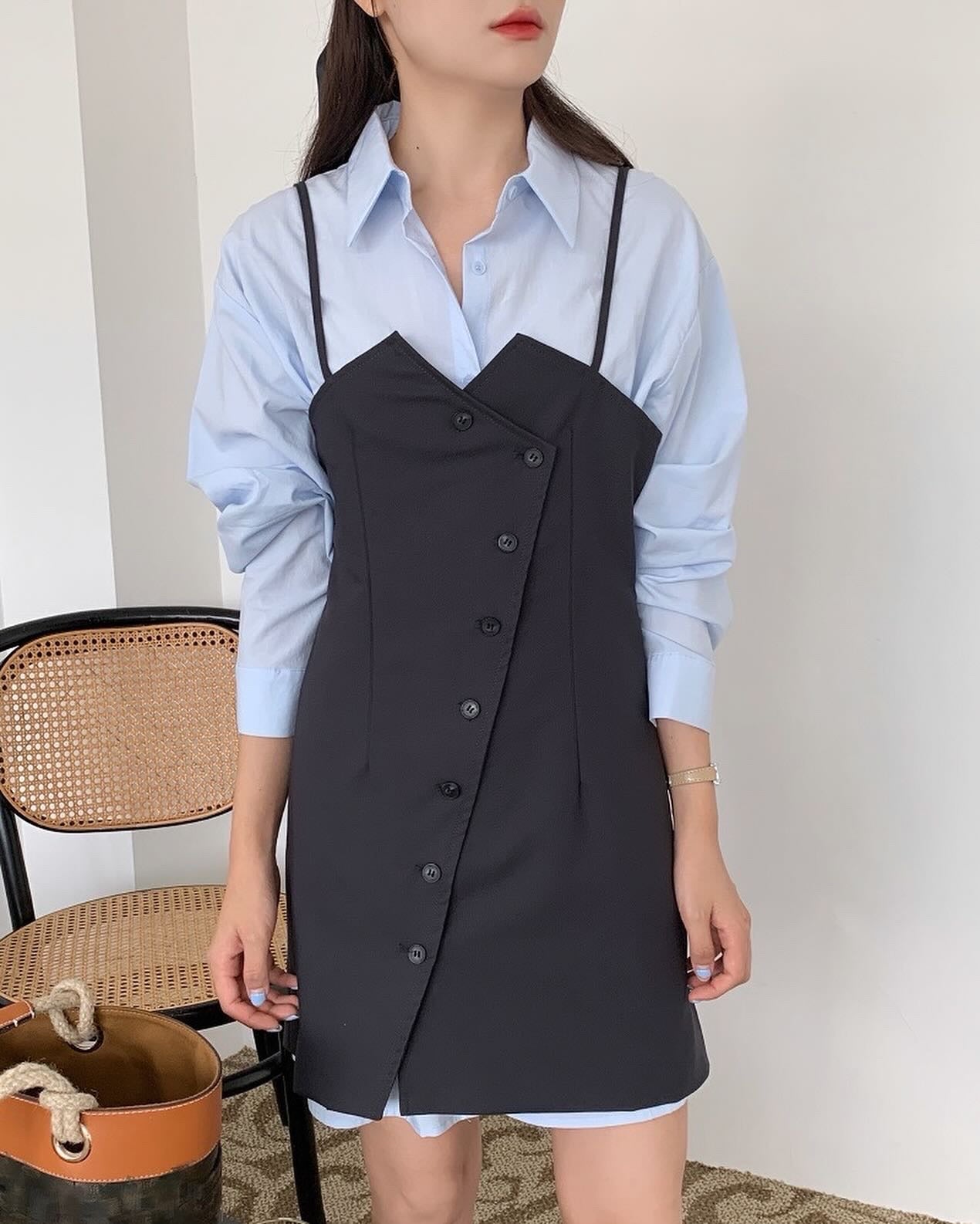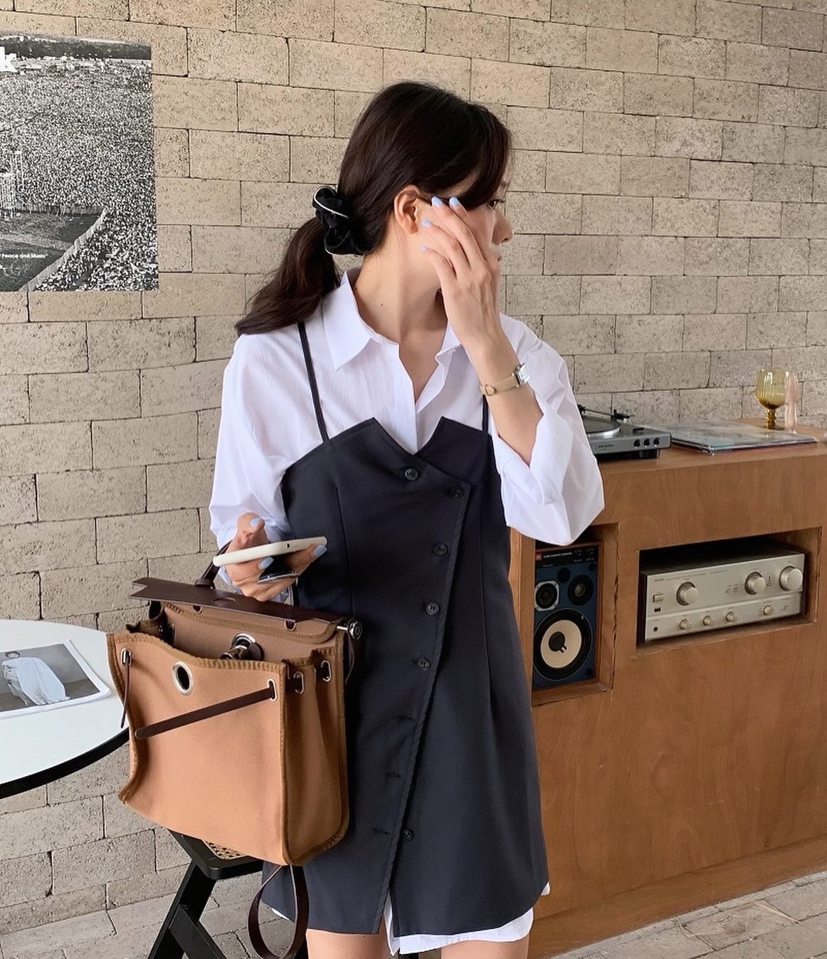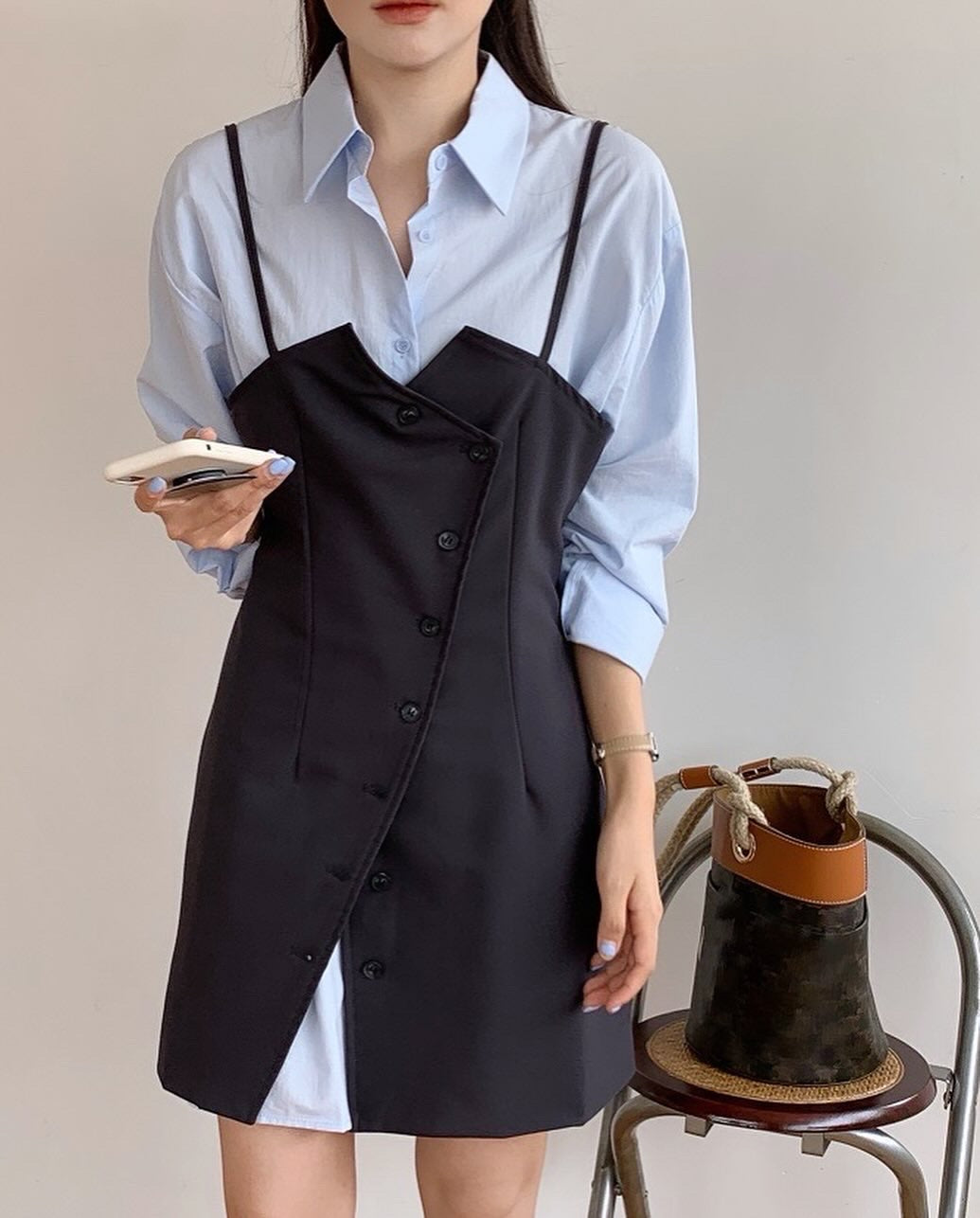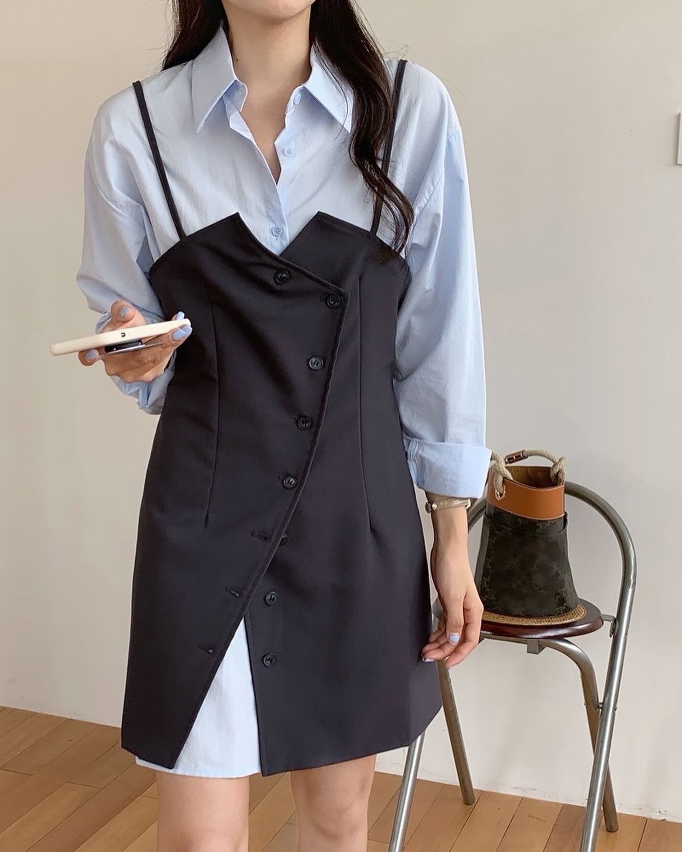 シャツ+不規則ボタンデザインスリットキャミソールドレス