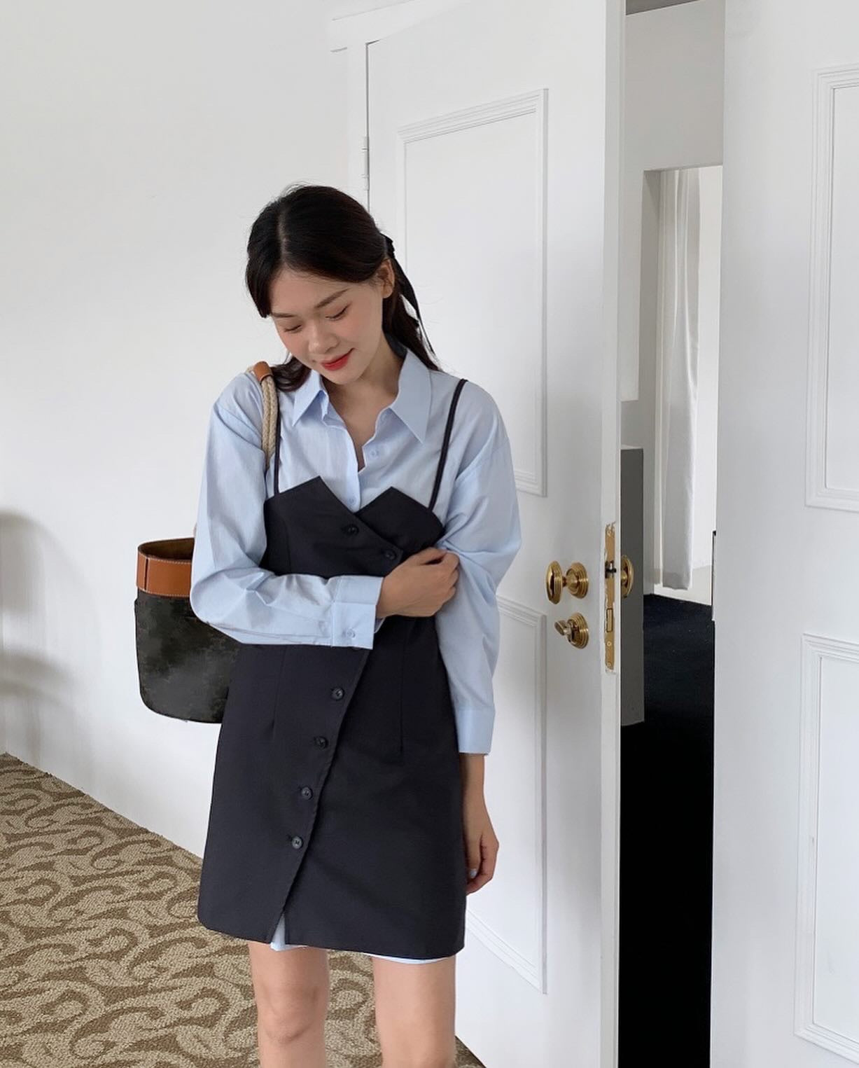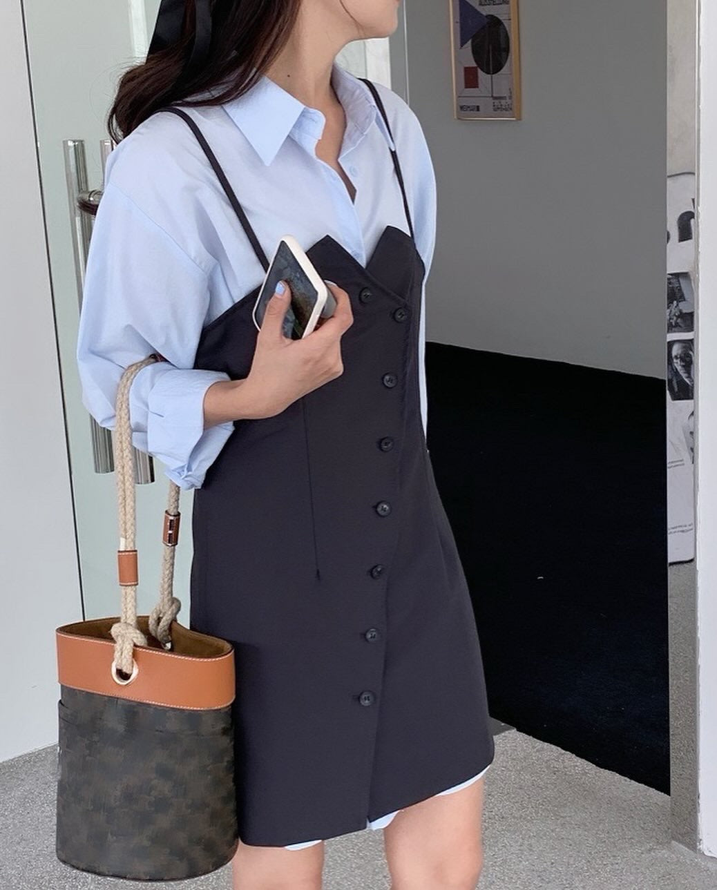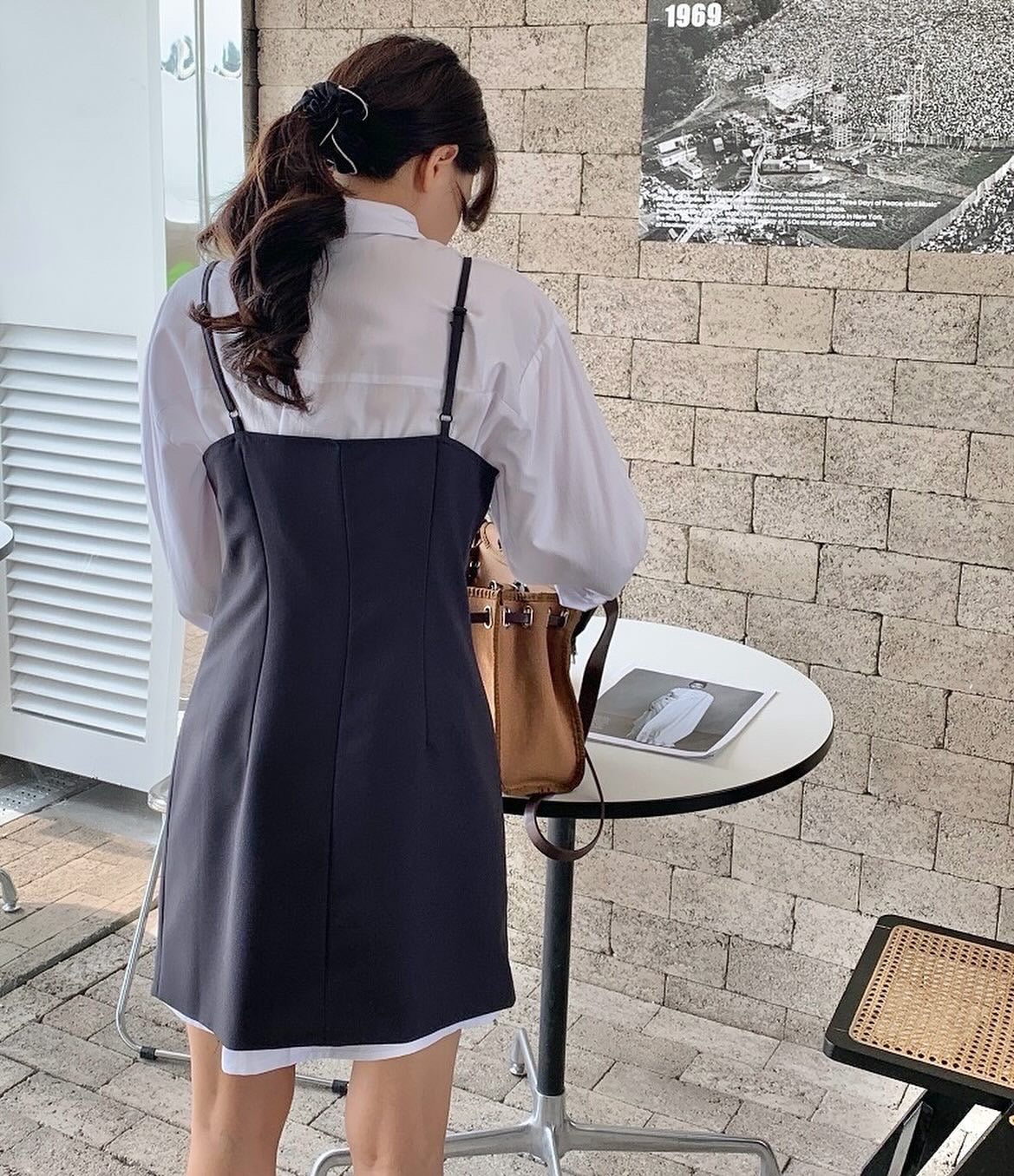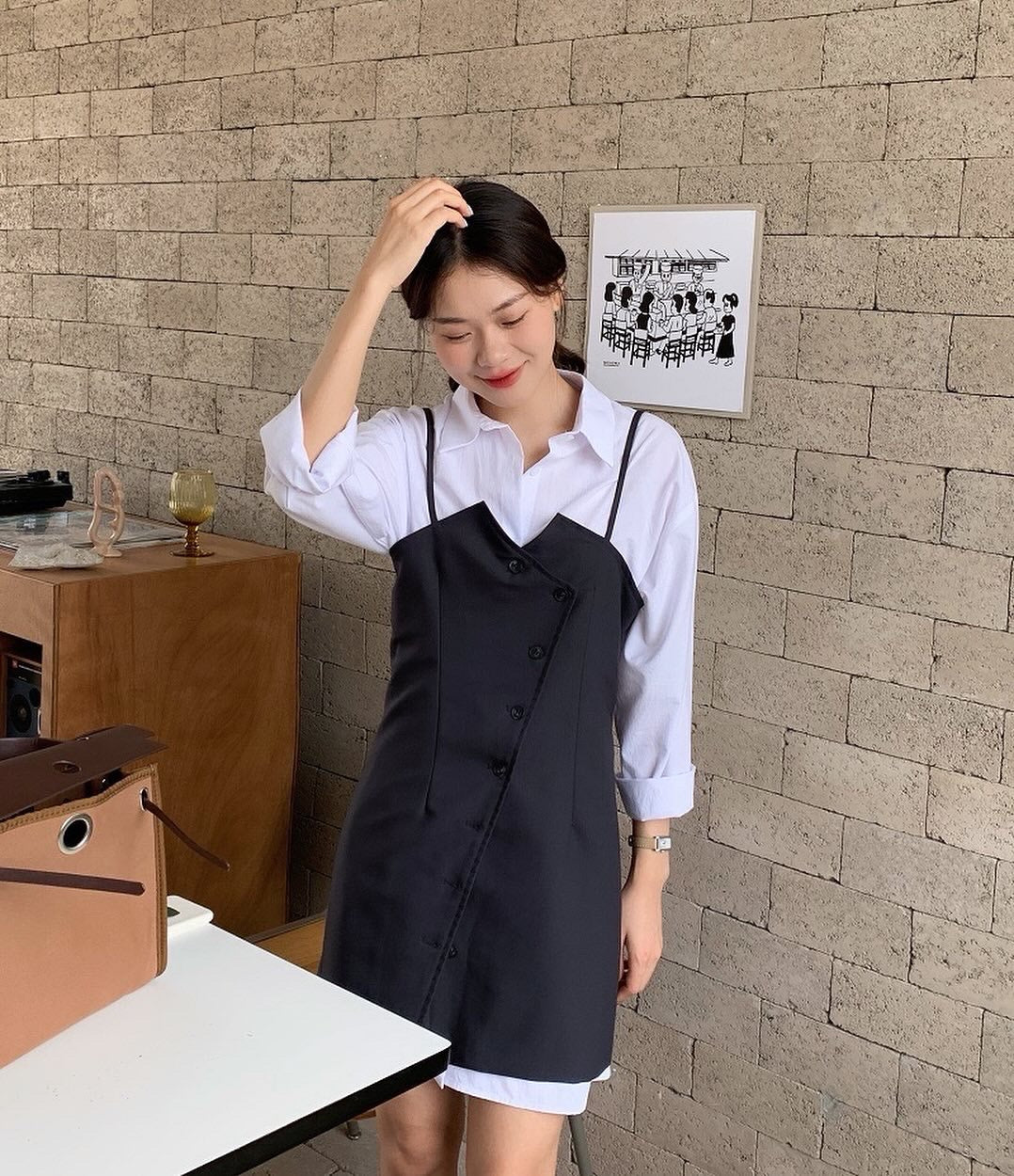 シャツ+不規則ボタンデザインスリットキャミソールドレス