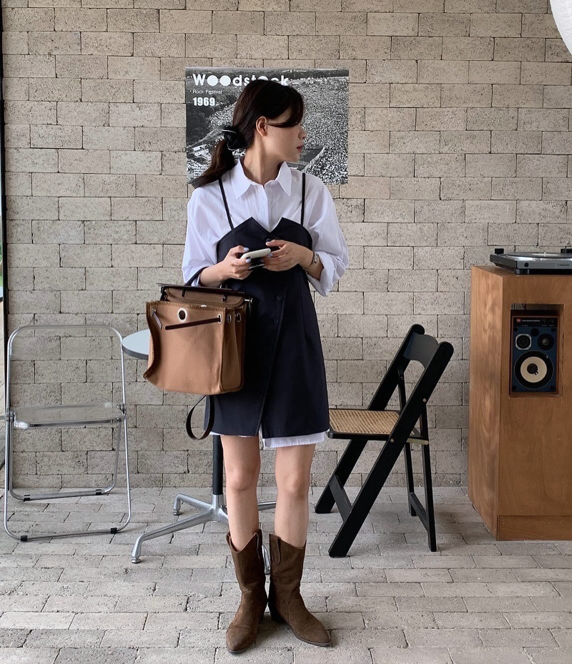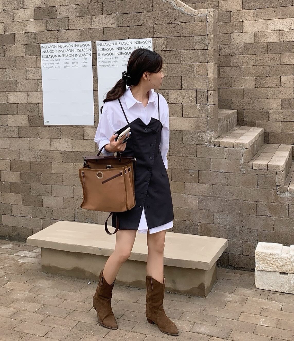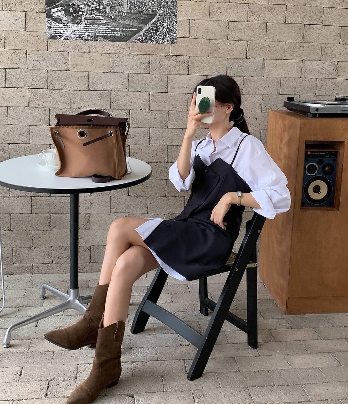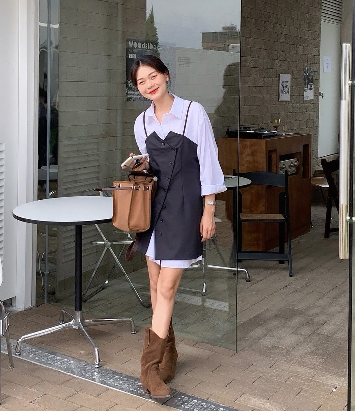 シャツ+不規則ボタンデザインスリットキャミソールドレス