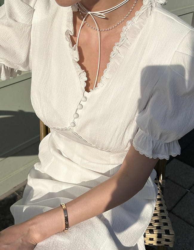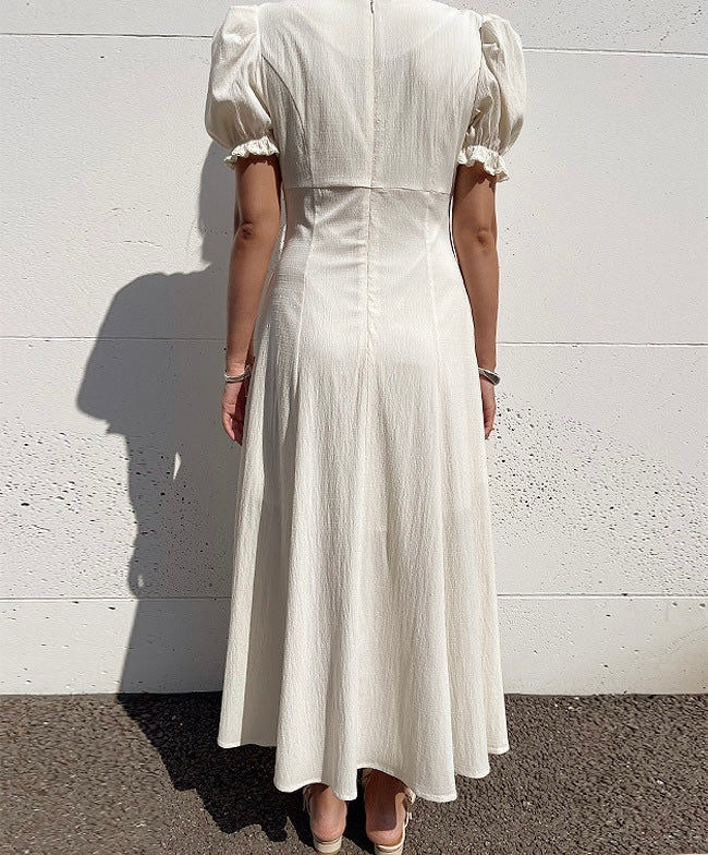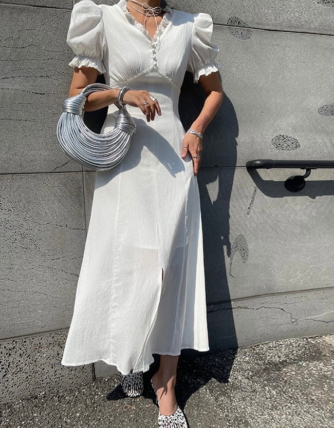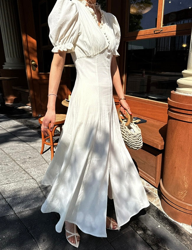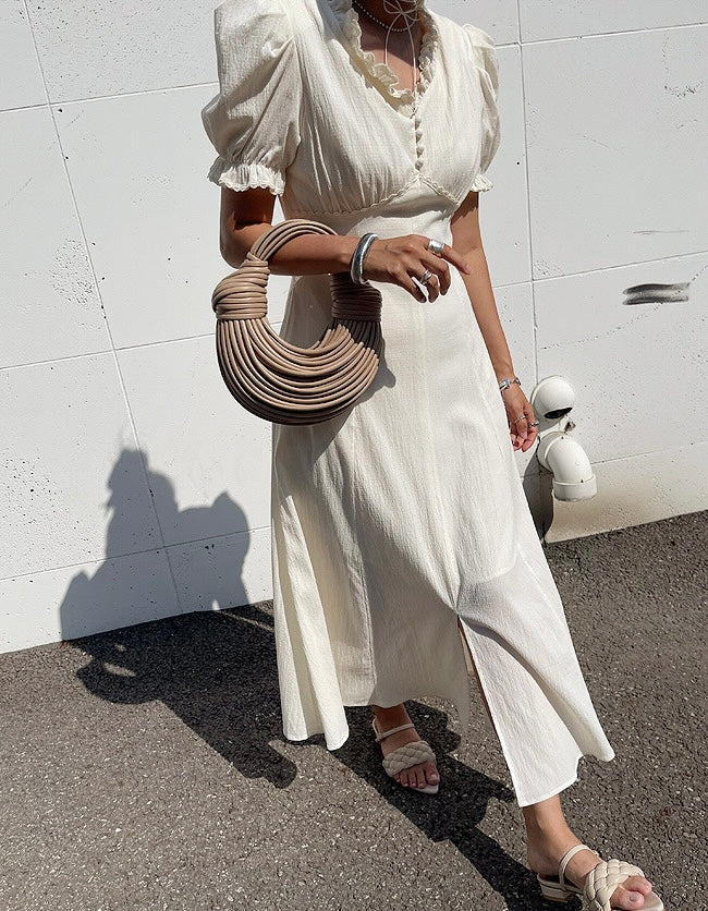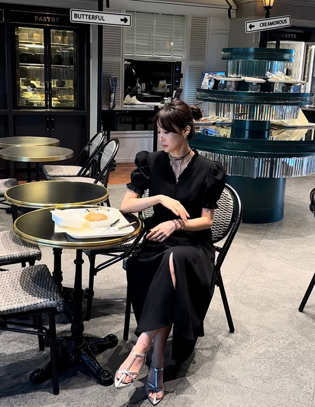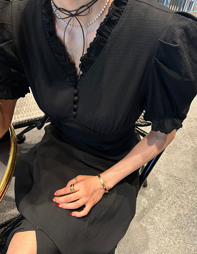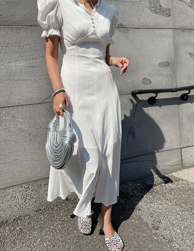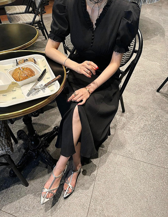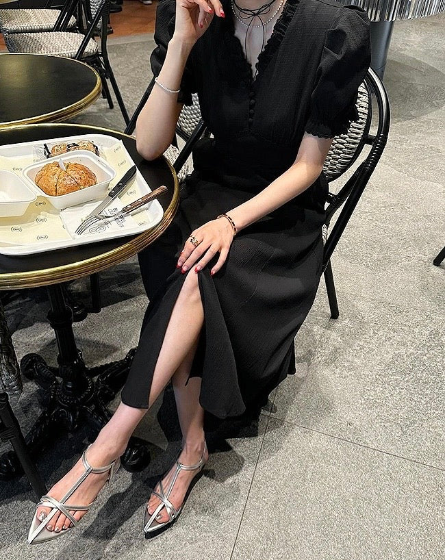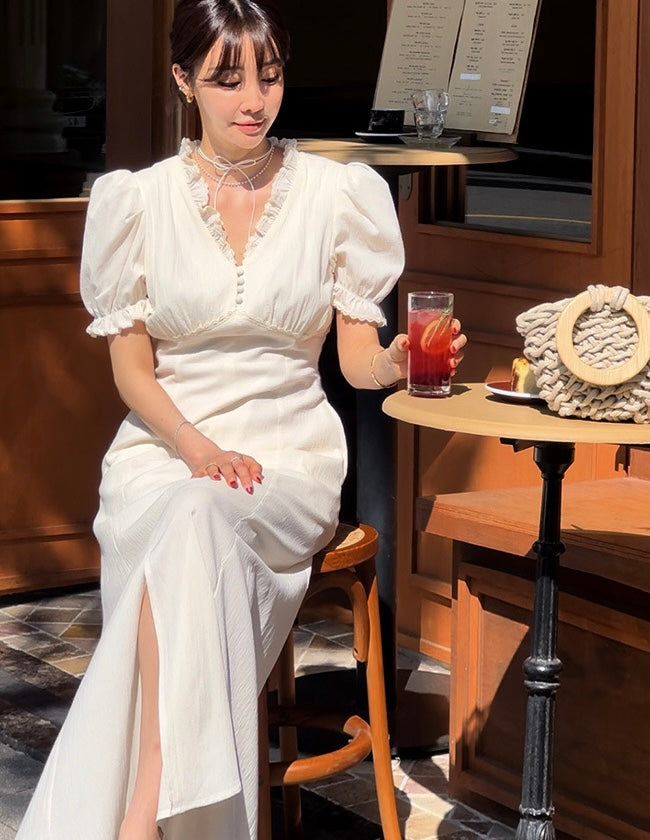 Vネックフリルスリットワンピース
