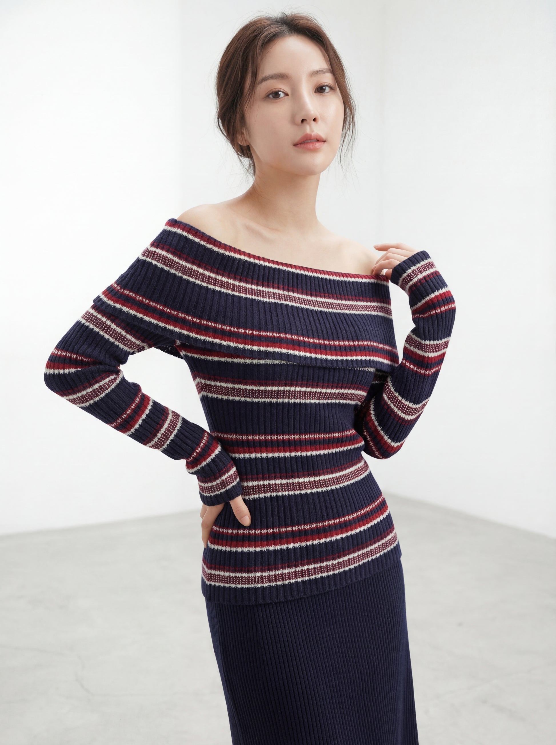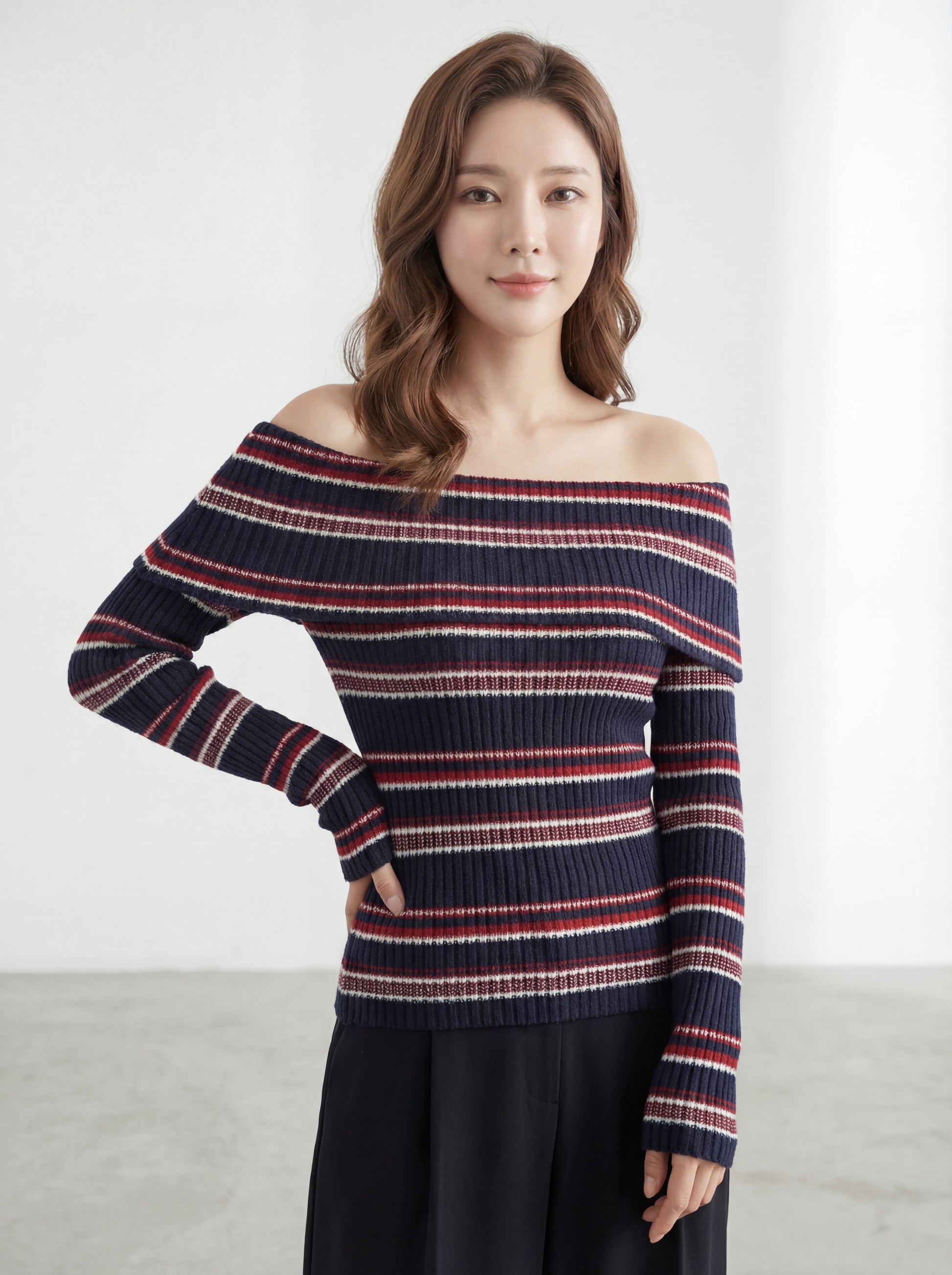 オフショルダー/斜め肩の2ウェイ配色ストライプでスタイリッシュにスリム見せニット素材でフィット感抜群の快適さ気軽にエレガントな雰囲気を演出ニット素材