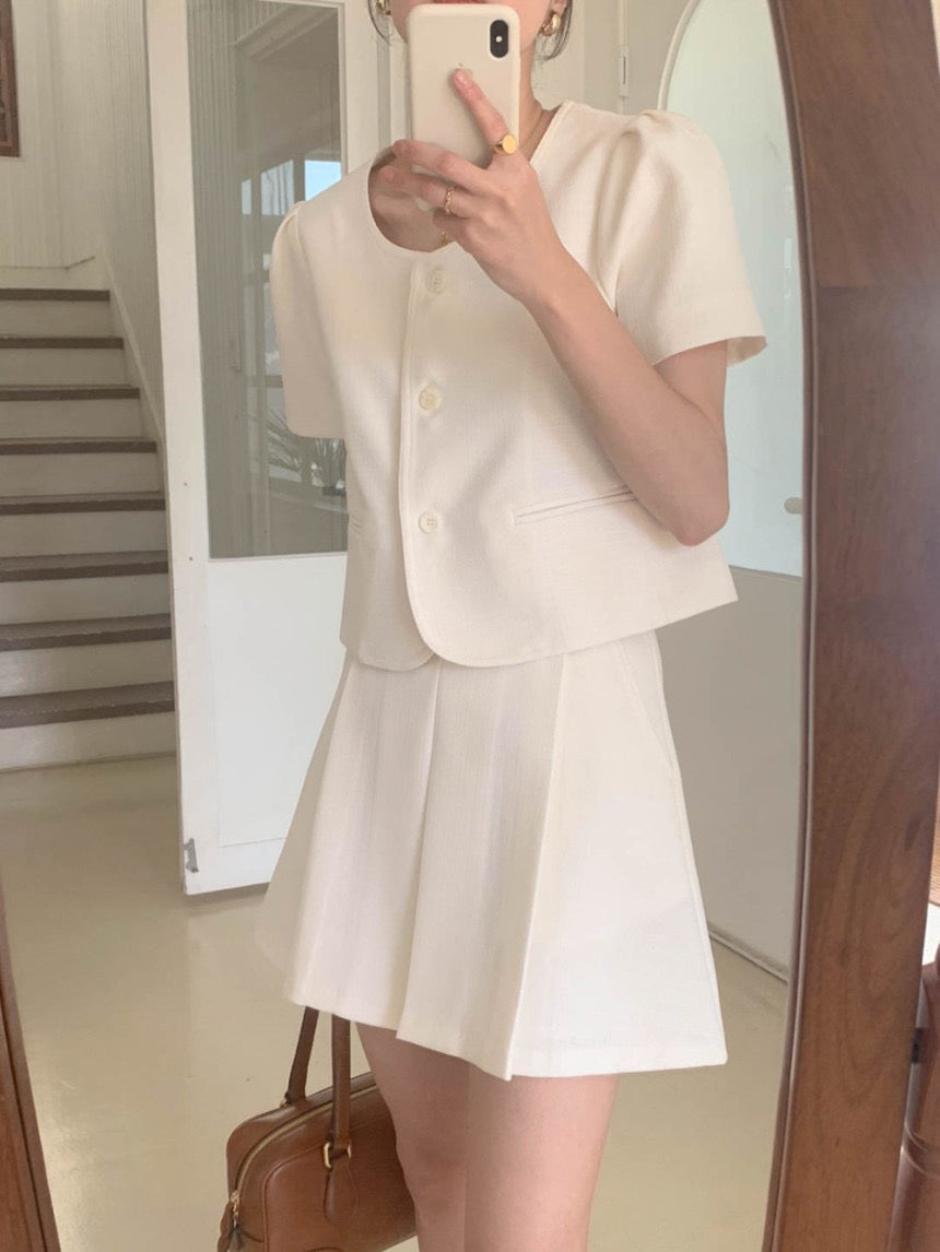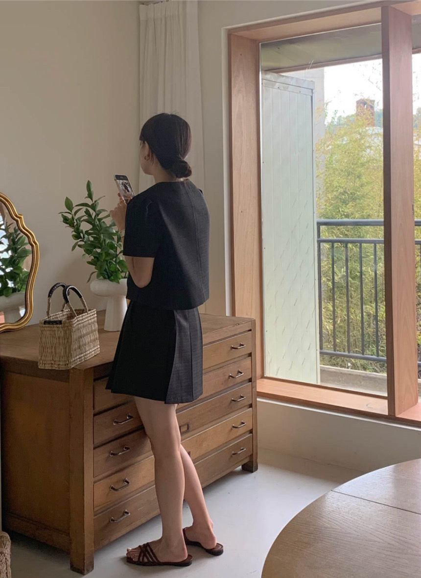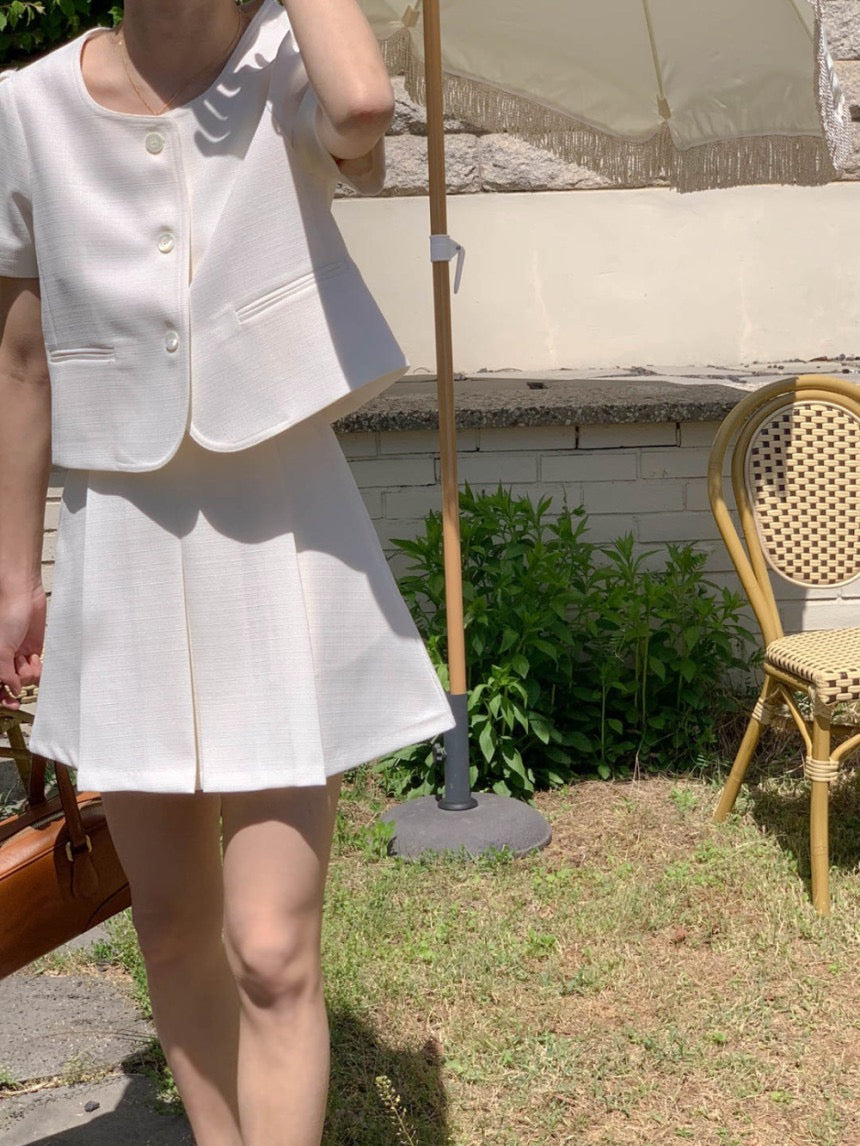シャネル風のショートトップス+プリーツスカートセットアップ