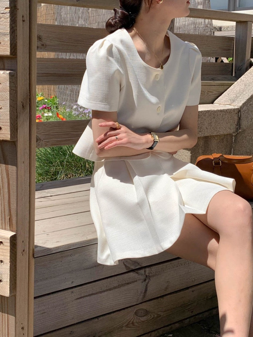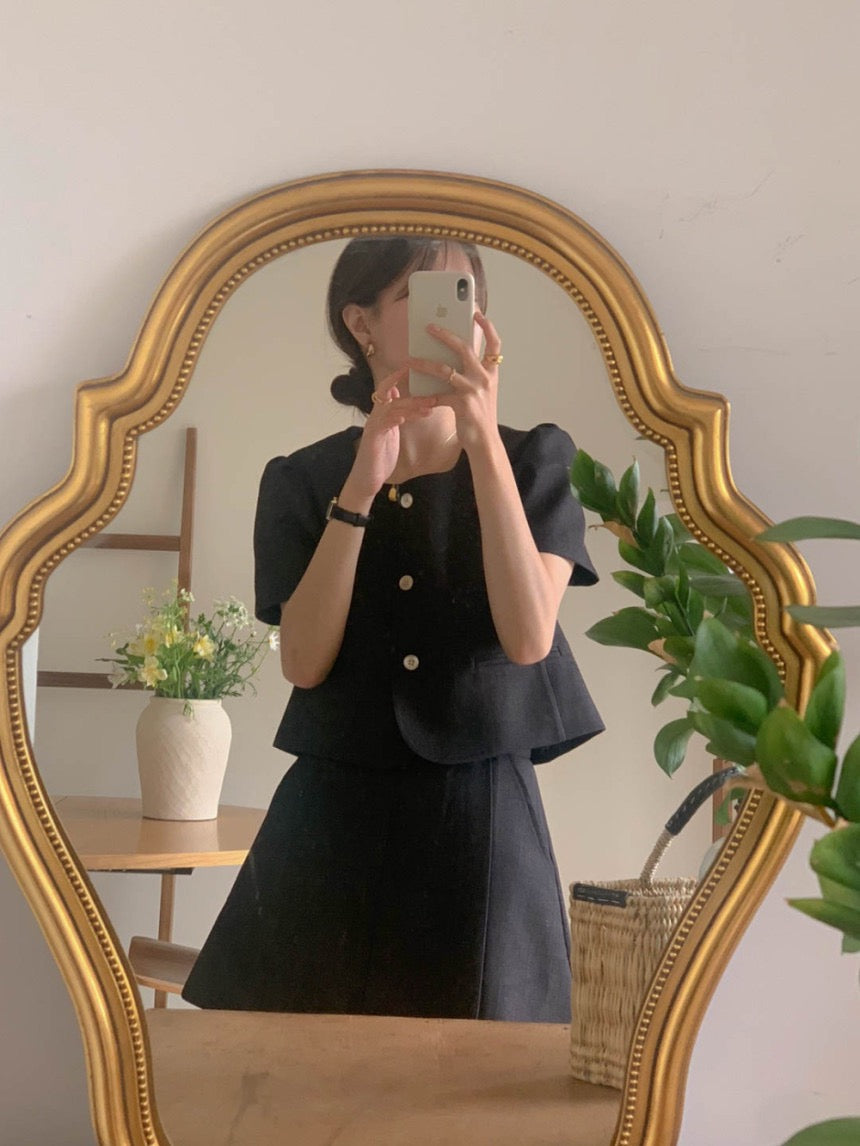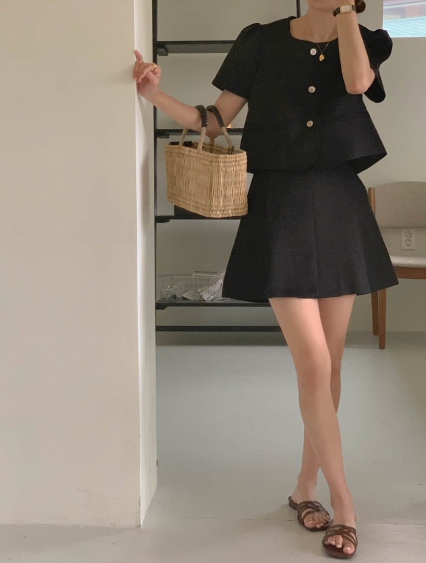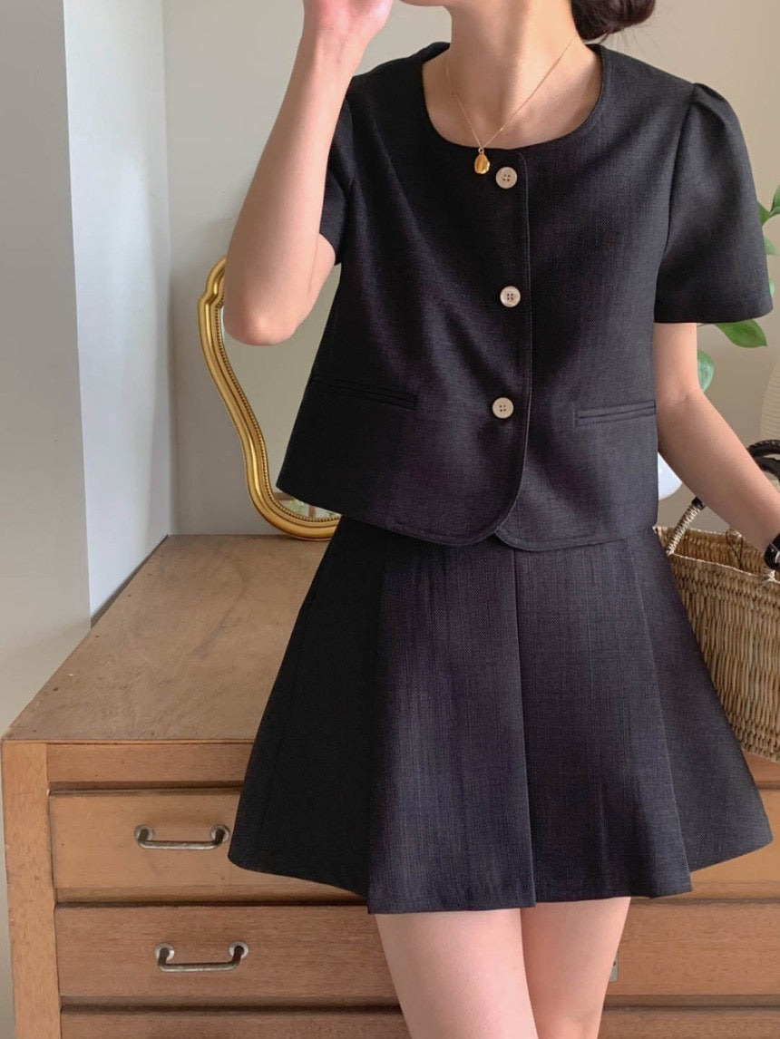 シャネル風のショートトップス+プリーツスカートセットアップ