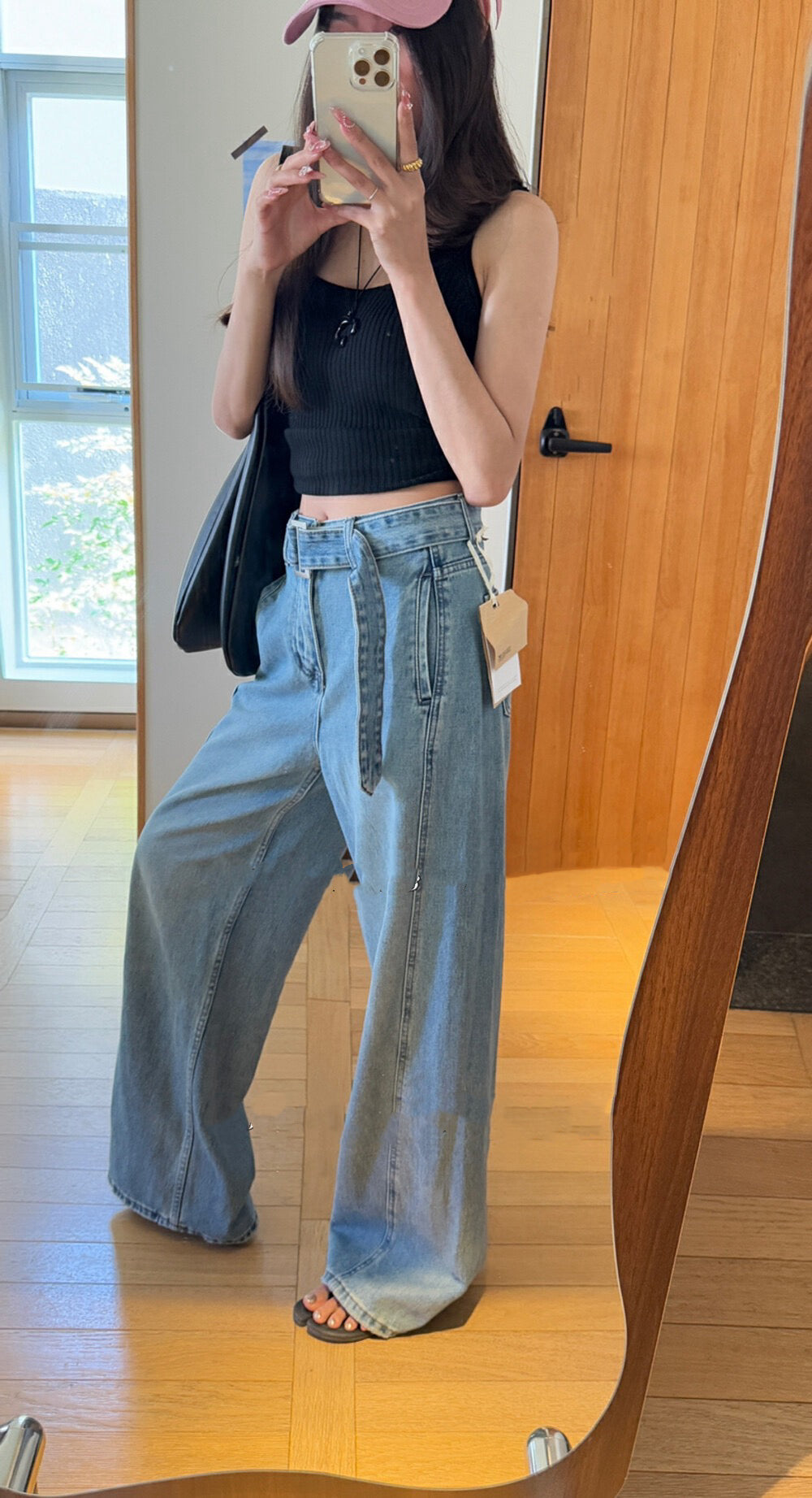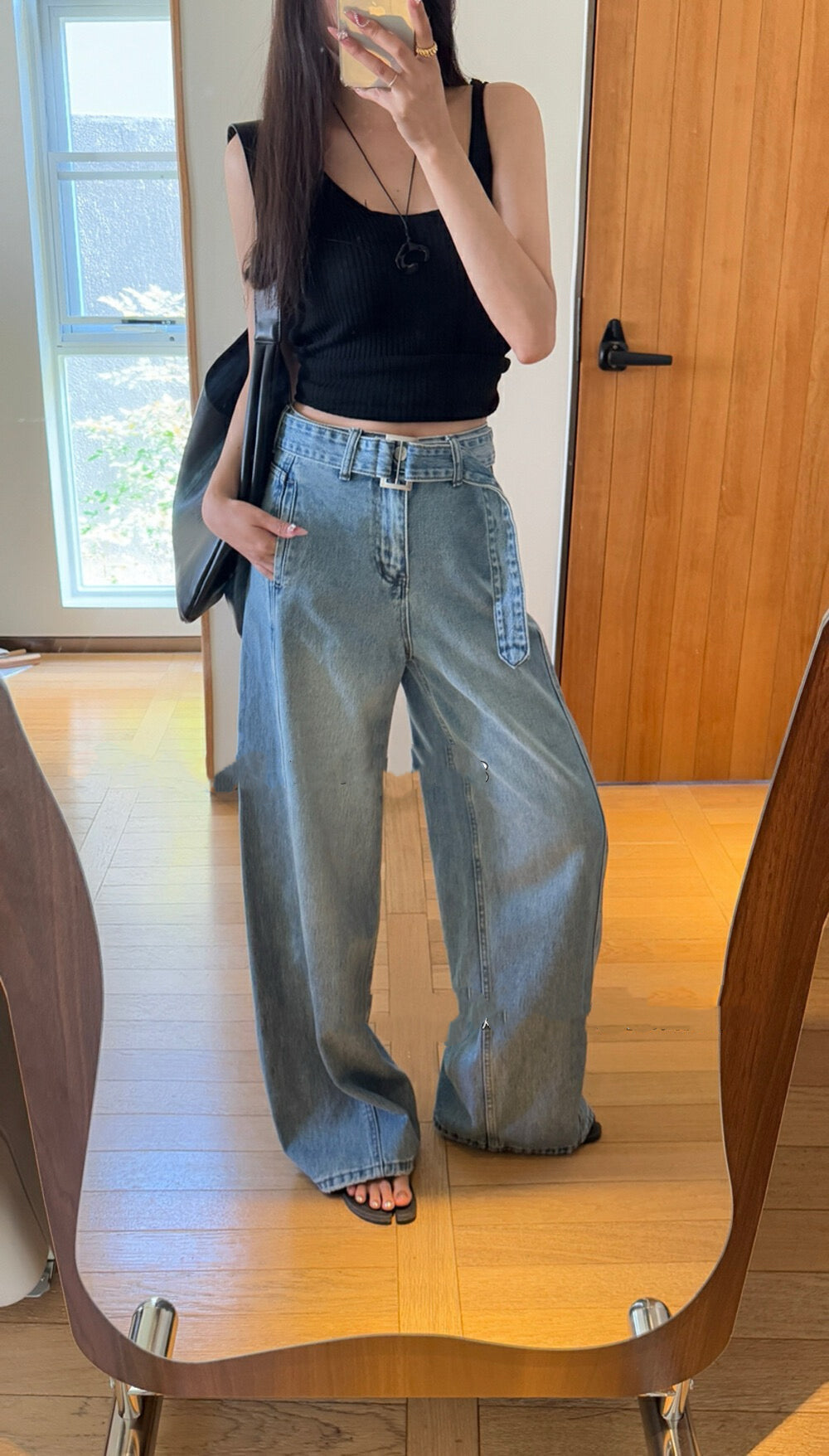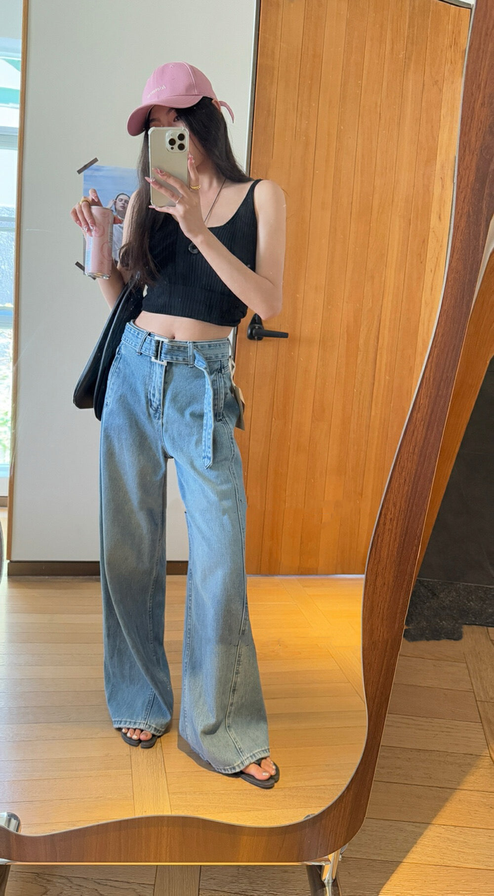 ベルトを合わせて、ウエストラインをアップ👖ワイドレッグデザイン、快適で自由💯カジュアルなファッション、万能で着やすい✨デニム生地