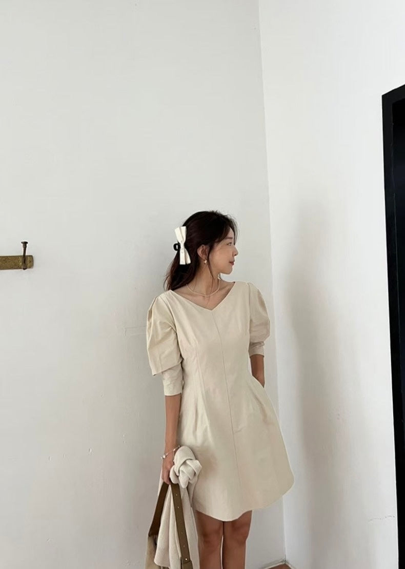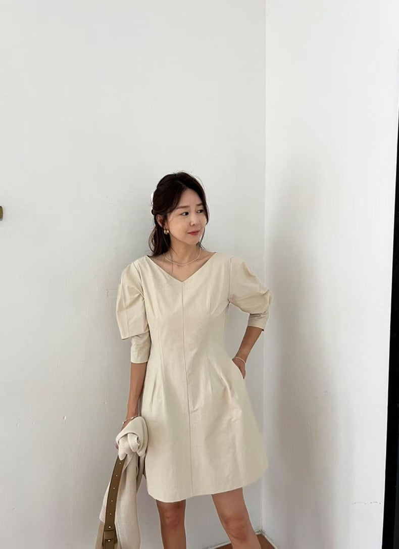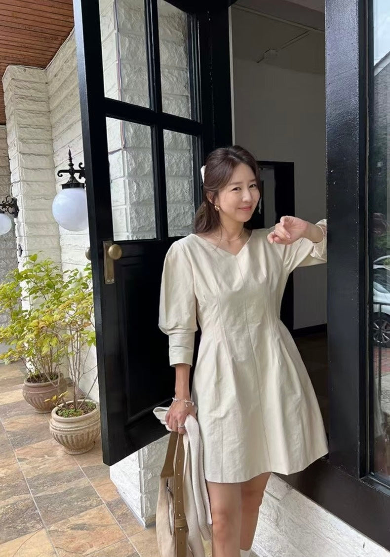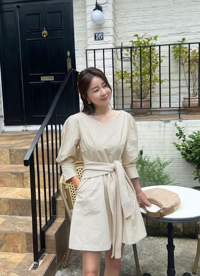 Vネックウエスト絞り七分袖ワンピース