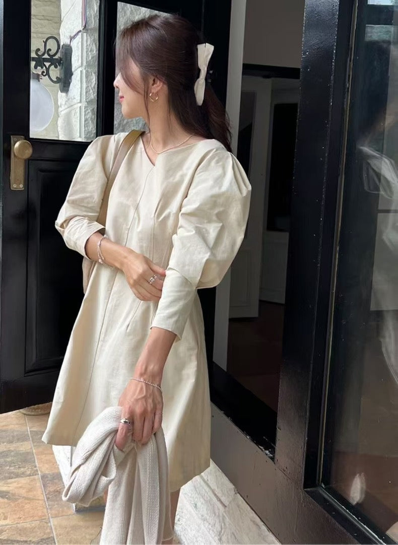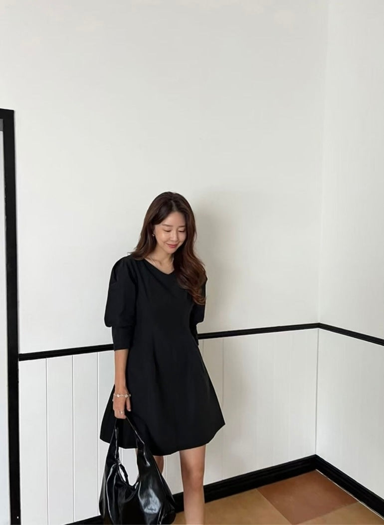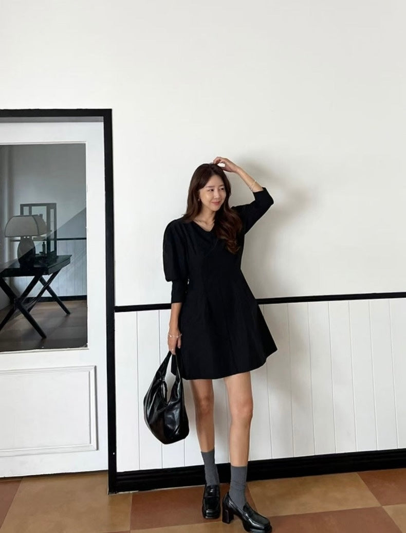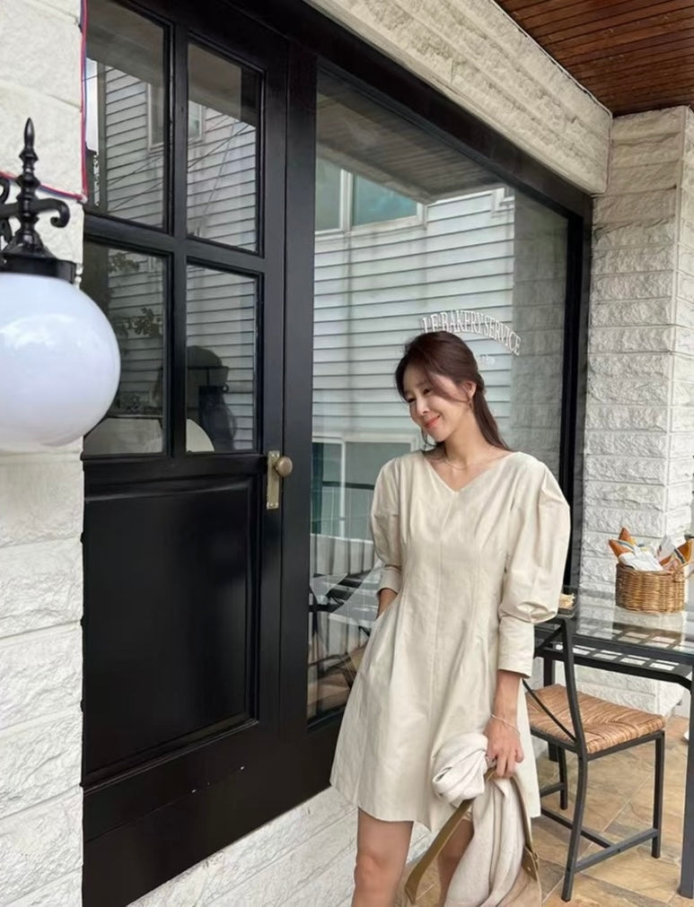 Vネックウエスト絞り七分袖ワンピース