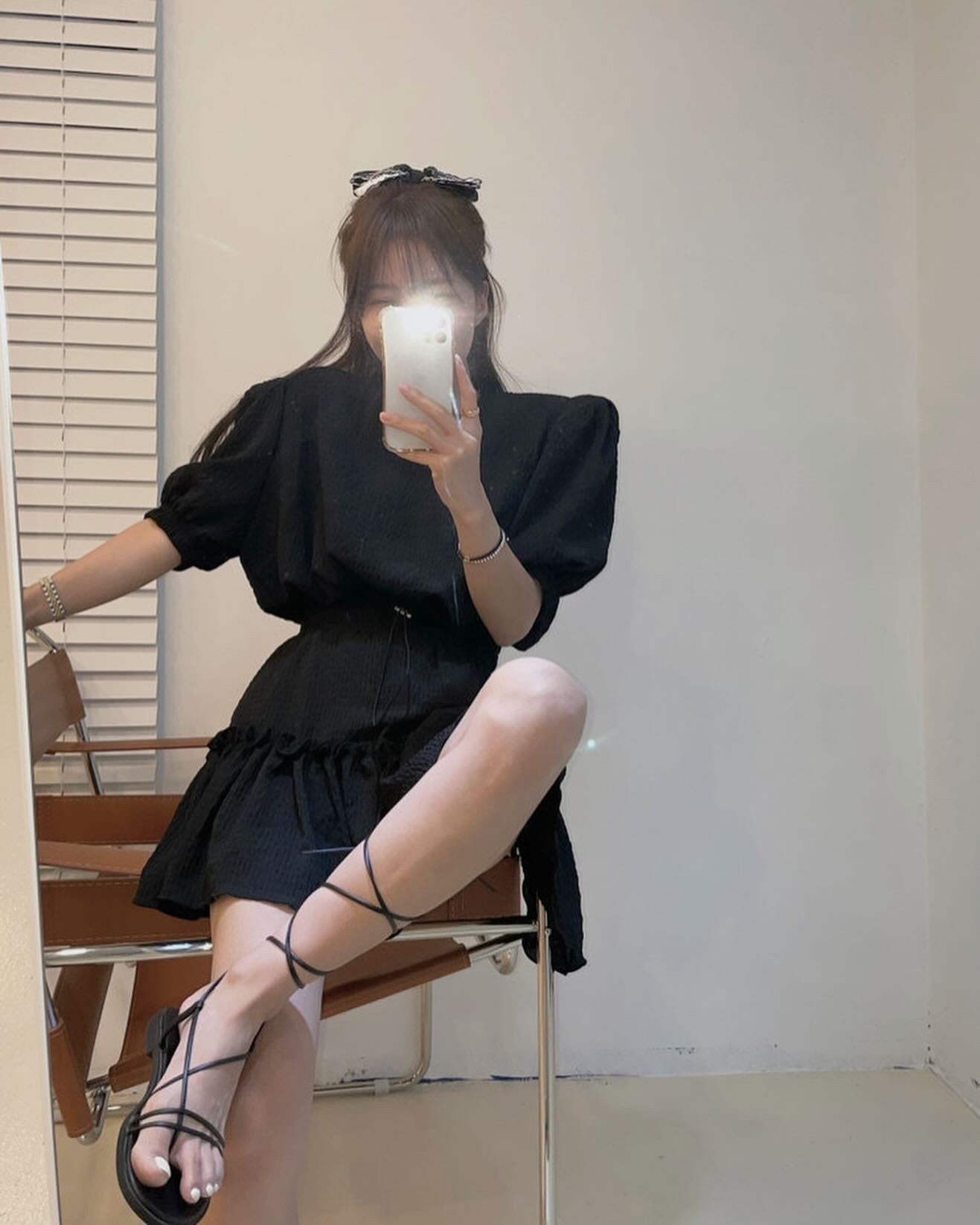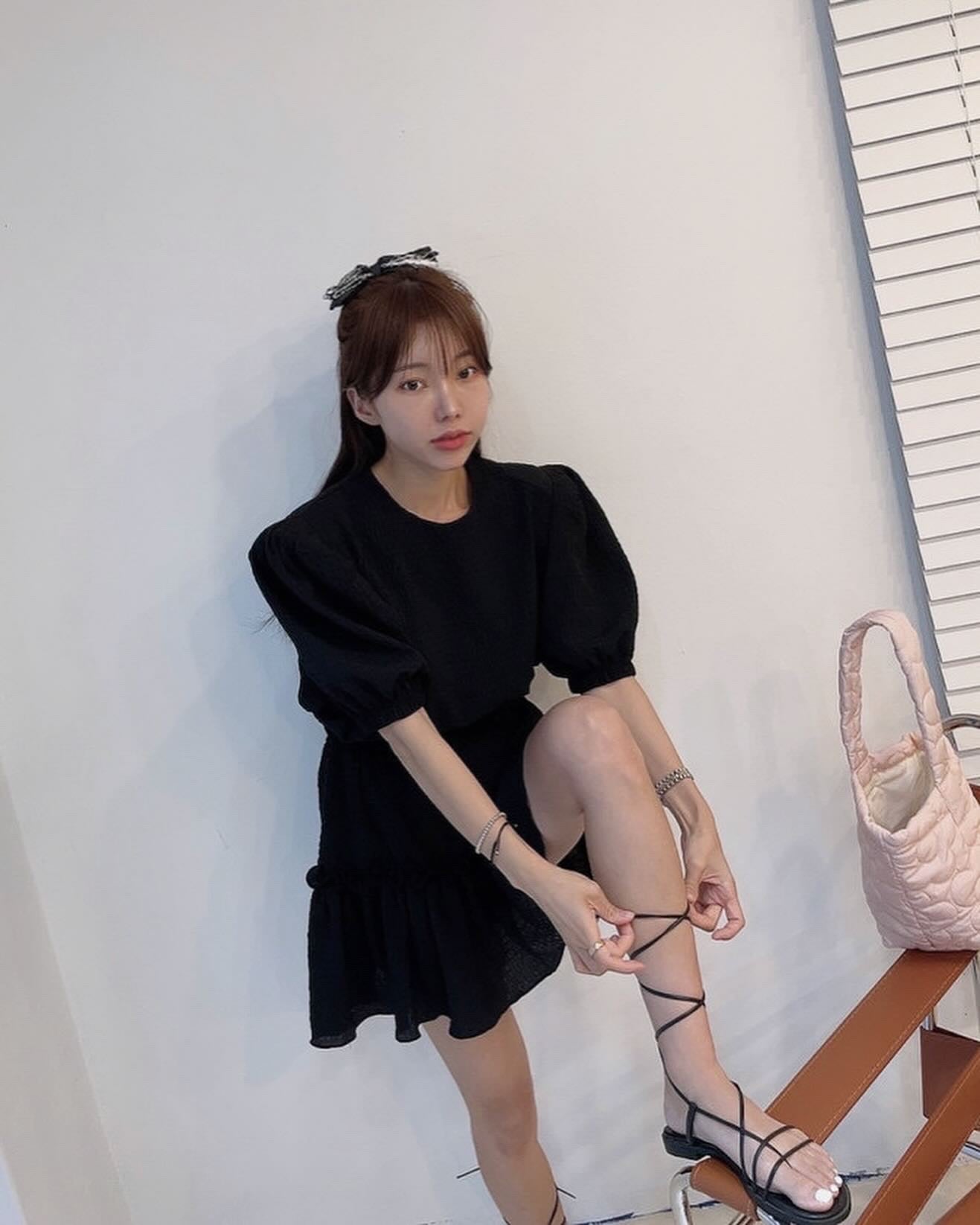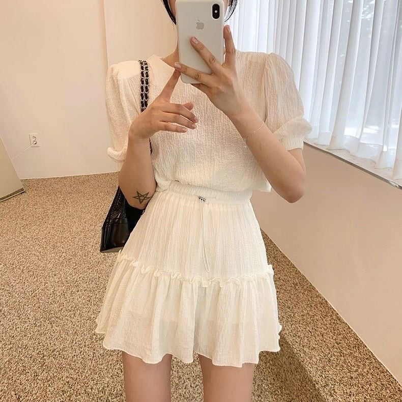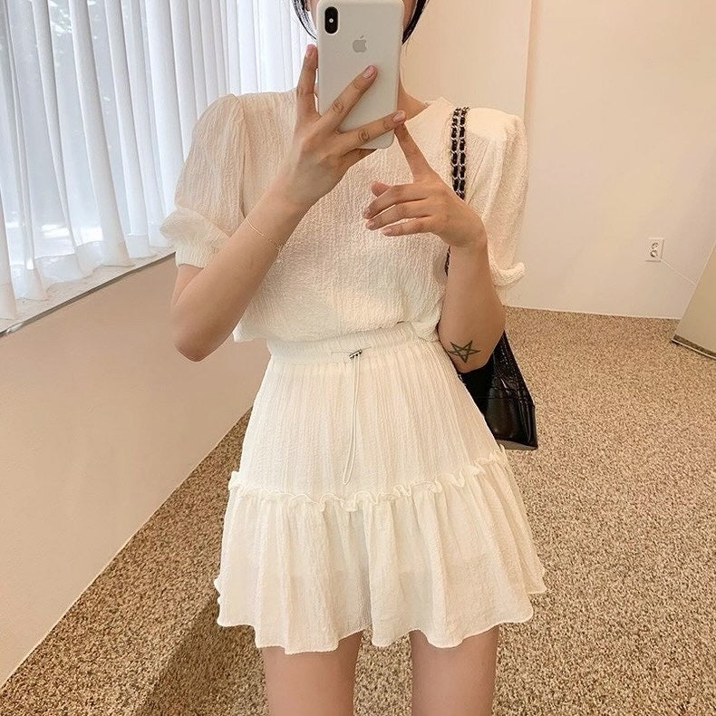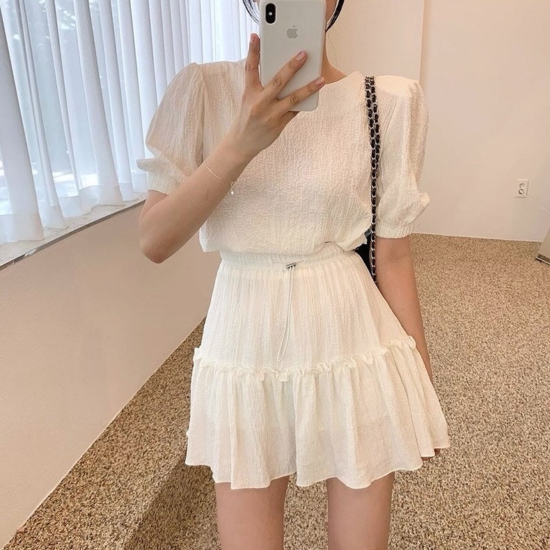 丸首パフスリーブ+フリルミニスカートセットアップ
