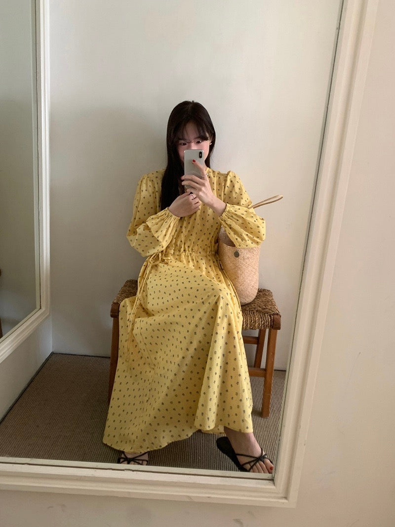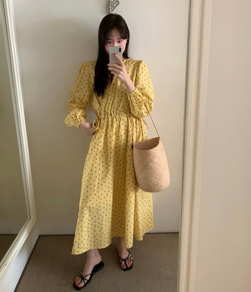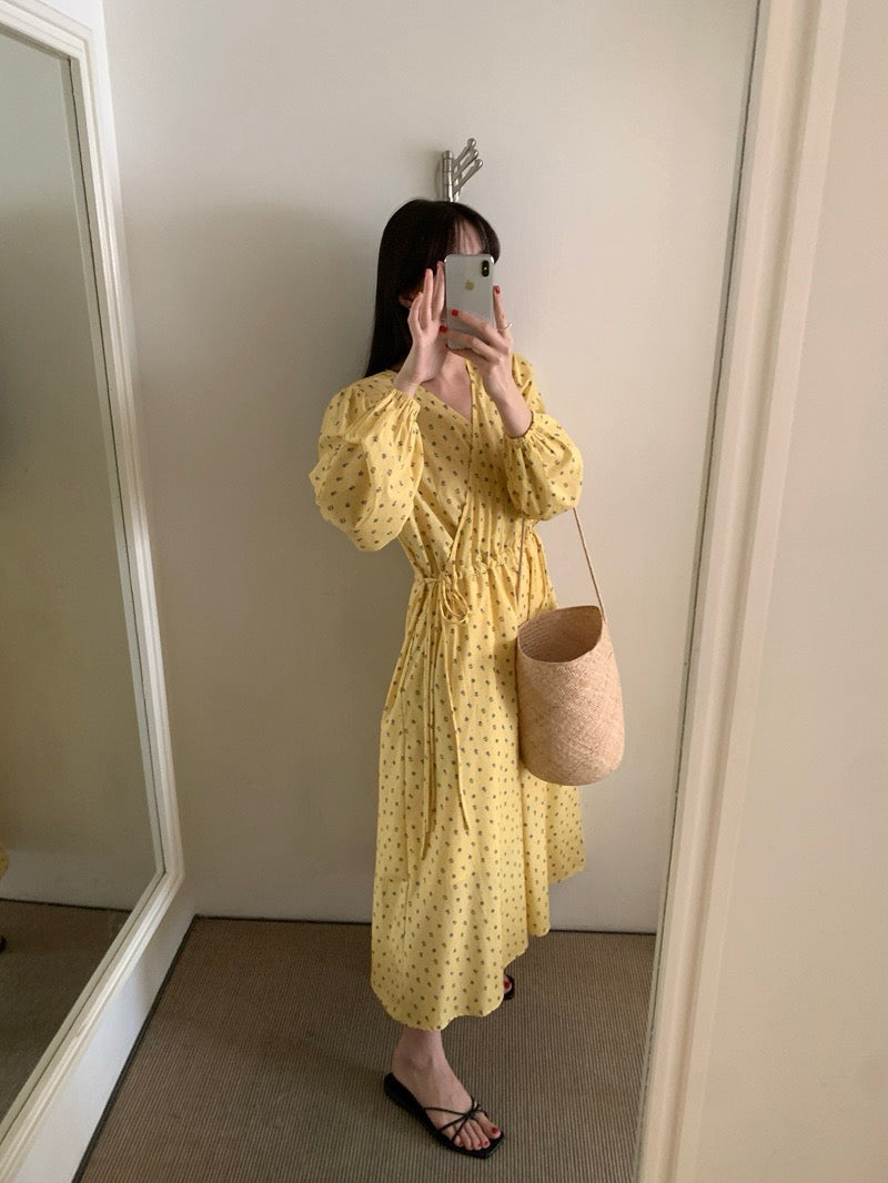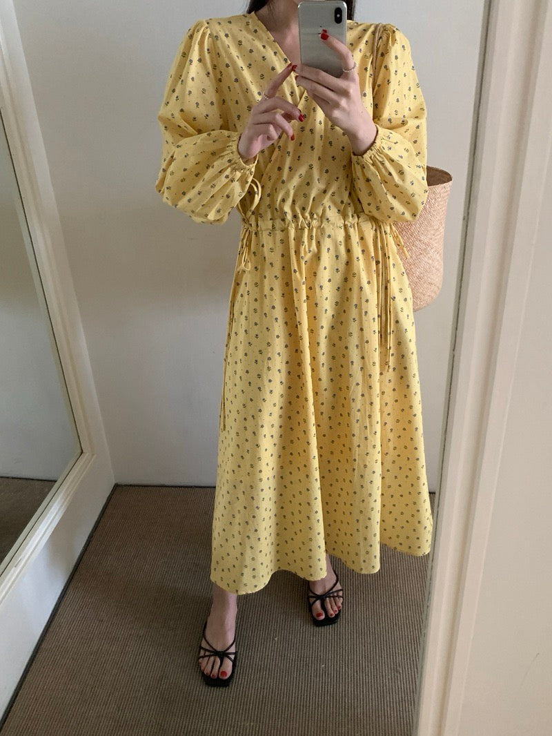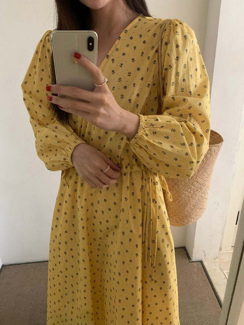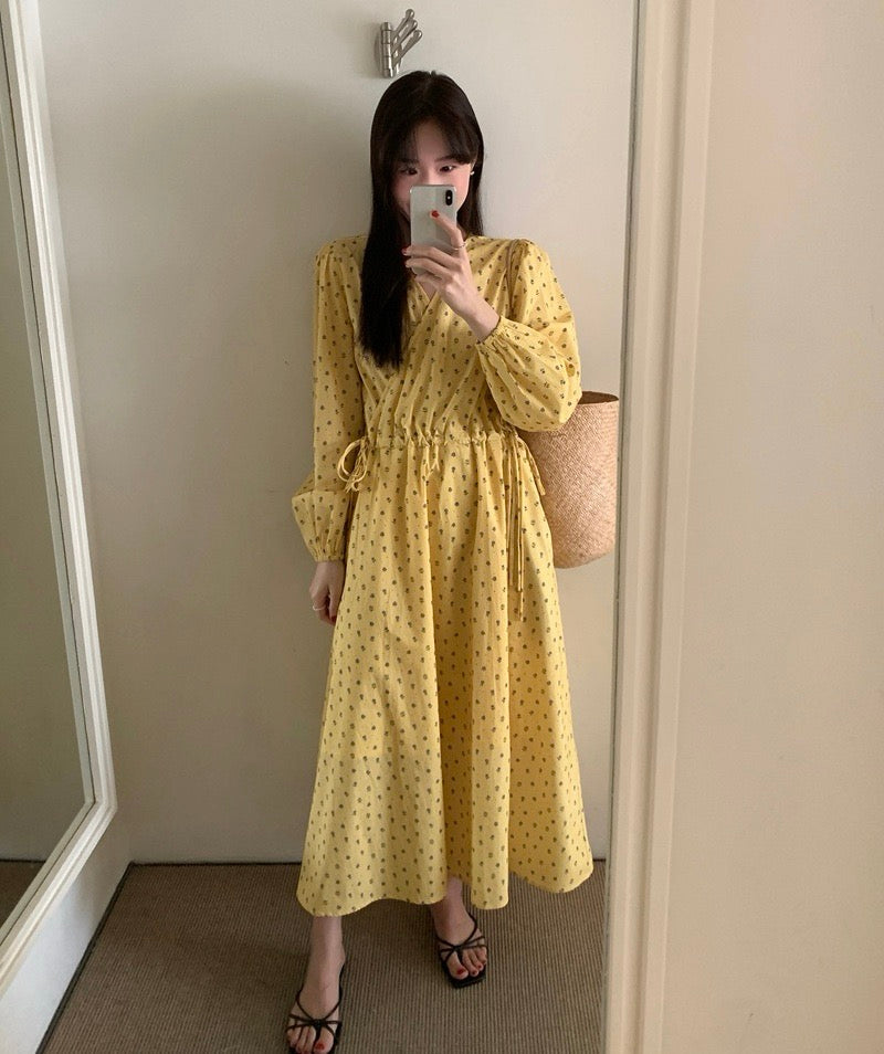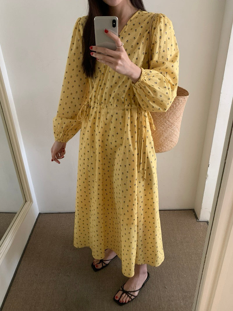 Vネックドローストリングウエスト切り替え花柄ワンピース