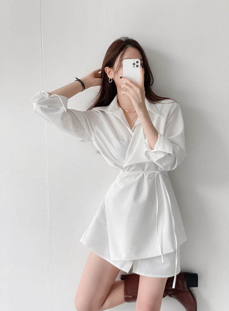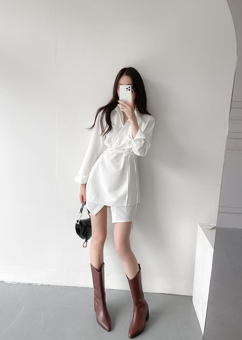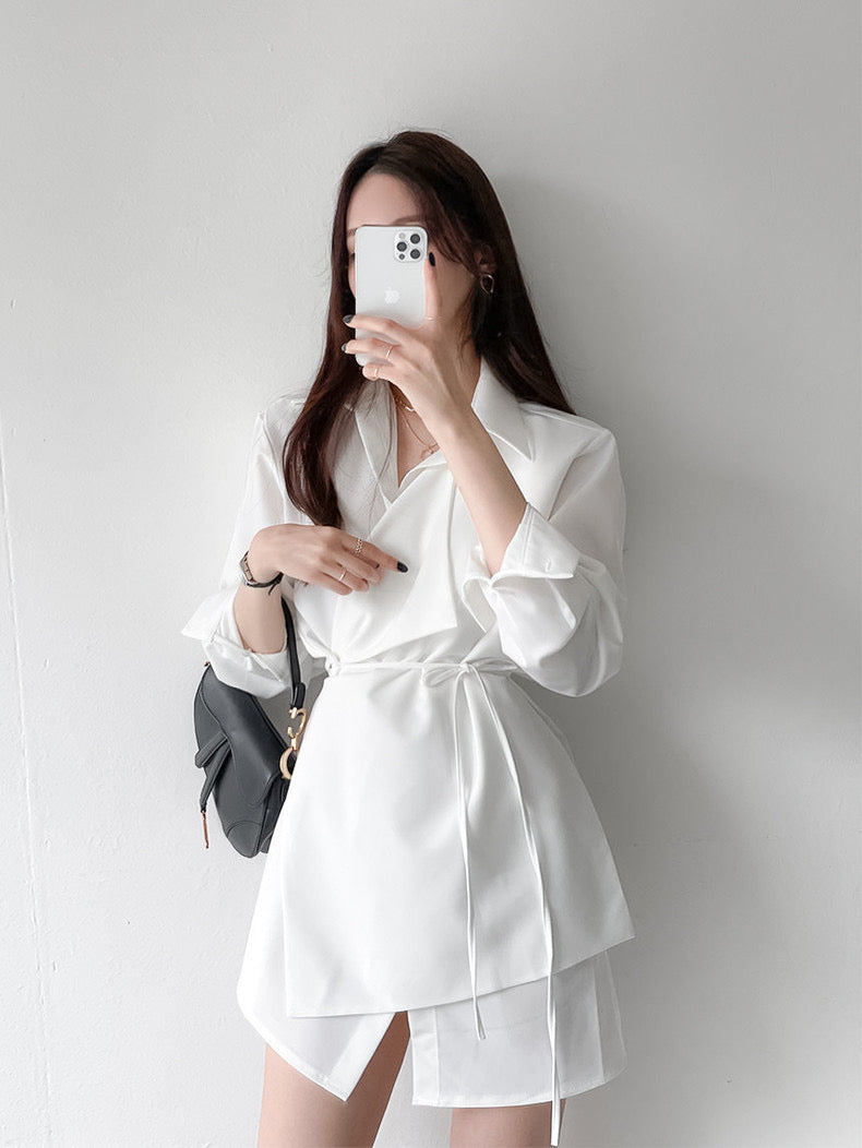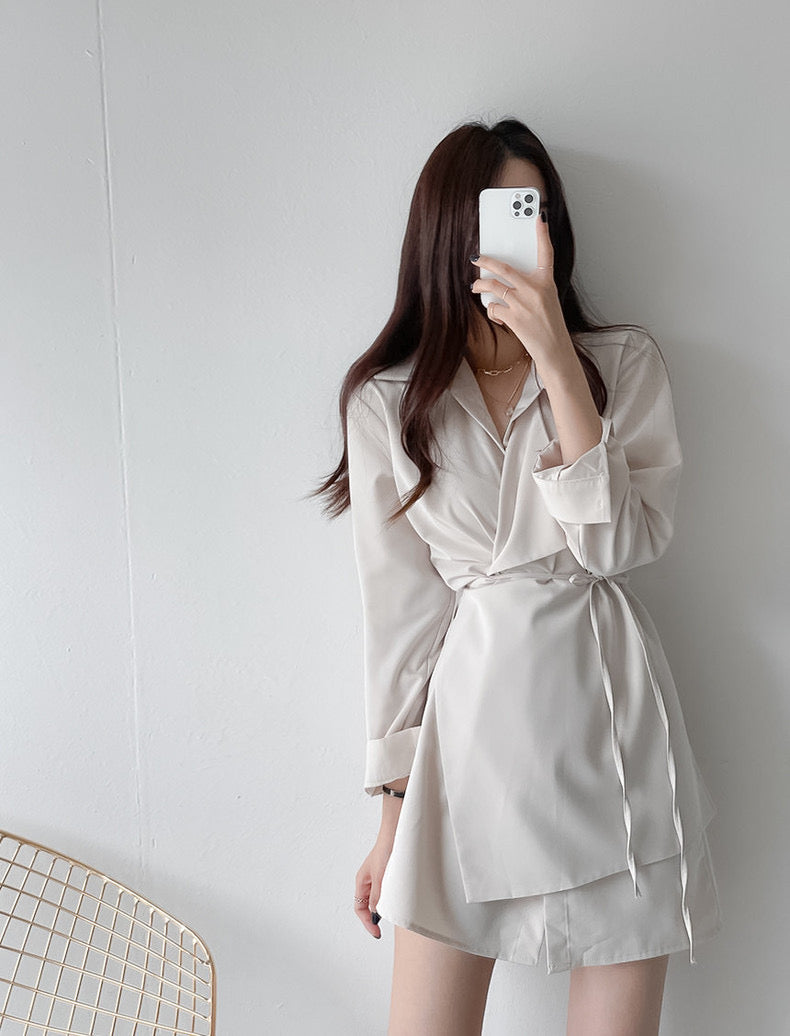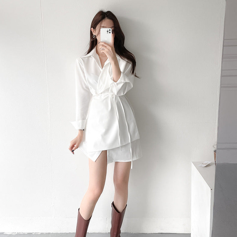 優雅翻領系帶不規則恤衫裙