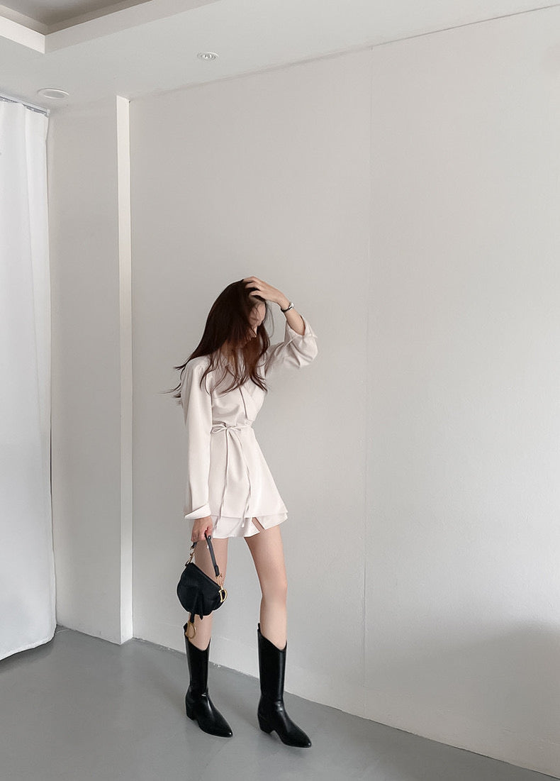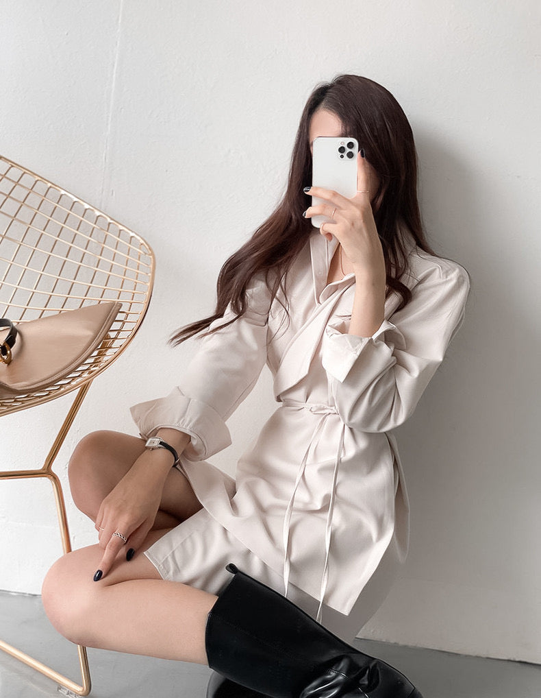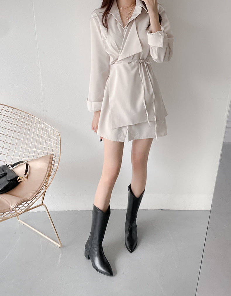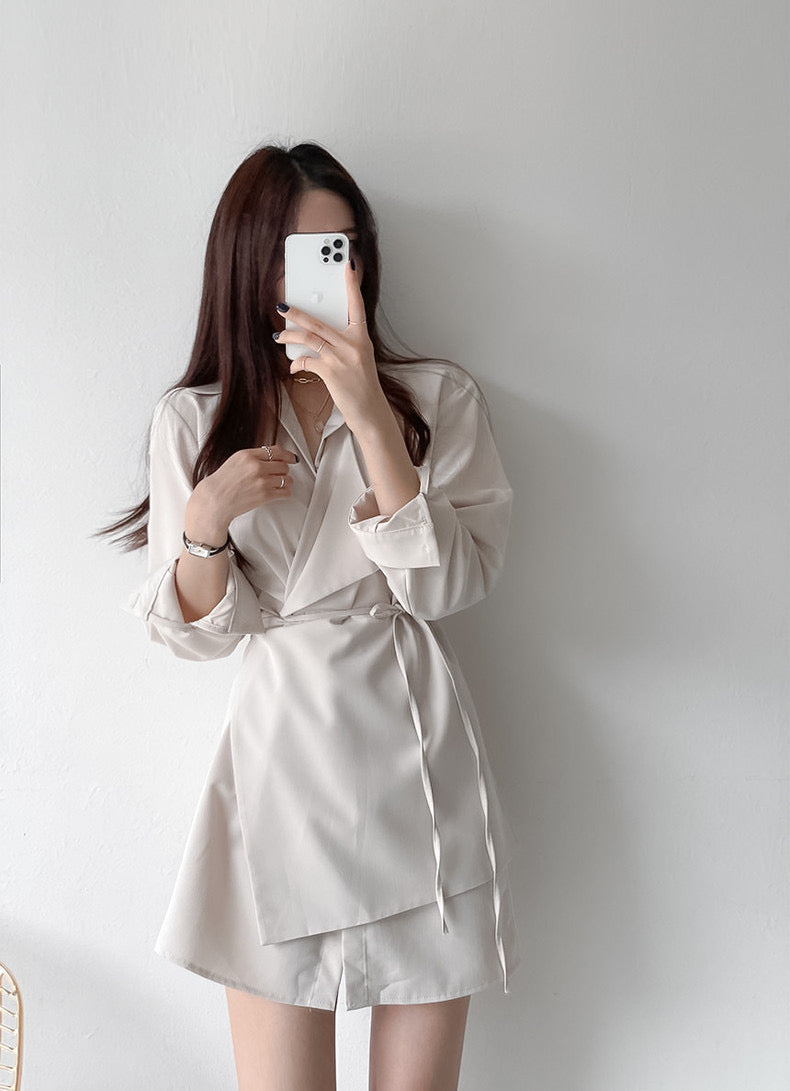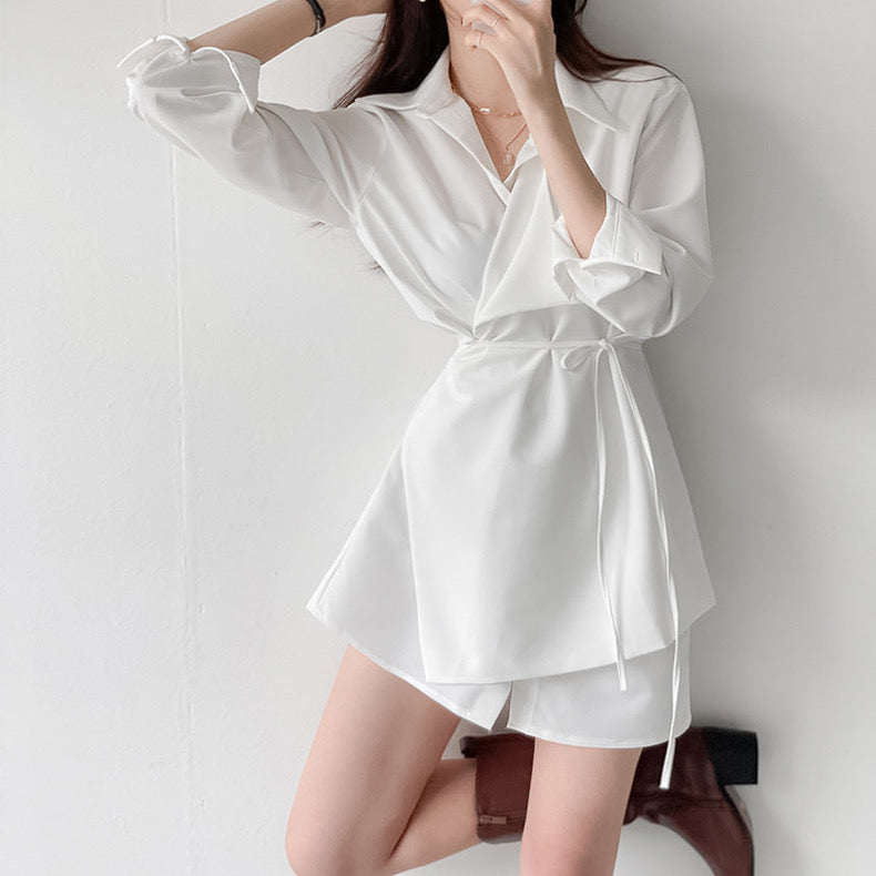 優雅翻領系帶不規則恤衫裙
