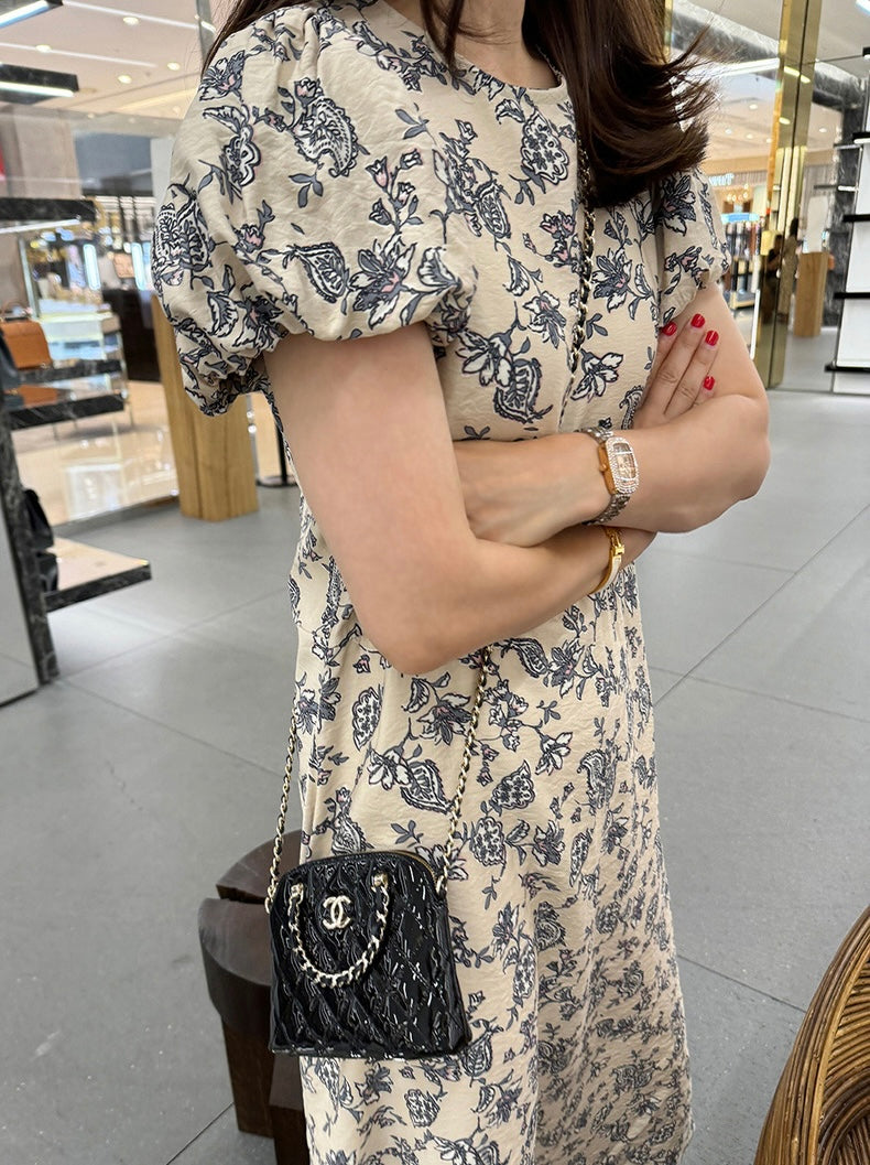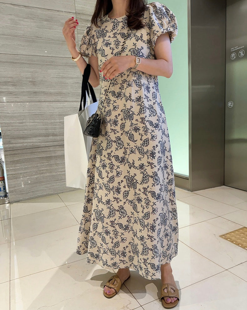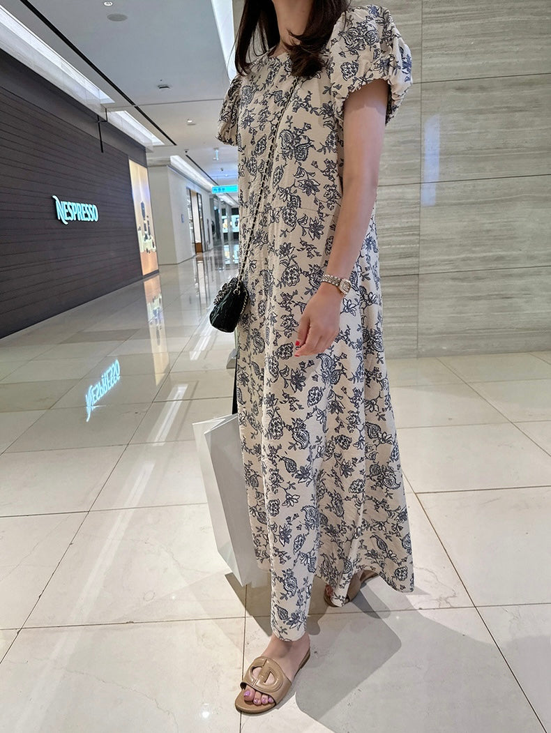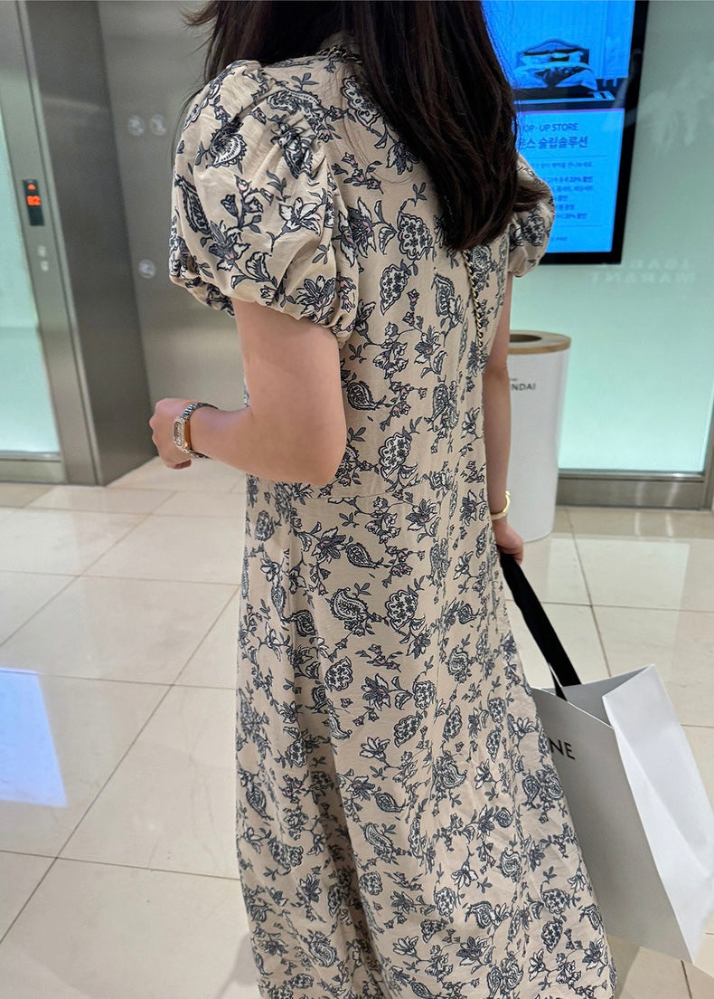 優雅印花A字泡泡袖連身裙