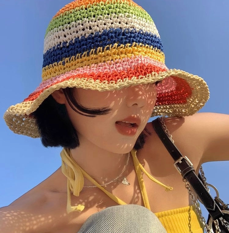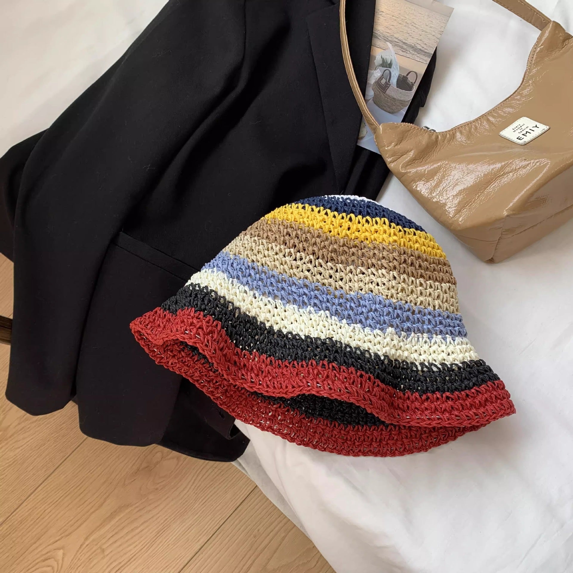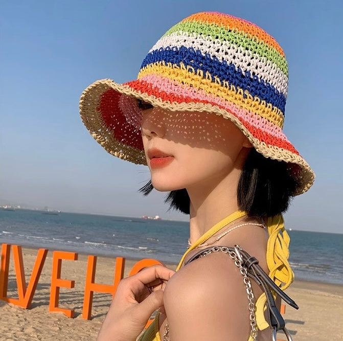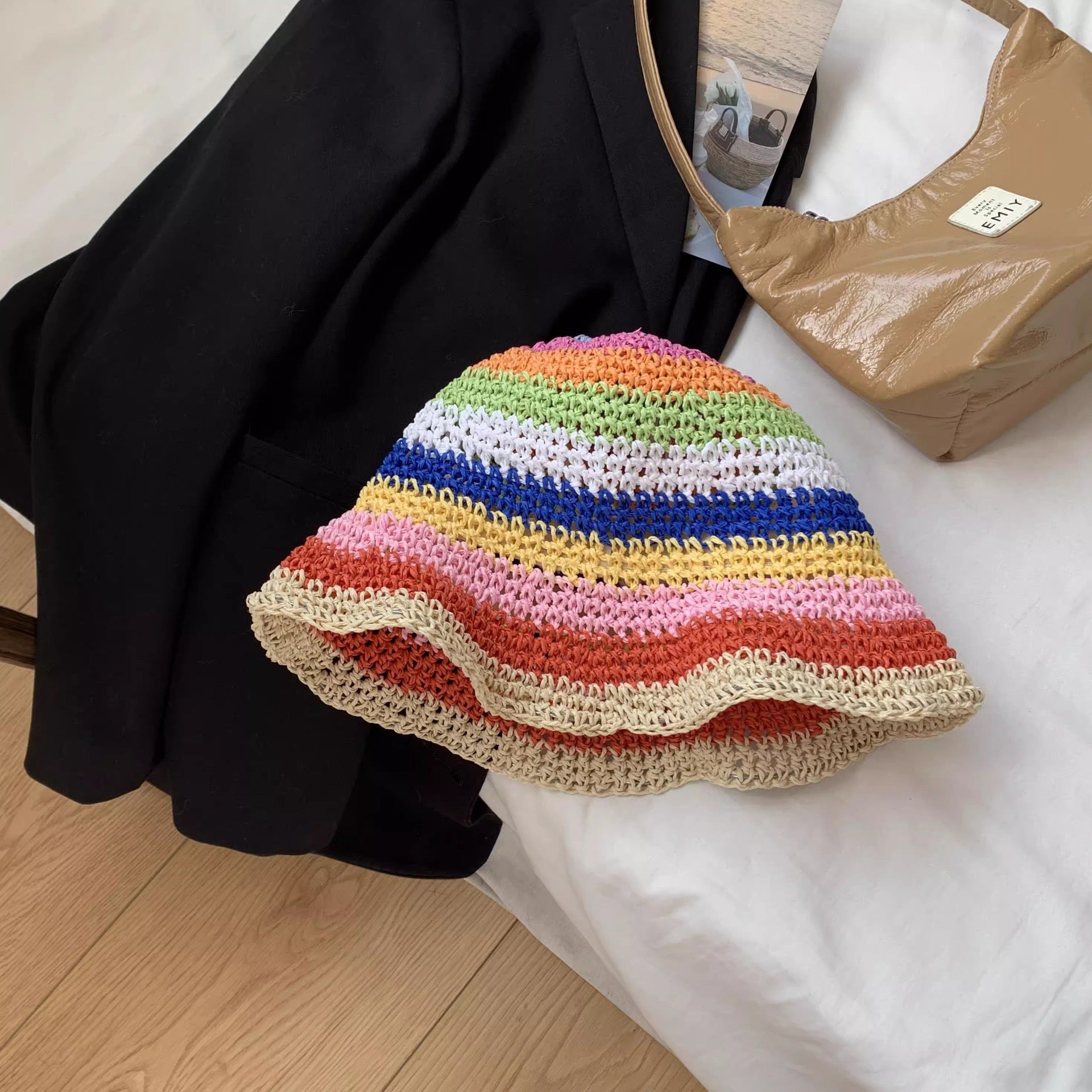 繽紛彩條太吸睛🌈輕盈草編材質透氣不悶大帽簷遮陽效果好沙灘出遊必備款