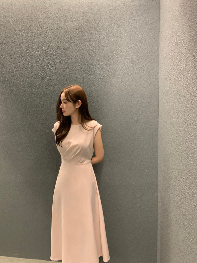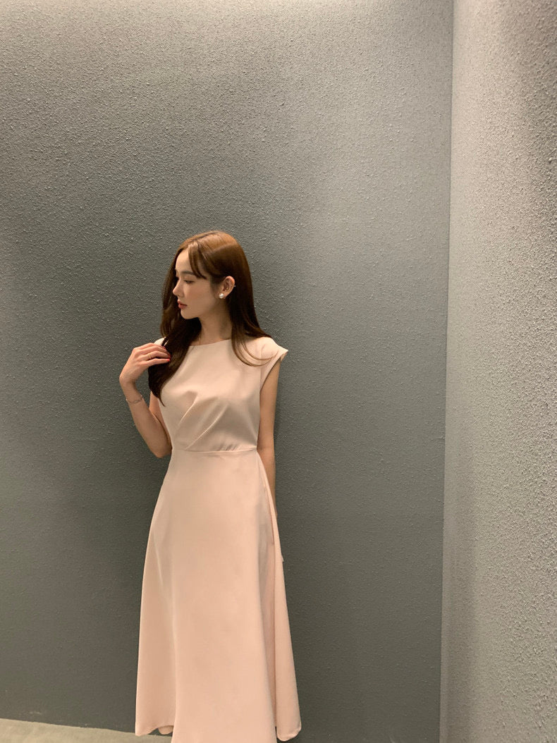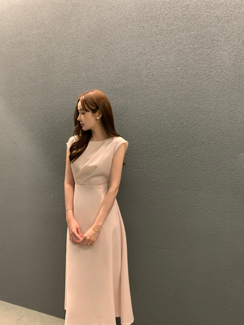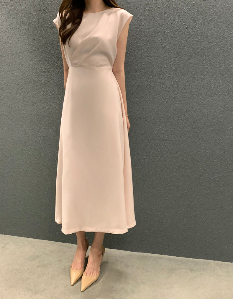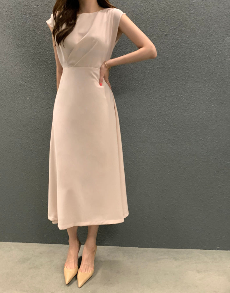 圓領壓褶收腰A字連身裙