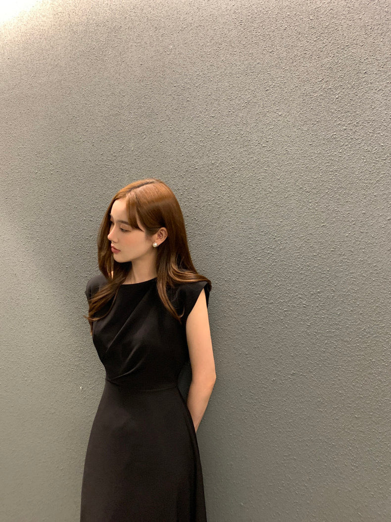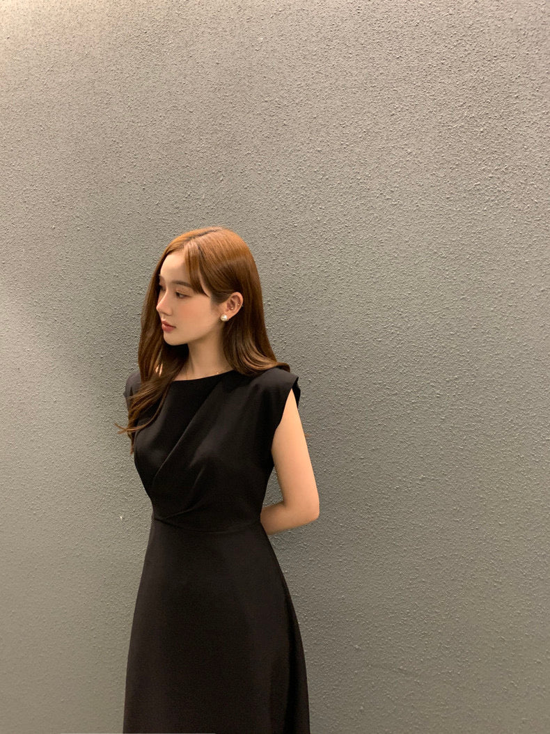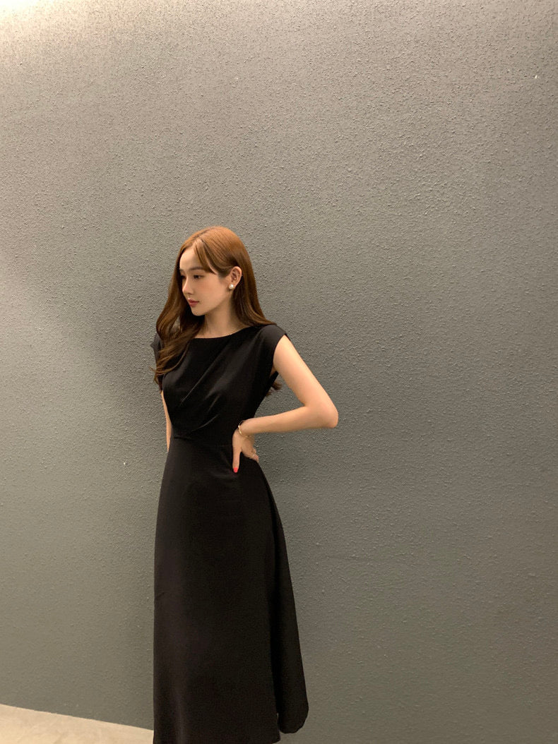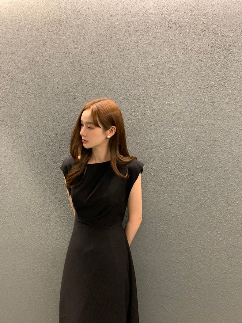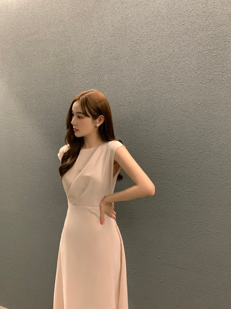 圓領壓褶收腰A字連身裙
