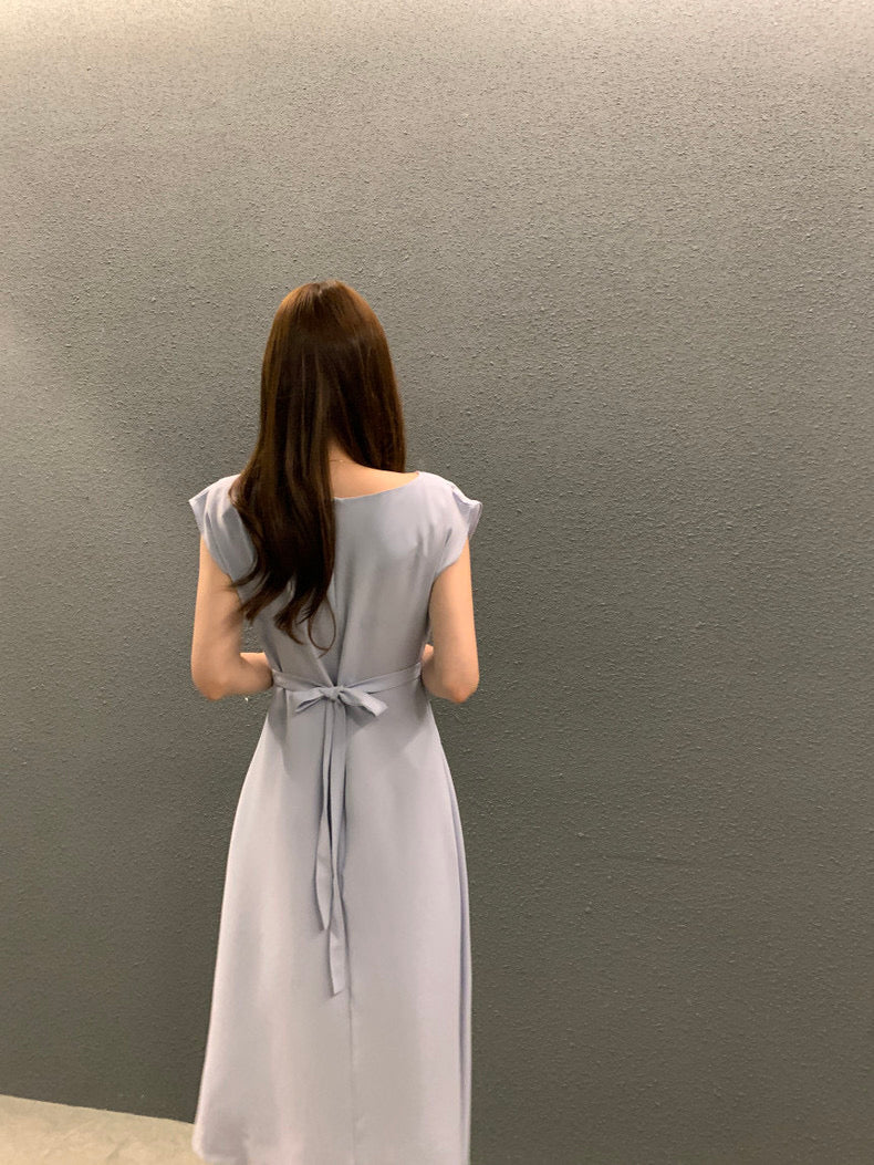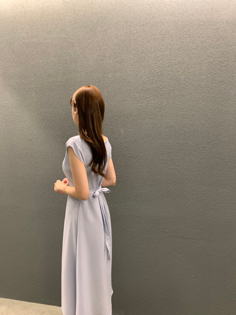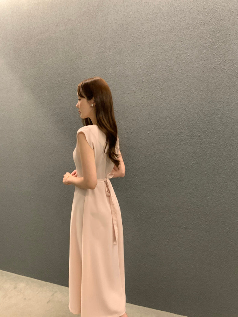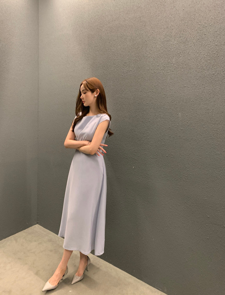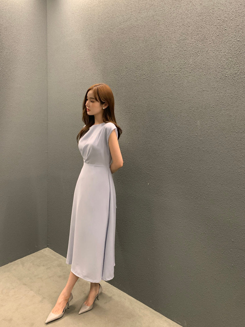 圓領壓褶收腰A字連身裙