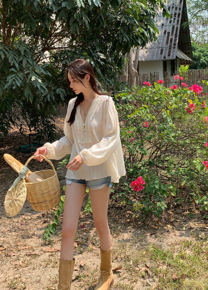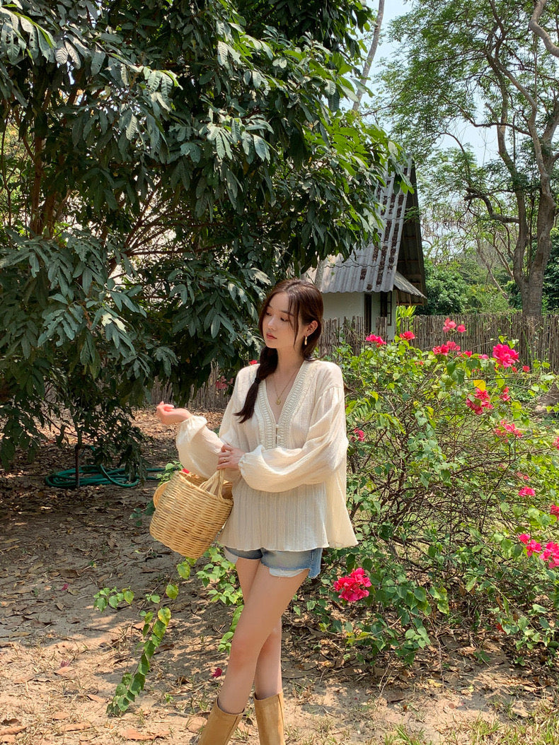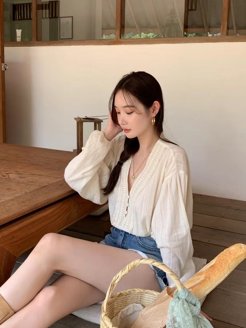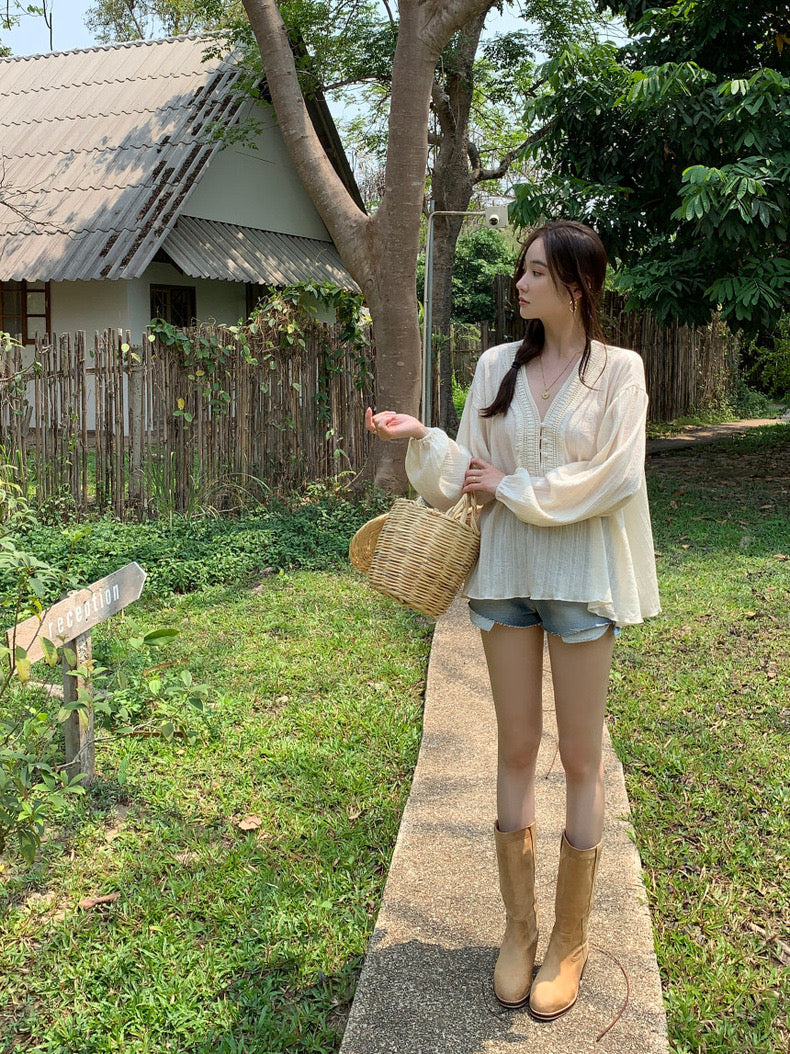 V領系扣泡泡袖恤衫