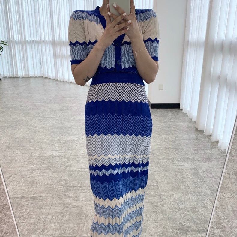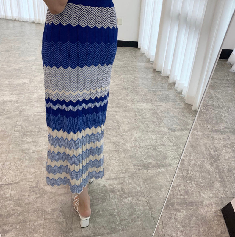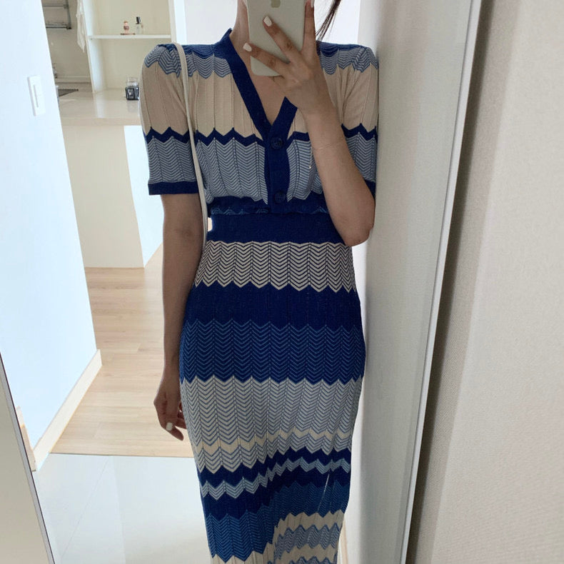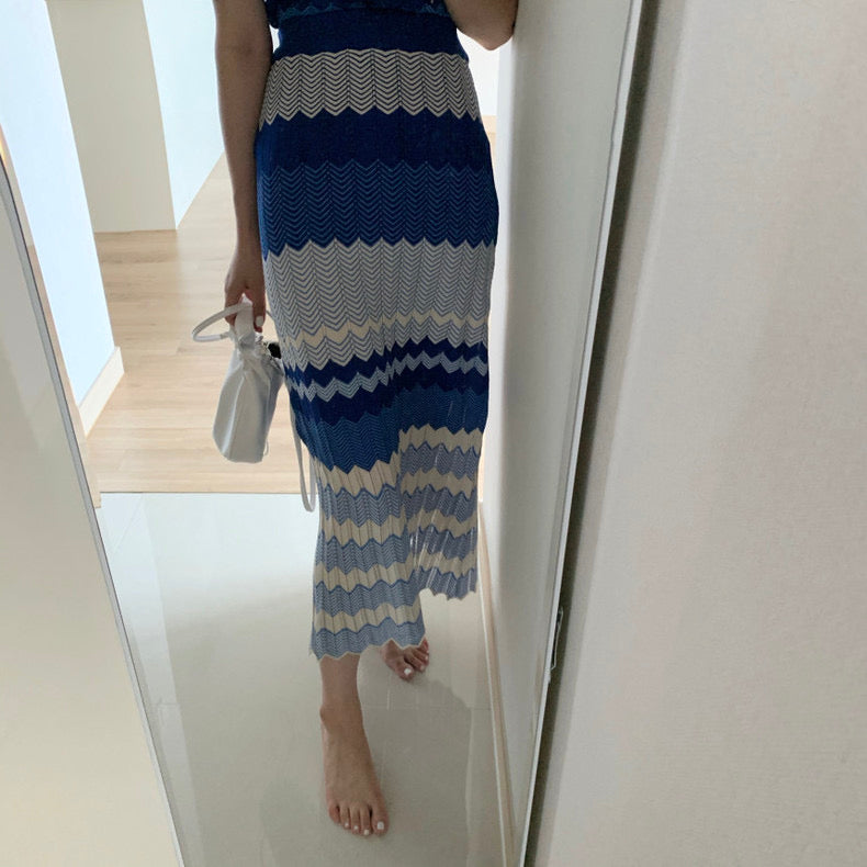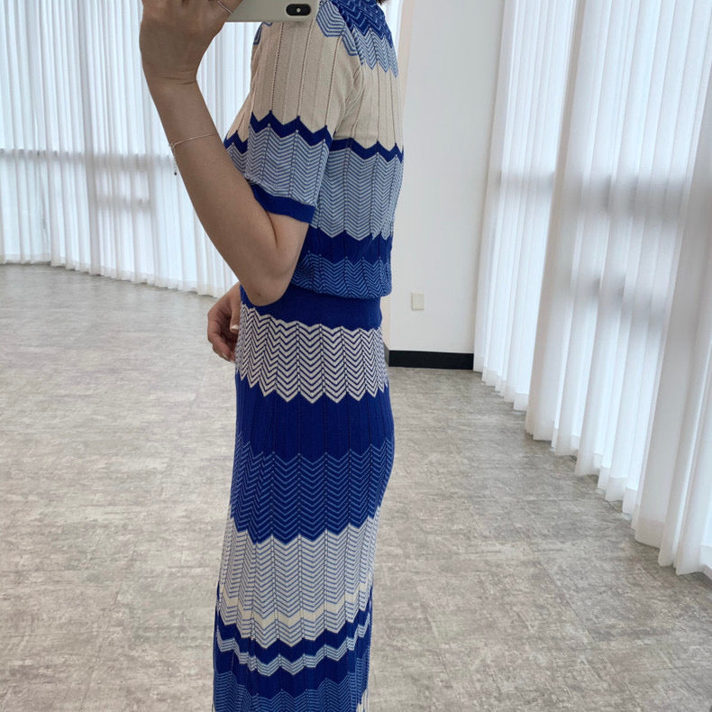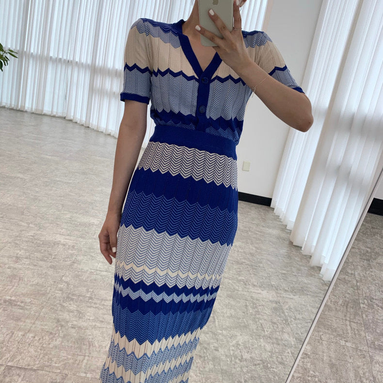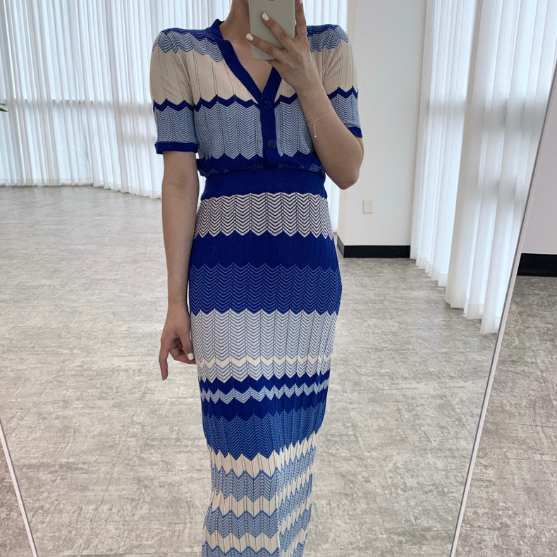 V領撞色波紋針織top+高腰修身包臀半身裙set