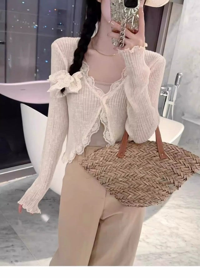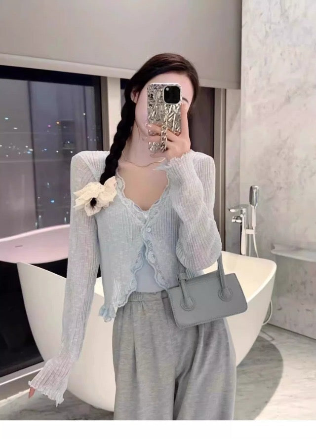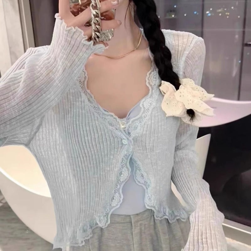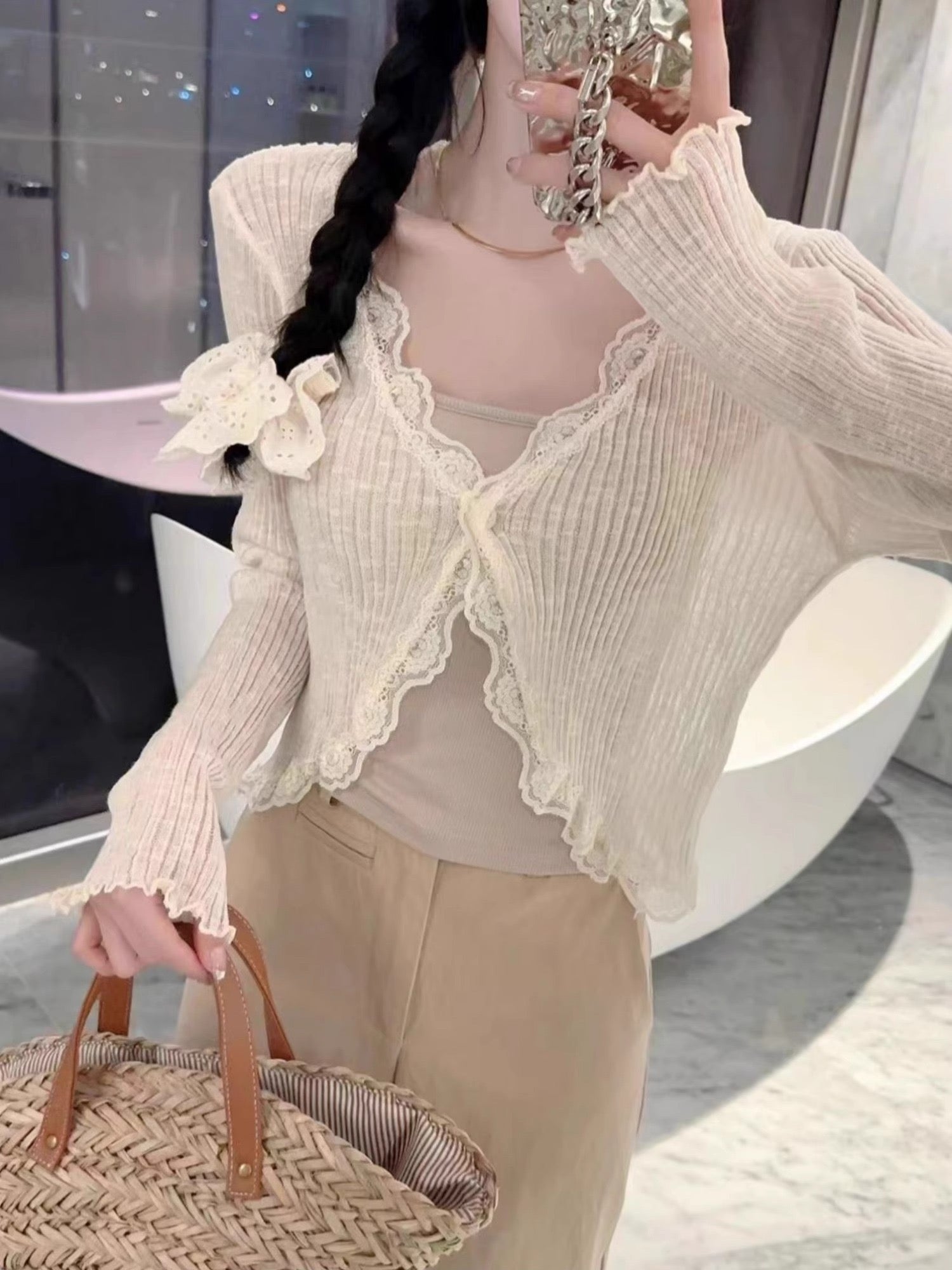 精緻蕾絲邊點綴優雅細節 ✨輕薄防曬面料抵禦紫外線V領設計修飾頸部線條夏日搭配清涼又時髦冰絲針織面料