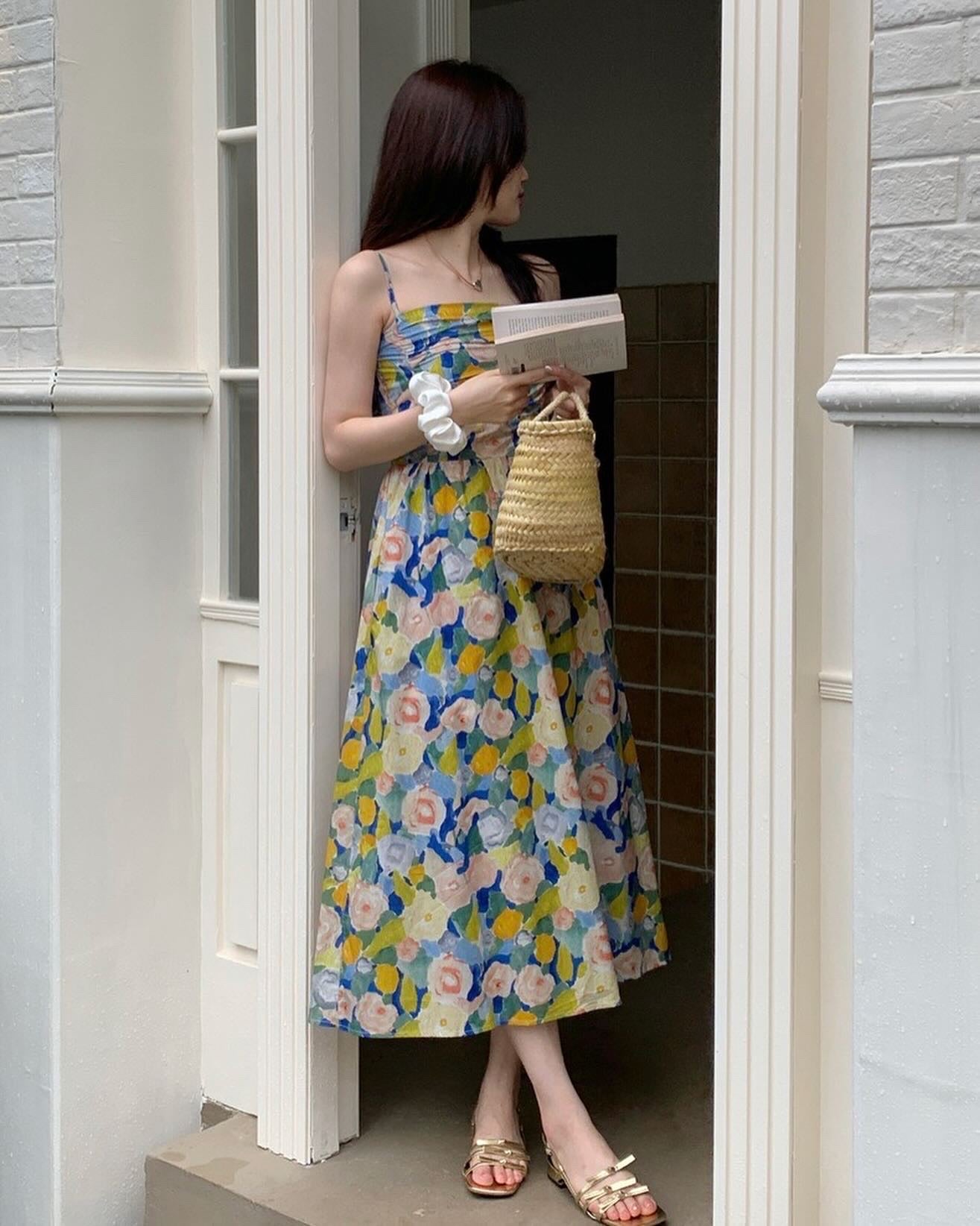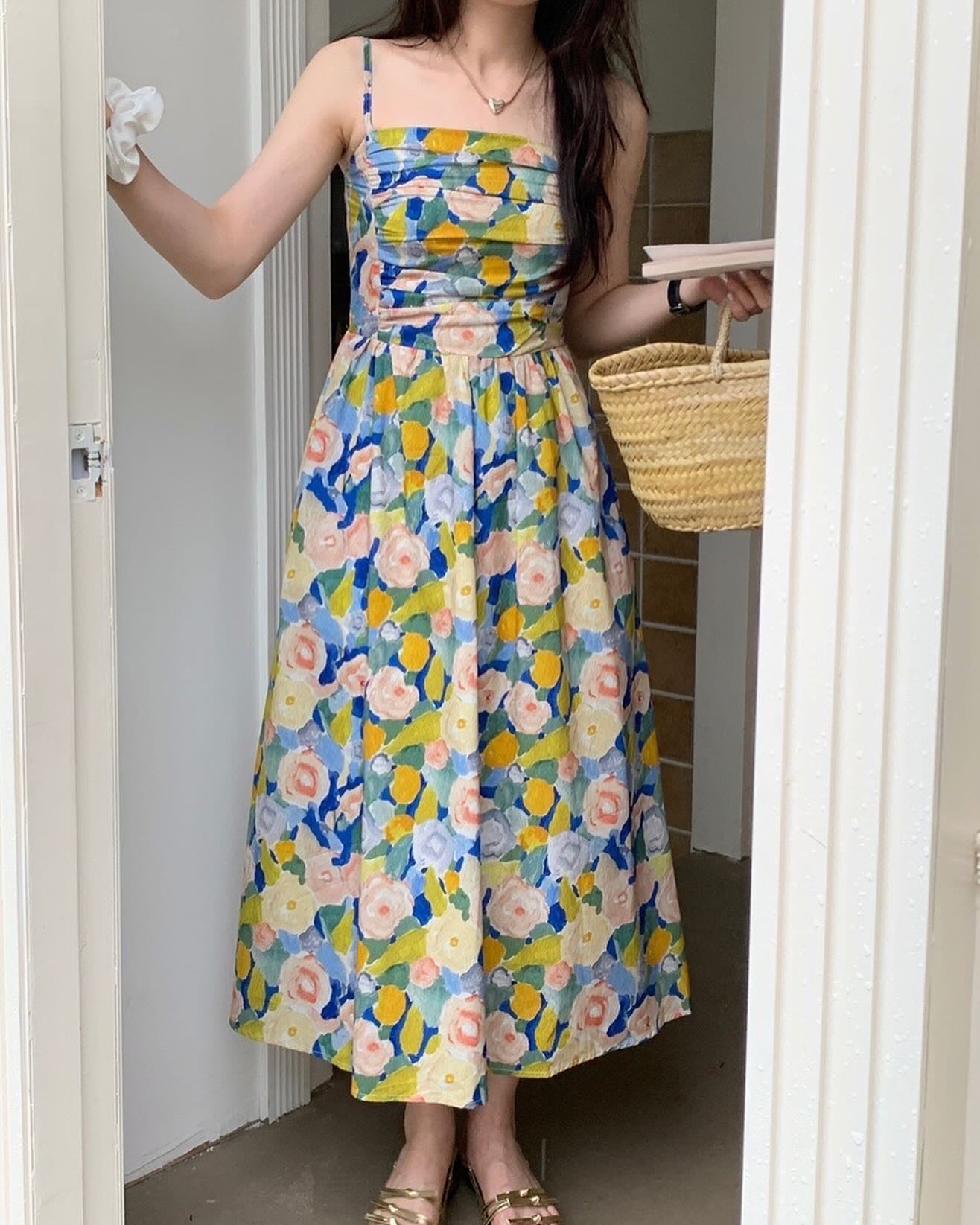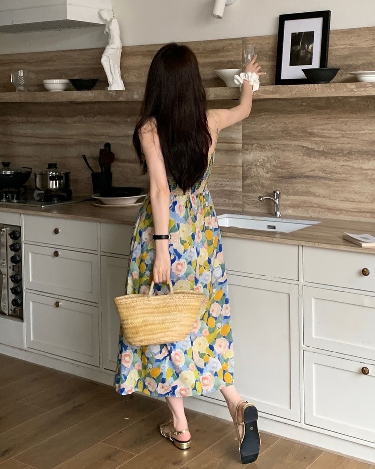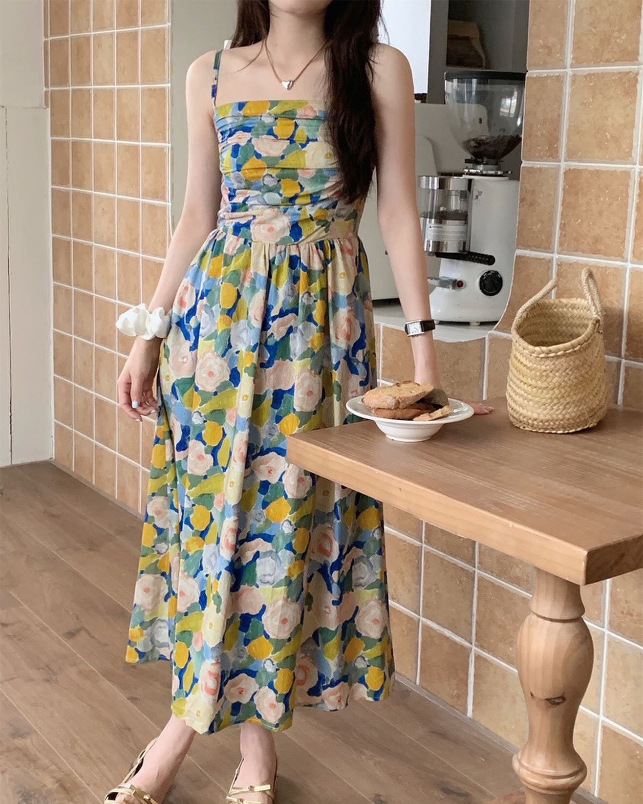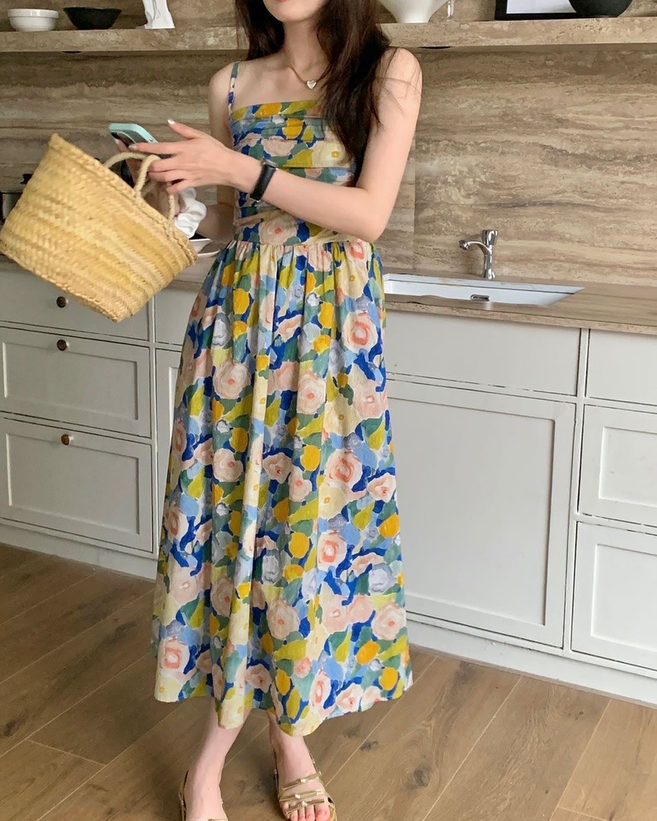 油畫印花吊帶連身裙