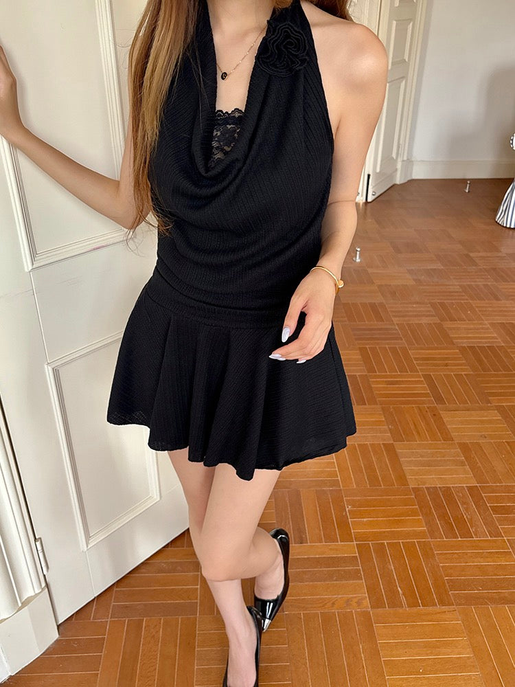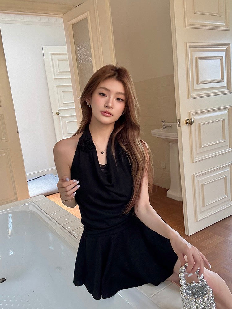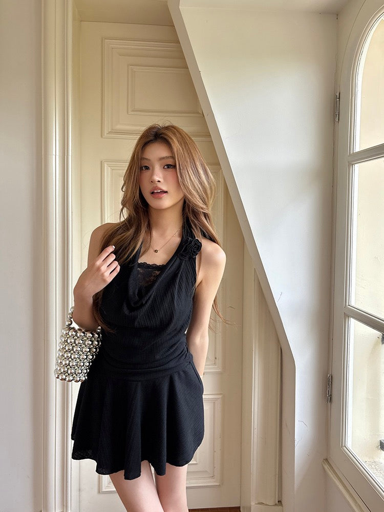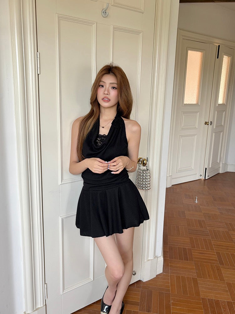 精緻蕾絲拼接設計😘假兩件風格增添層次感掛脖剪裁優雅迷人完美展現女性魅力混紡面料