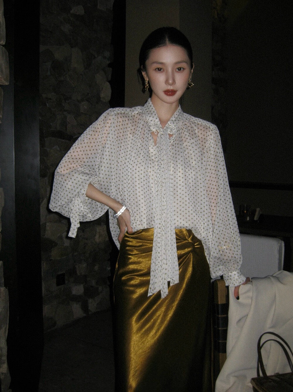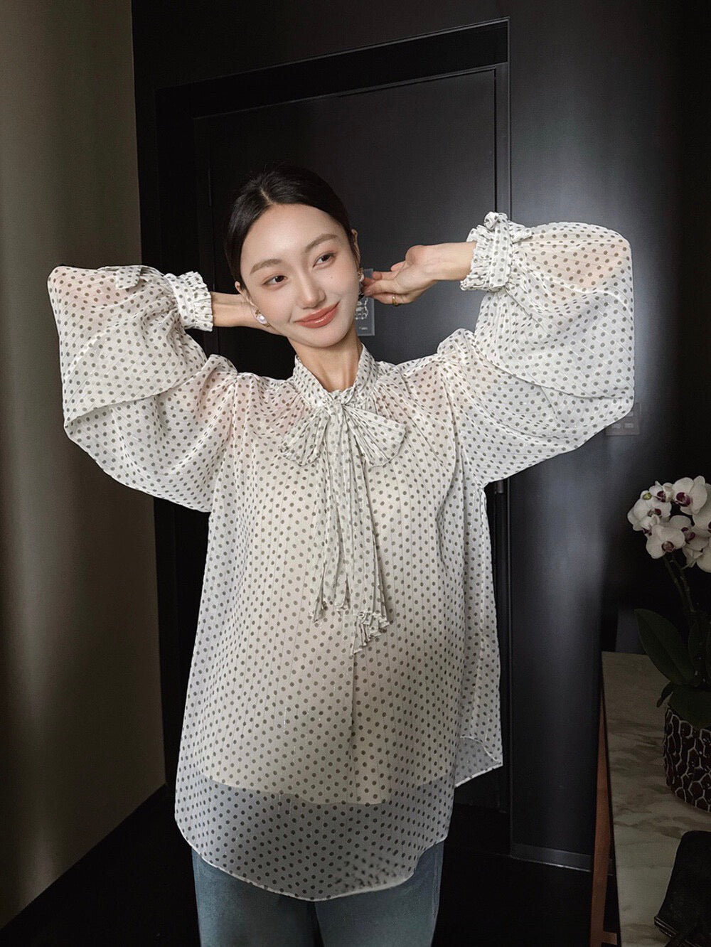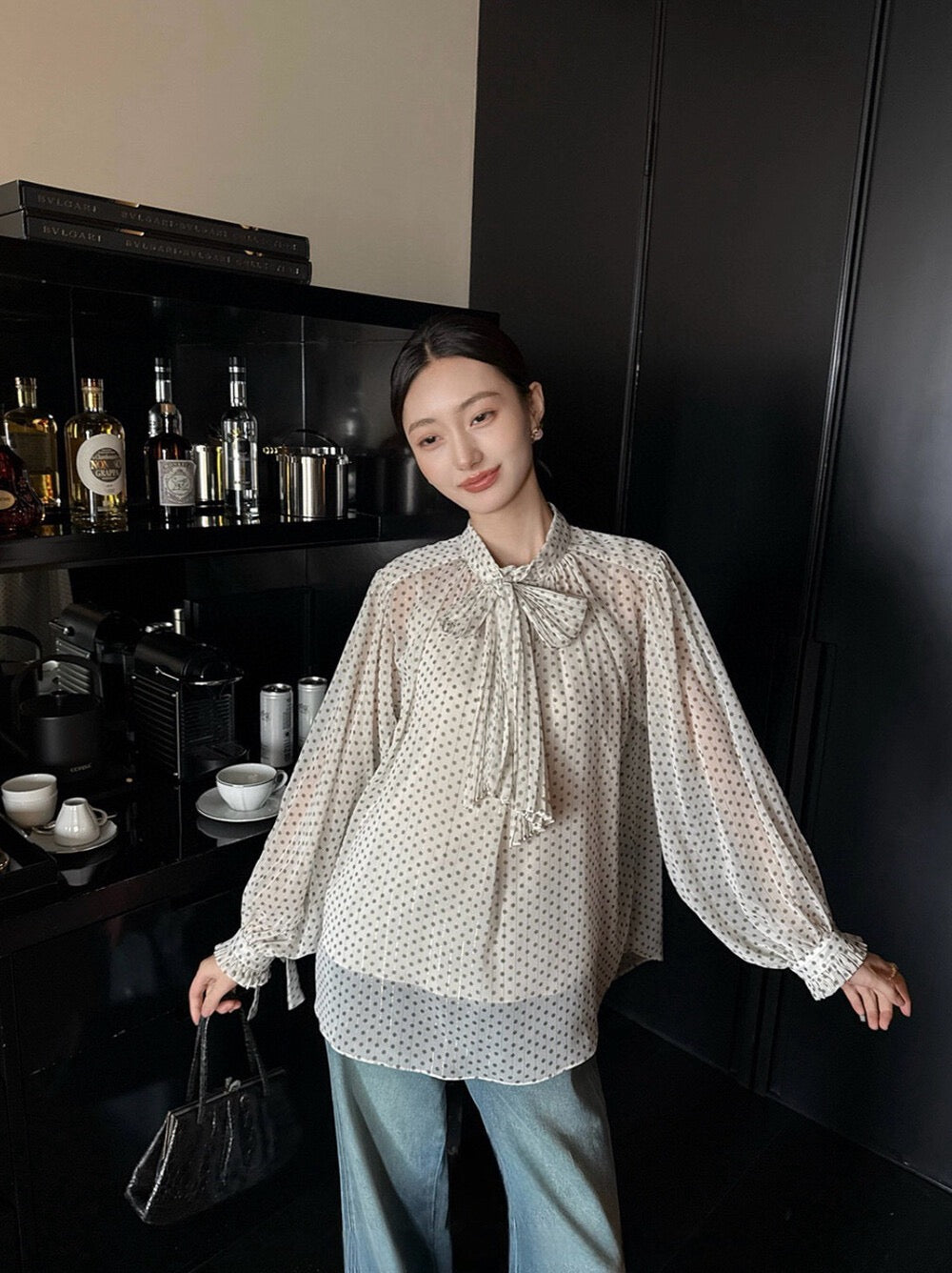 法式復古波點飄帶高級感顯瘦小衫