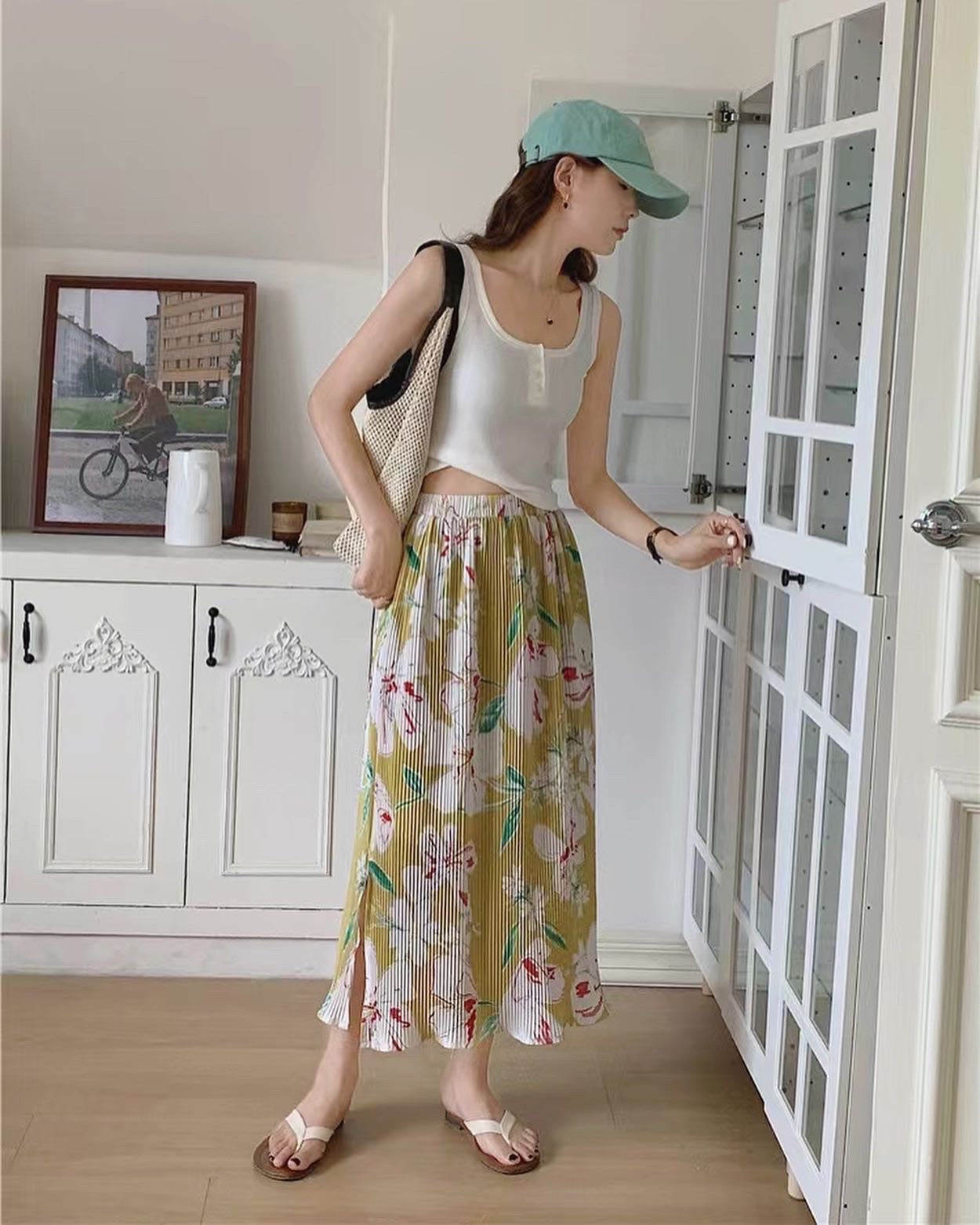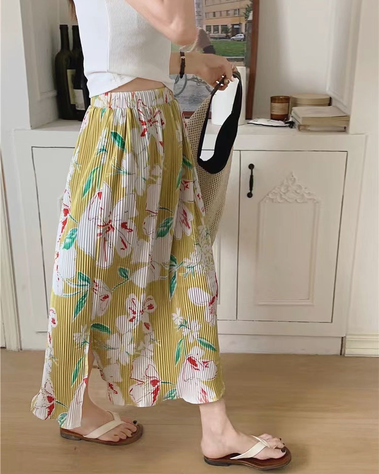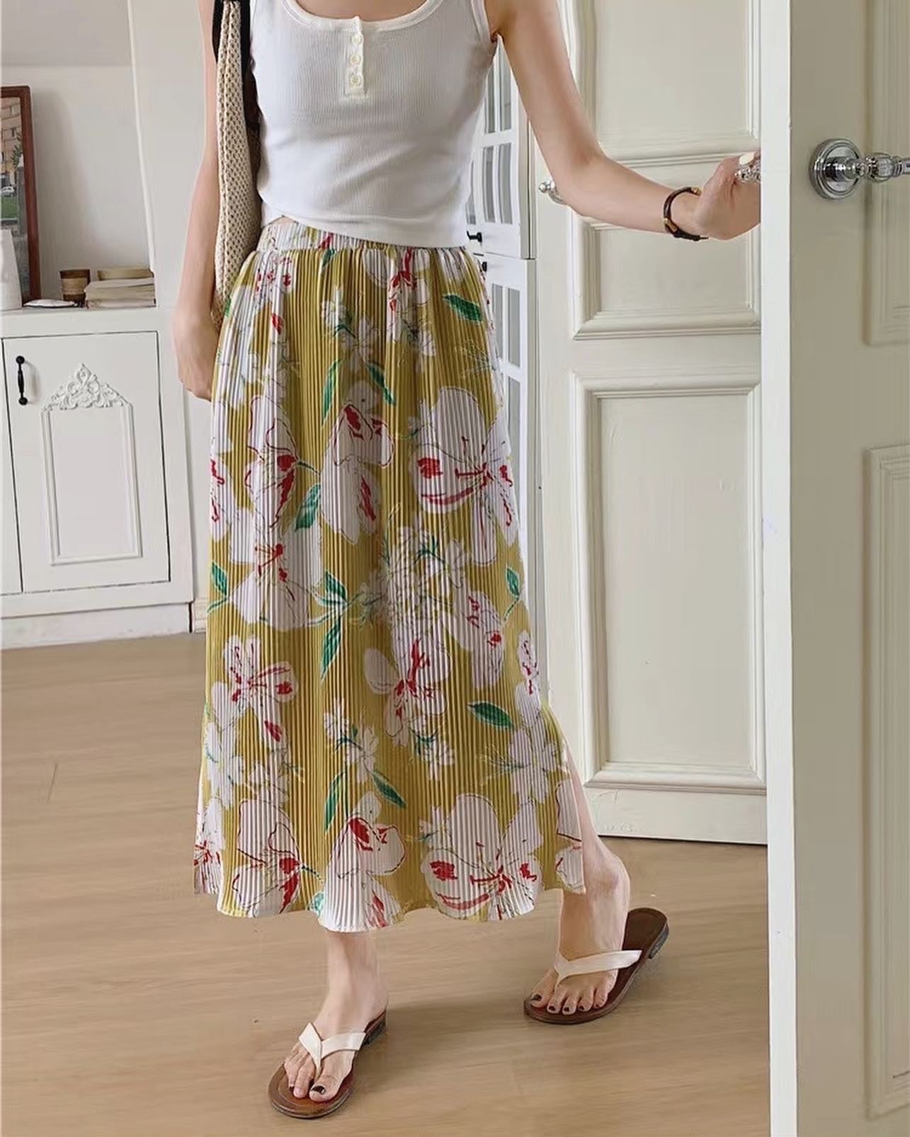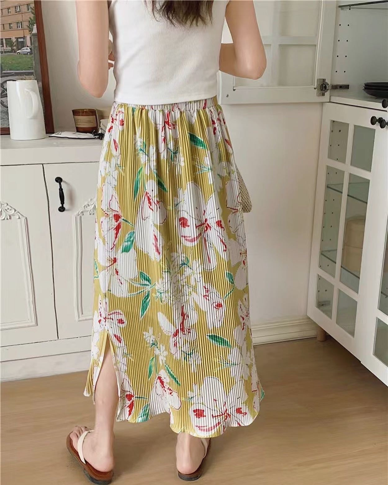 夏天必備的一條花花半身裙😊上面襯件白top已經好靚💕橡筋裙頭~彈性好好👍面料舒服柔軟聚酯纖維面料材質:100% 聚酯纖維Size:Free Size裙長:78cm