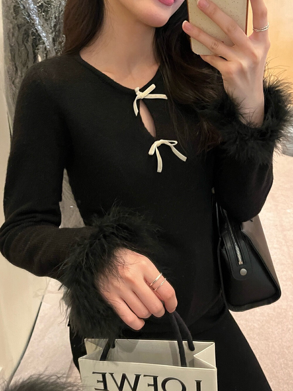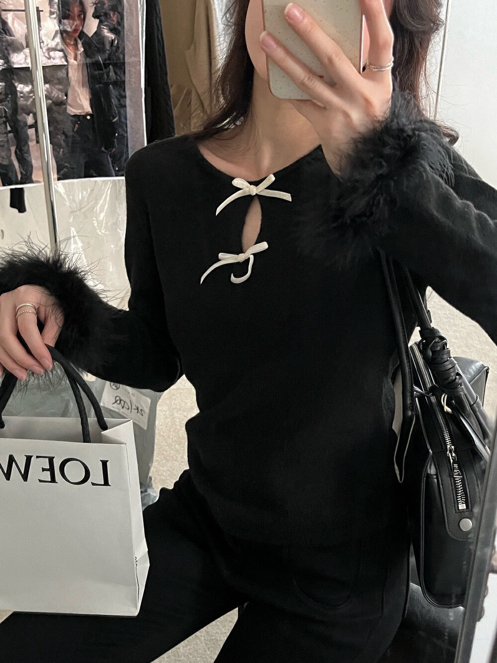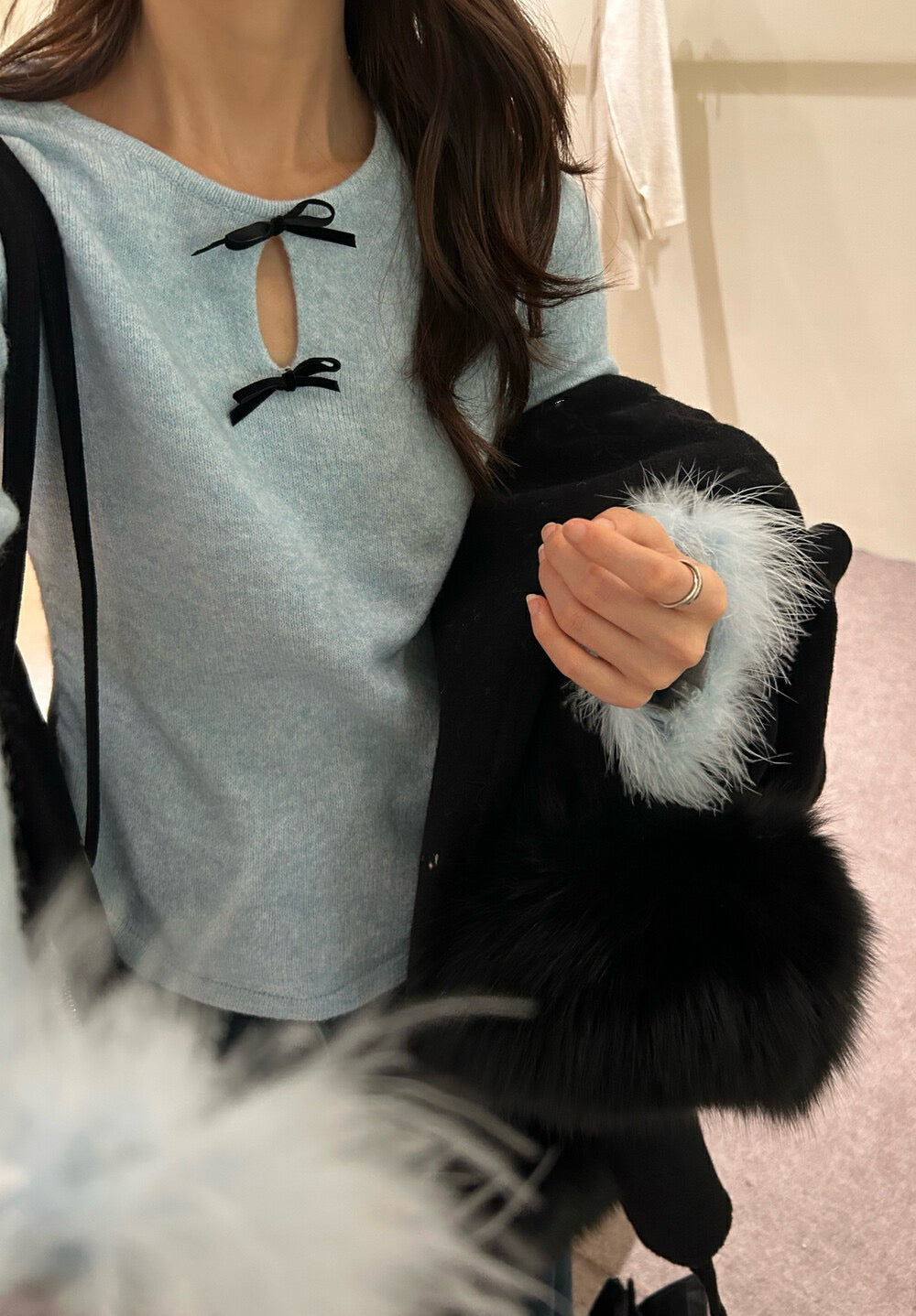 蝴蝶結毛毛袖針織top