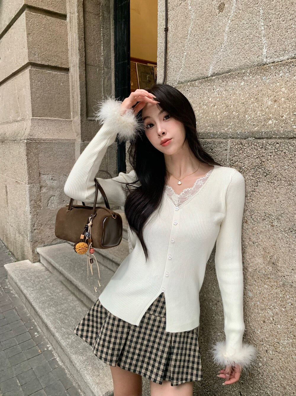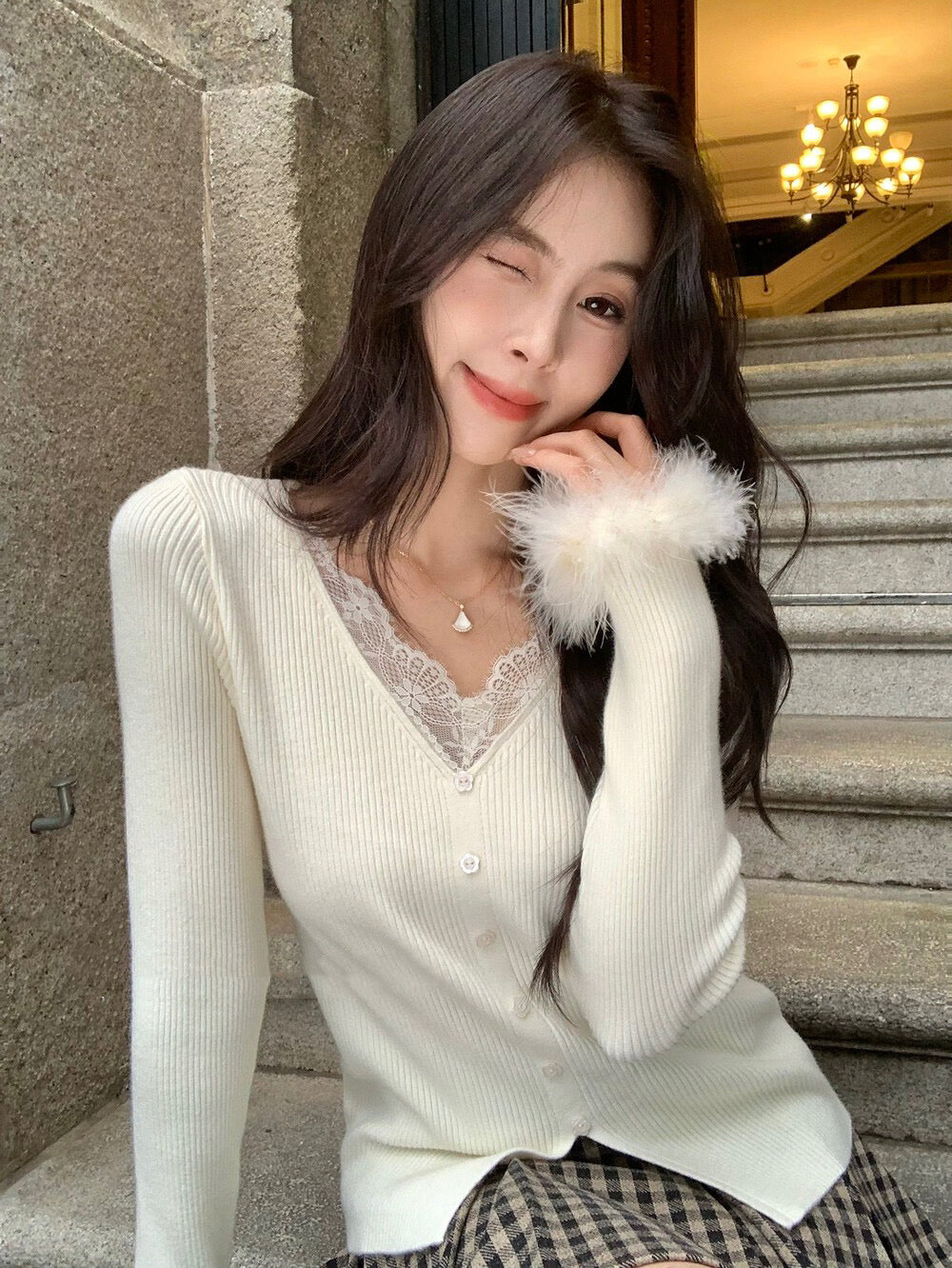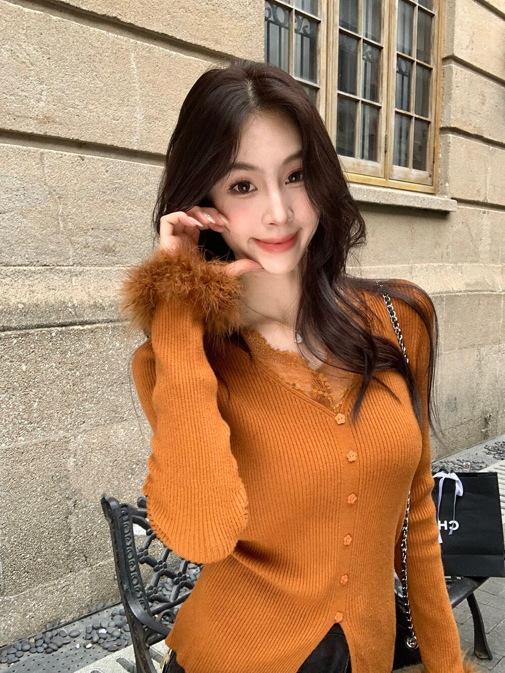 蕾絲V領精緻性感毛毛袖口溫暖可愛針織材質柔軟舒適輕鬆穿出甜美氣質針織面料
