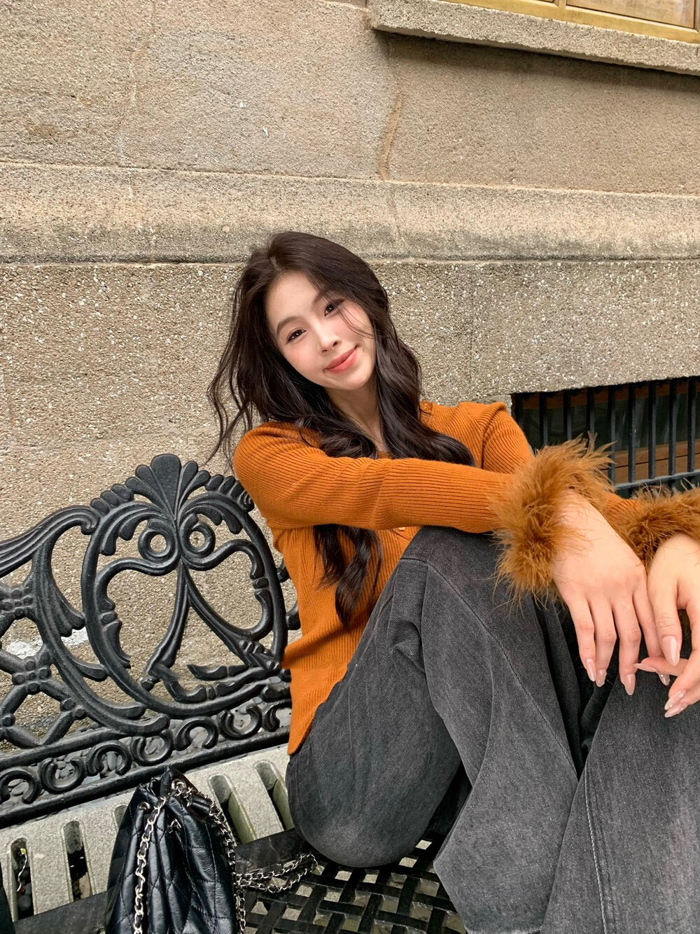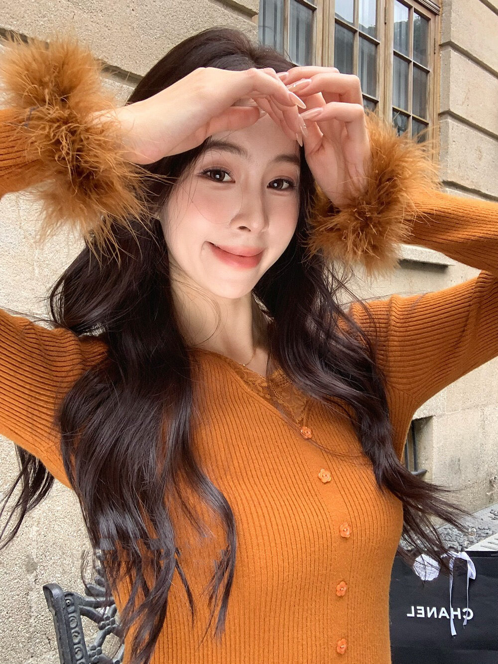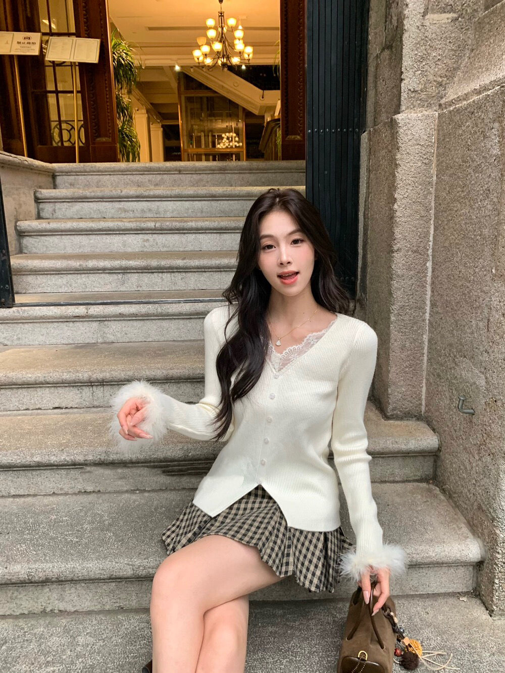 蕾絲V領精緻性感毛毛袖口溫暖可愛針織材質柔軟舒適輕鬆穿出甜美氣質針織面料