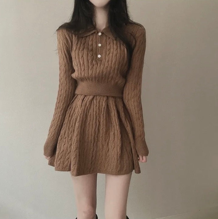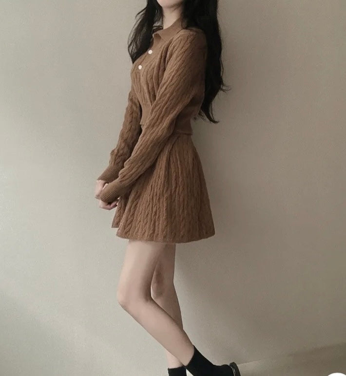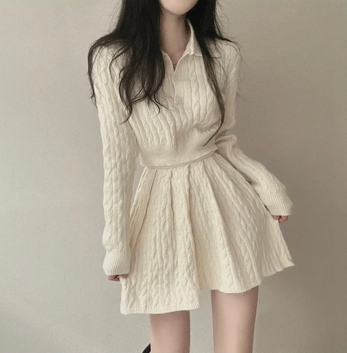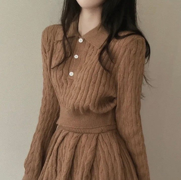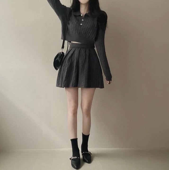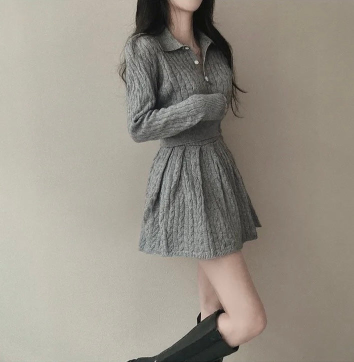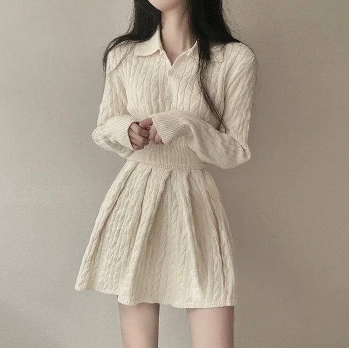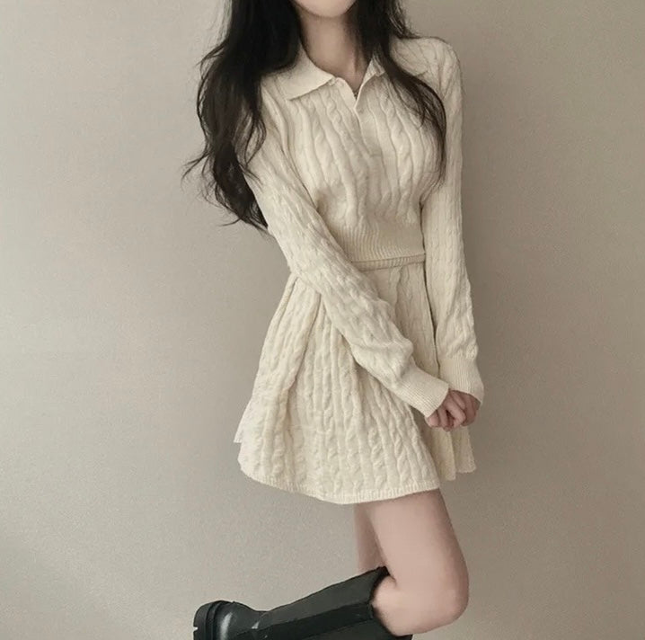 polo領麻花紋針織top+高腰壓褶半身裙set