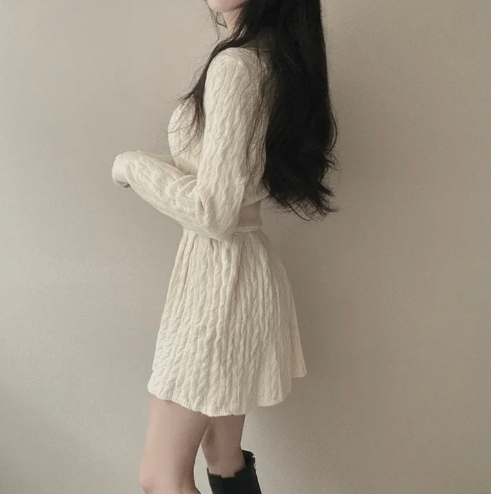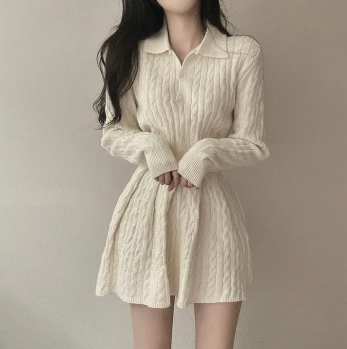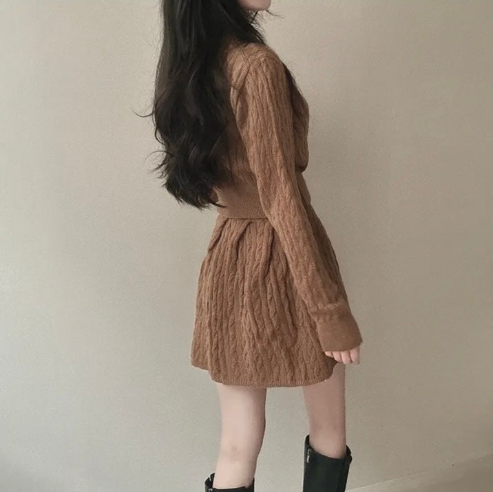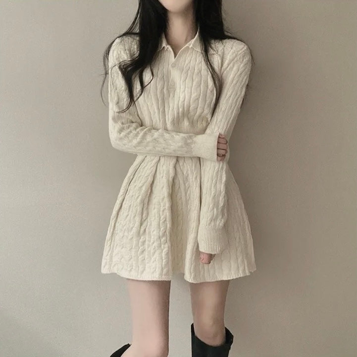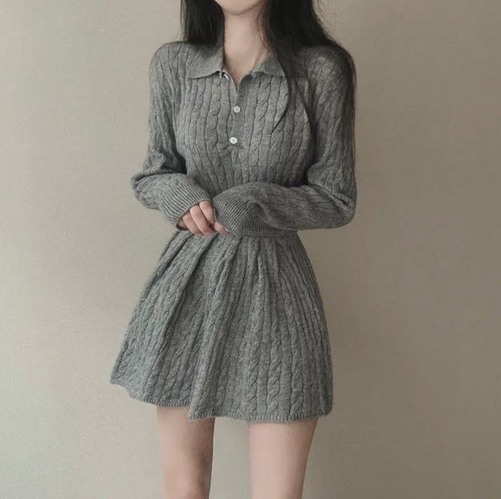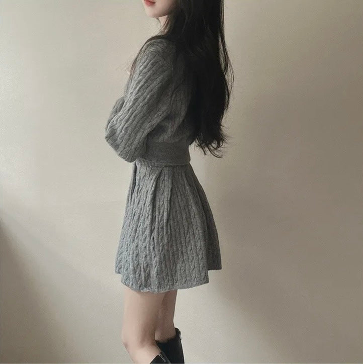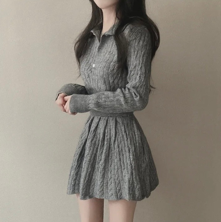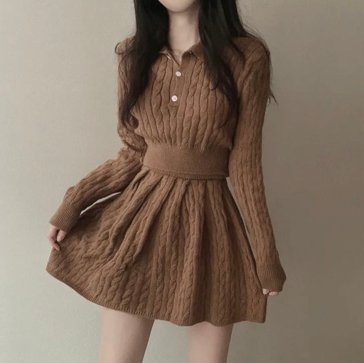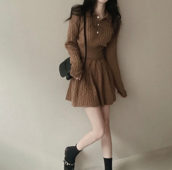 polo領麻花紋針織top+高腰壓褶半身裙set